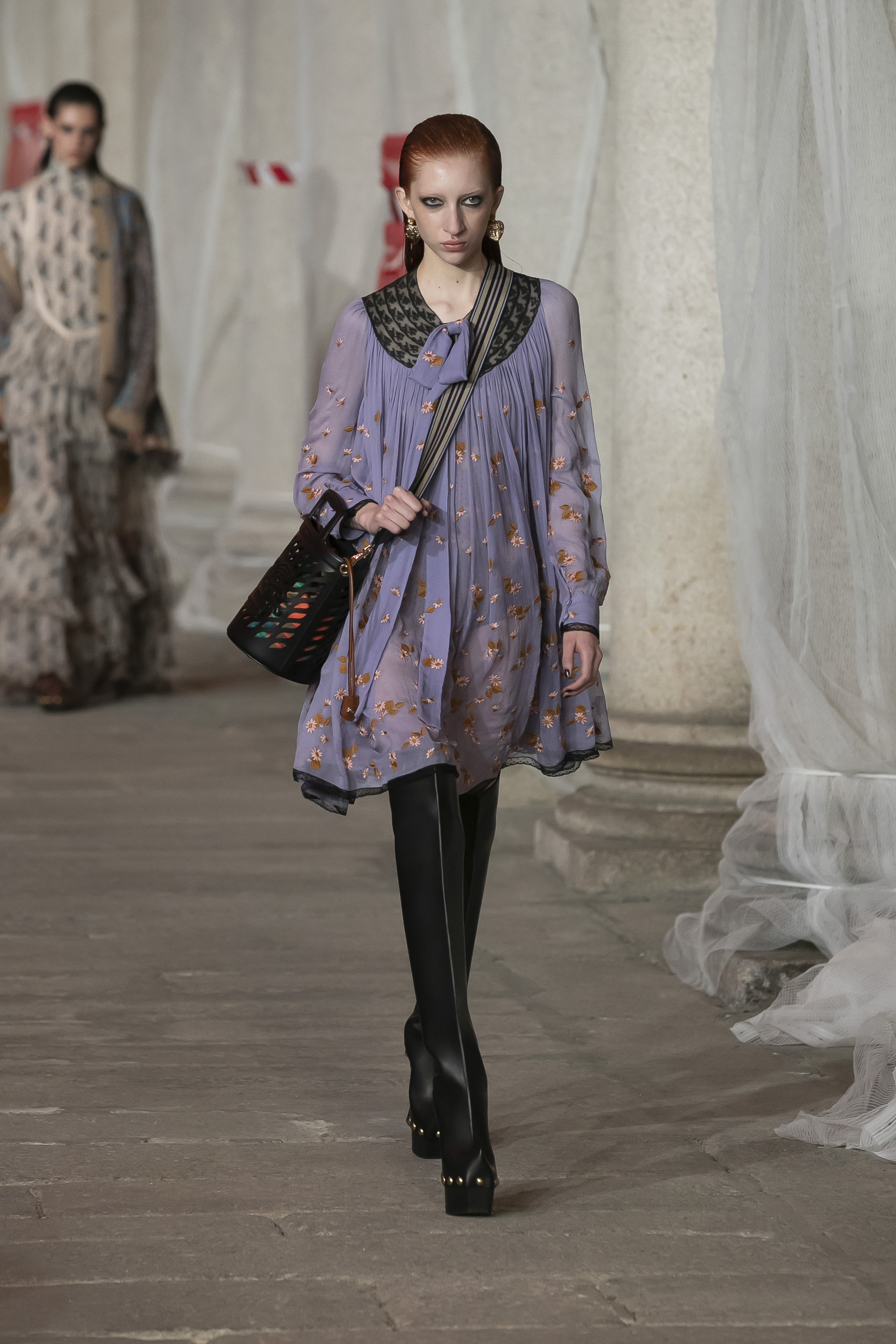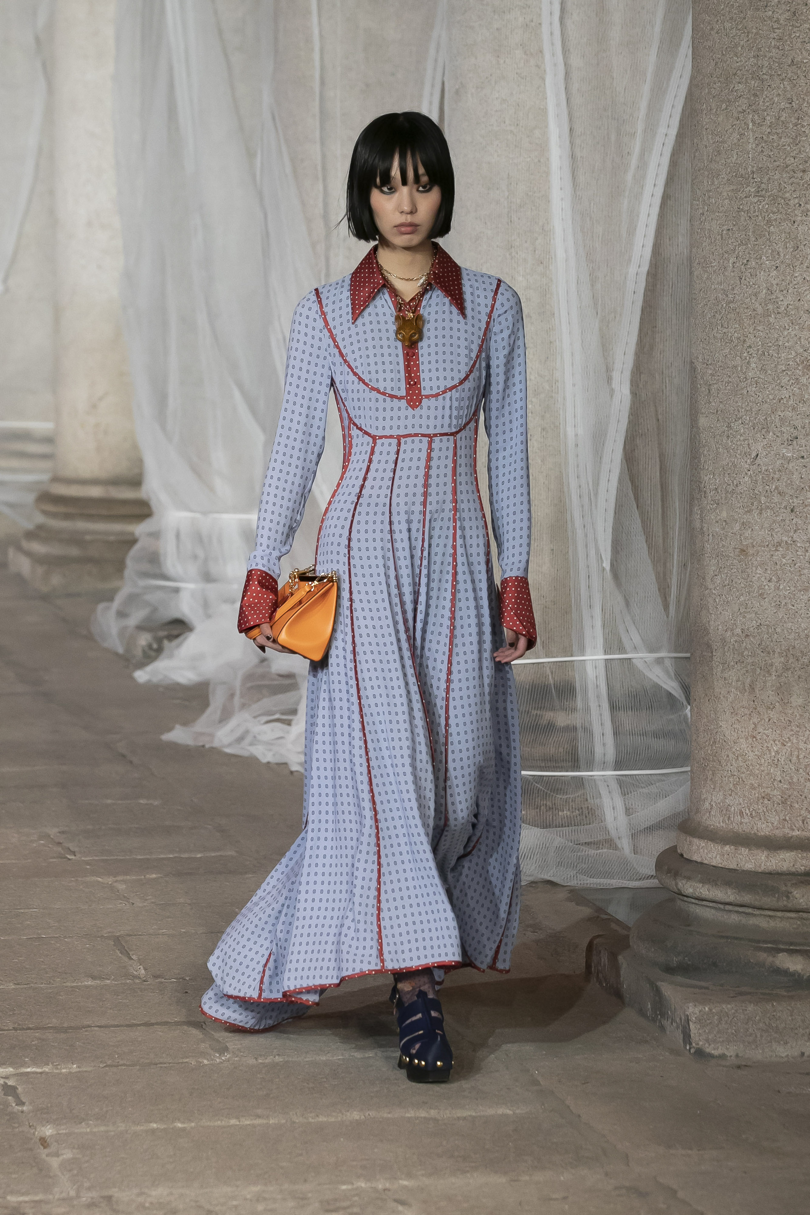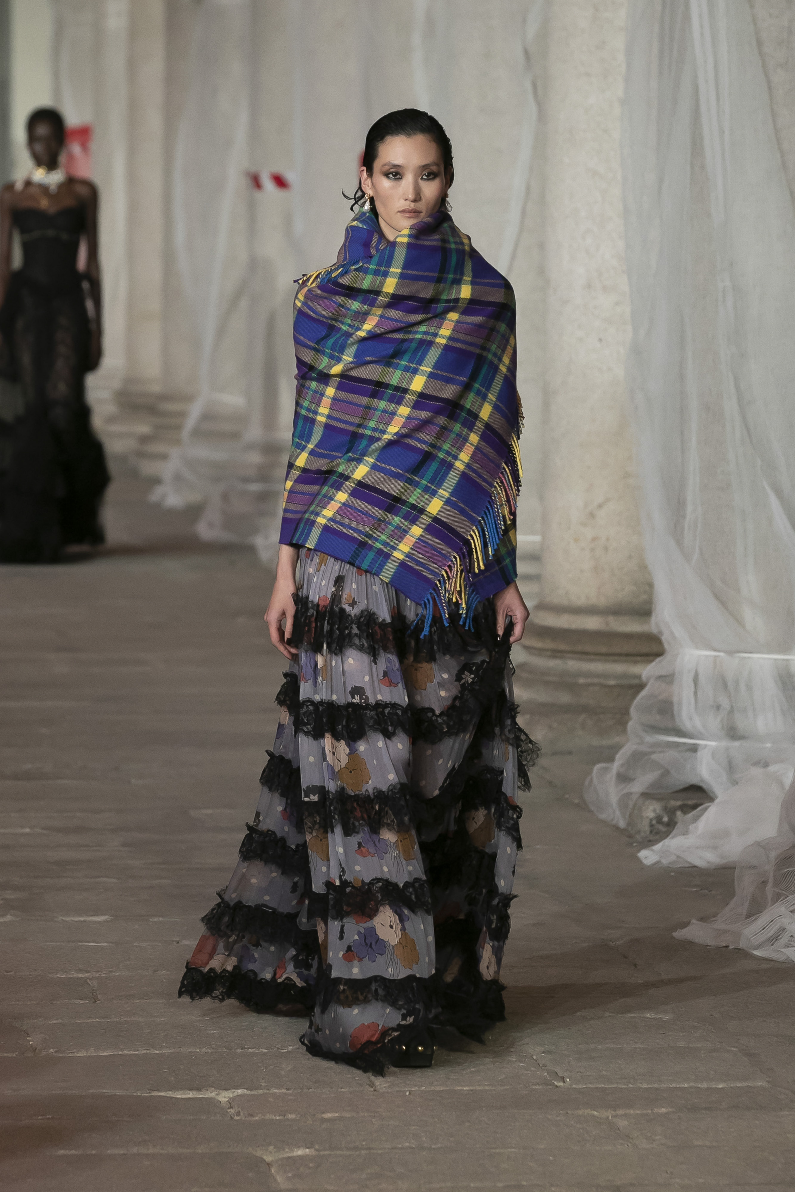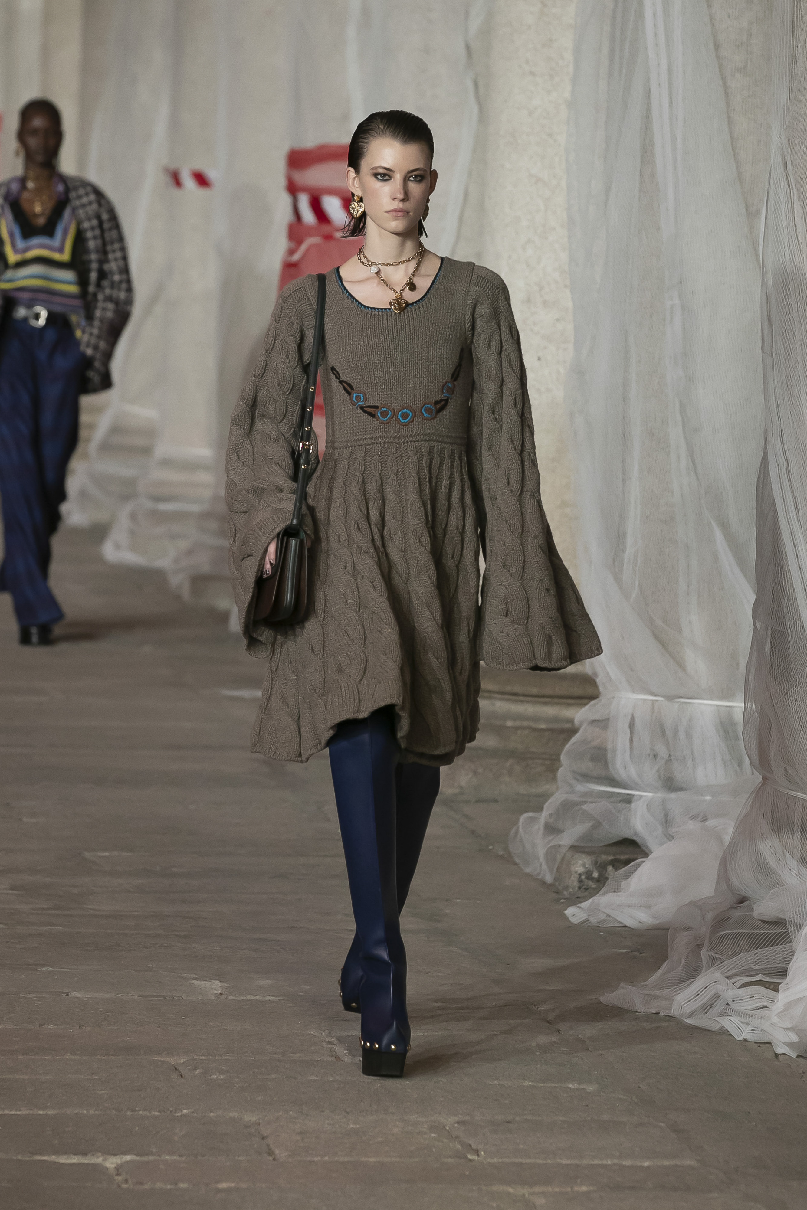 For sure, this choice is quite radical, which is exactly the spirit Marco De Vincenzo is after. Radical as a moment in history which coincides with the foundation of Etro in 1968. Radical, most of all, in the original sense of the word. The origin of radical, in fact, isn’t at all radical. Borrowed from Late Latin radicalis, it means root. The roots of Etro are in fabric and print: tartans, cravatteria motifs and, of course, paisley. All of it comes back today, framed by a new sense of precision, by a psychedelic proclivity for sharp cuts and the rhythm of patterns. Things come together instinctively, as long billowy dresses are paired with droopy, chunky knits, and androgynous trousers and vests are mingled with silk blouses. Tailoring is tall and precise, in opulent fabrications. Necktie motifs swarm on enveloping coats with contrast prints on the inside. Denim pants peek a boo, hinting, indeed, at a radical look. Etro being a whole world, elements of home furnishing are borrowed, with blankets wrapped on light dresses. Fringes dance along the hem of chunky polos and scarves, while applique gives argyle knit a three-dimensional charm.
