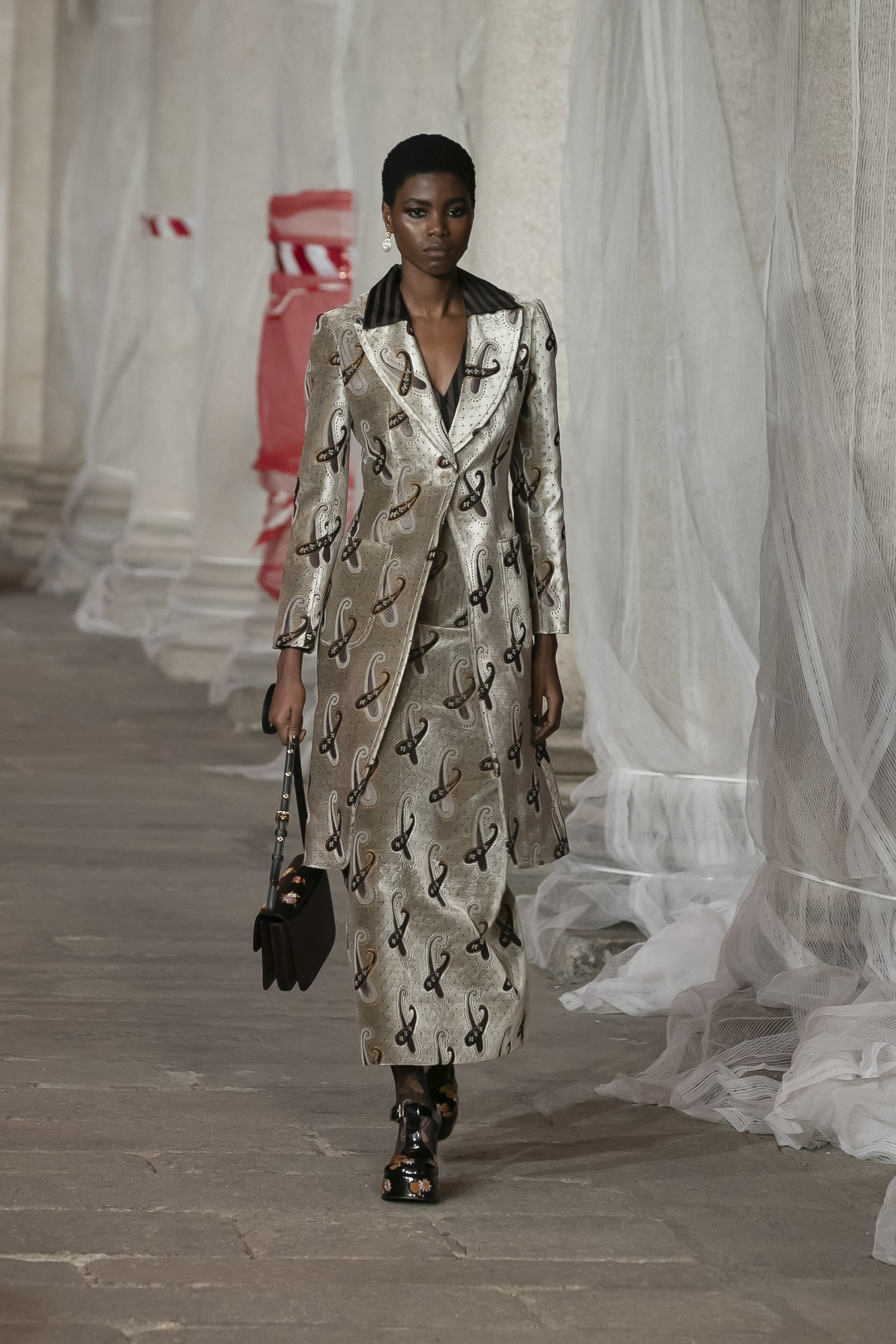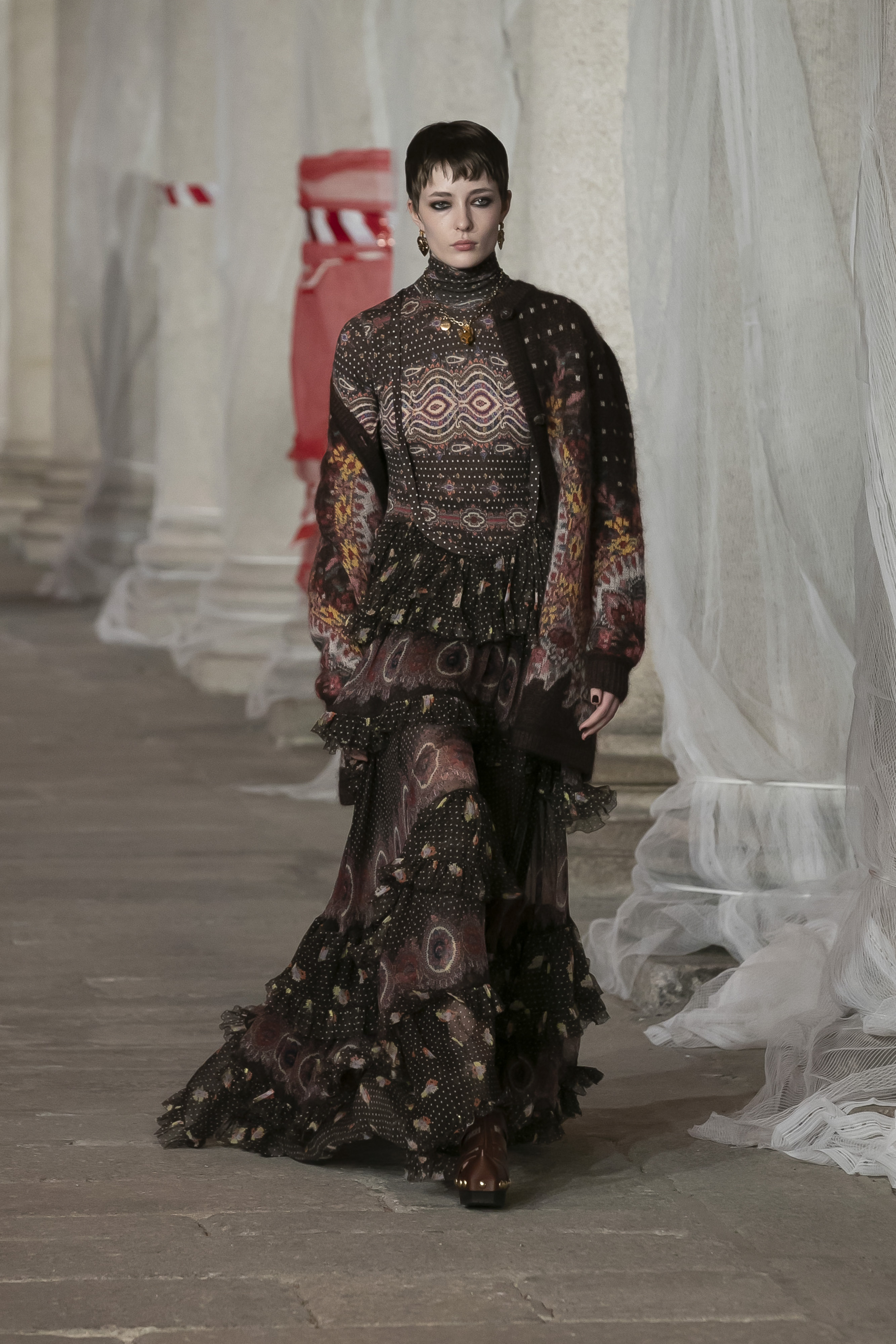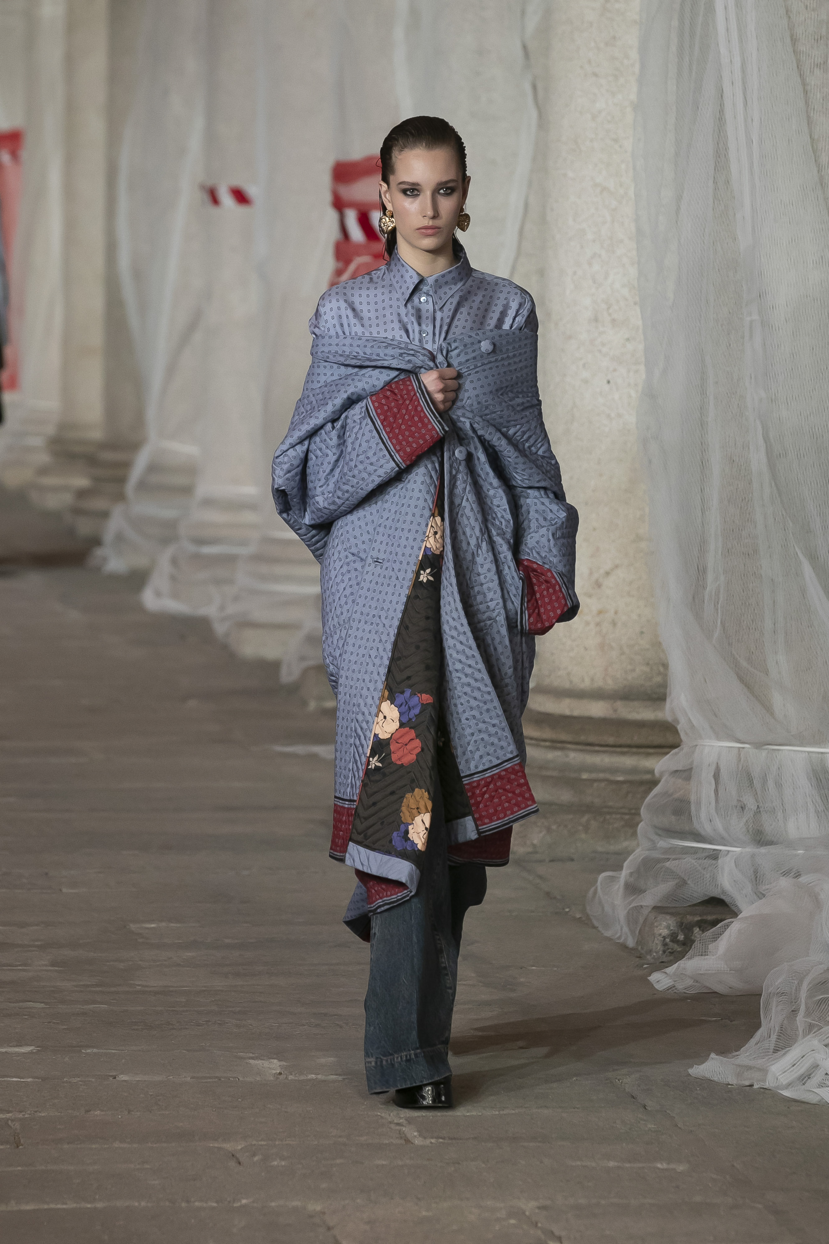 That moment, for Marco De Vincenzo, happens now. The more the creative director delves into Etro, the more the dialogue with what Etro is becomes compelling. The answer to such an exchange, of course, cannot be summed in one sentence. A dialogue is a work in progress, exactly like the place that frames the show today: an historic palazzo turned into a construction site, just wrapped or ready to be unwrapped. Delving into the history of a brand, after all, is an archaeological undertaking.