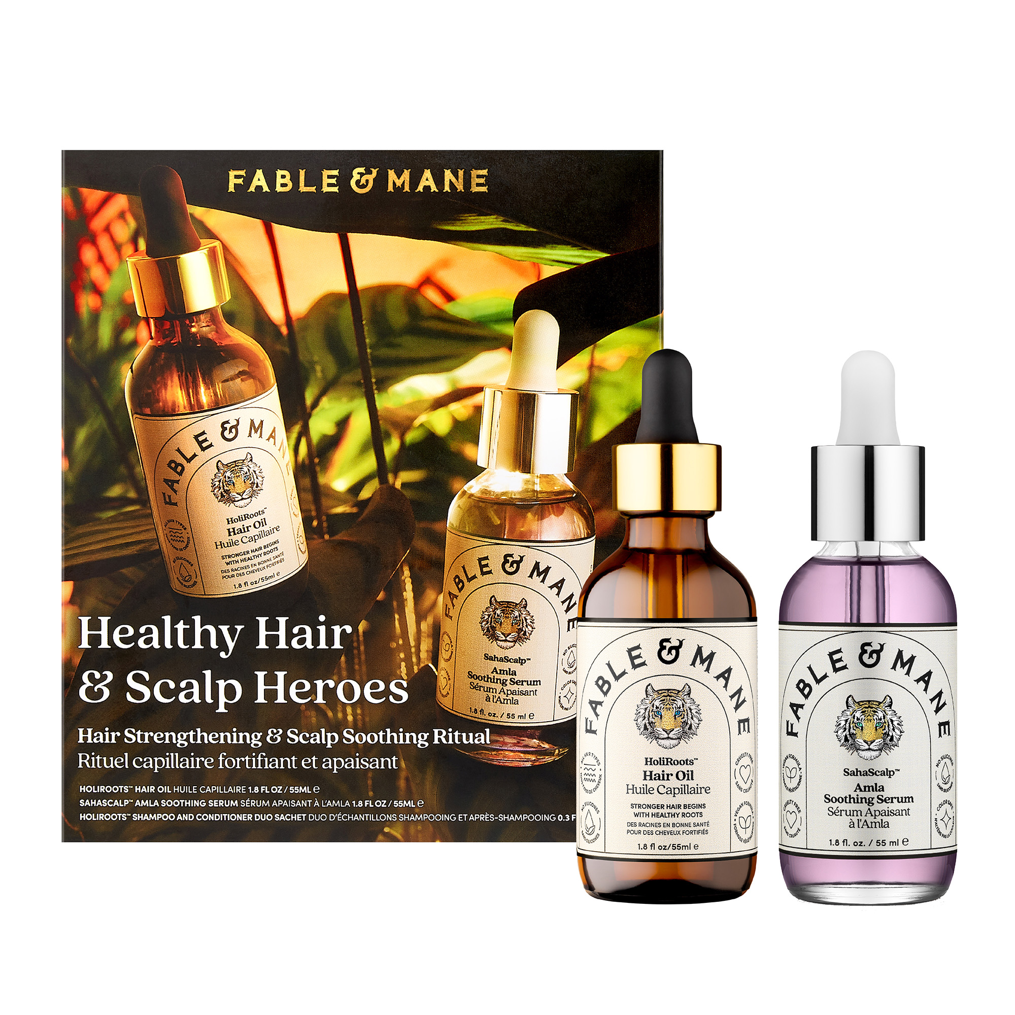 This set features two iconic best-sellers; the HoliRootsTM Hair Oil, a divine pre-wash treatment oil for stronger roots and weightless hydration, and the SahaScalpTM Amla Soothing Serum, a soothing pre-wash elixir to relieve dryness and itchiness for a balanced scalp.
