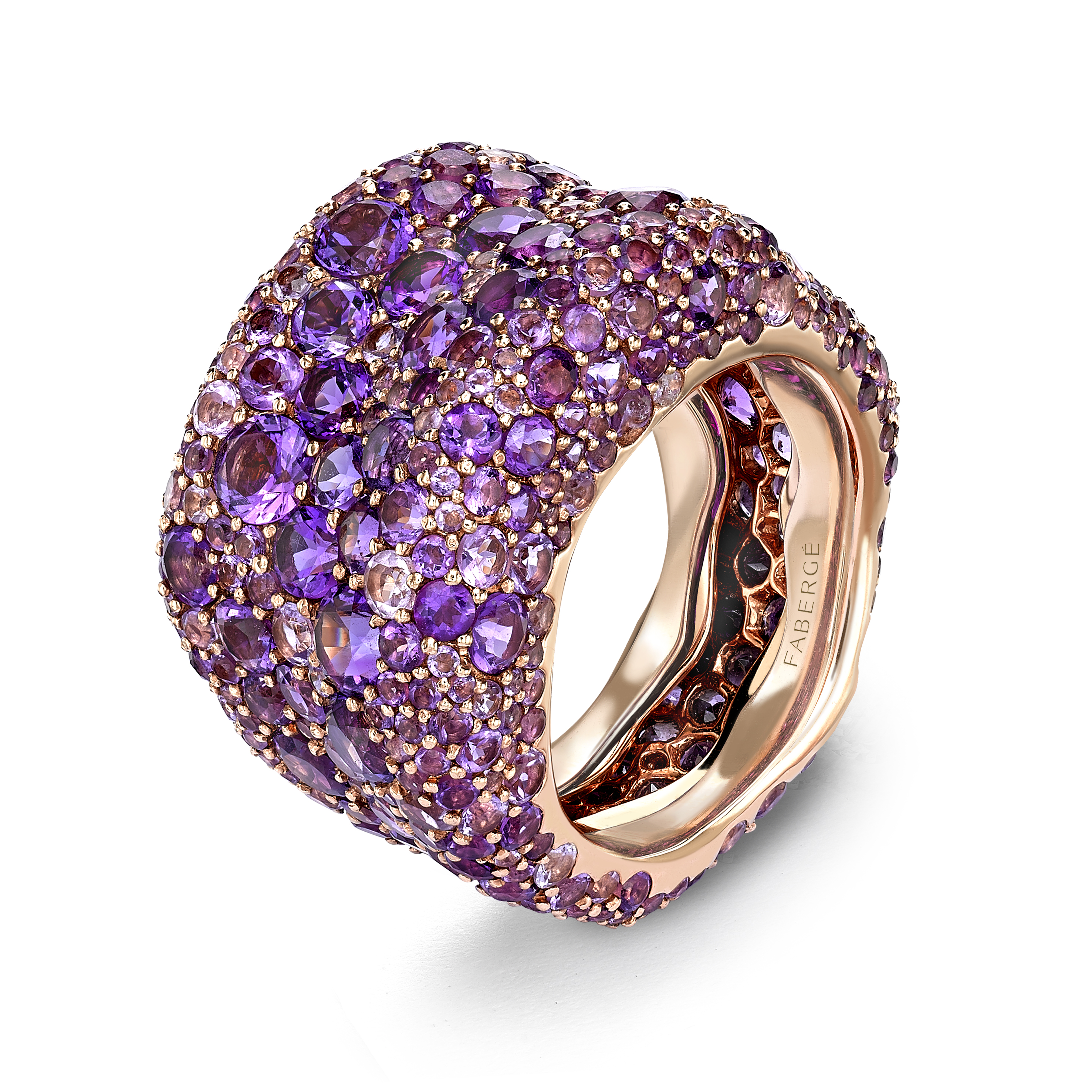 Dozens of striking purple amethysts cover this Emotion Rose Gold Amethyst Grand Ring.