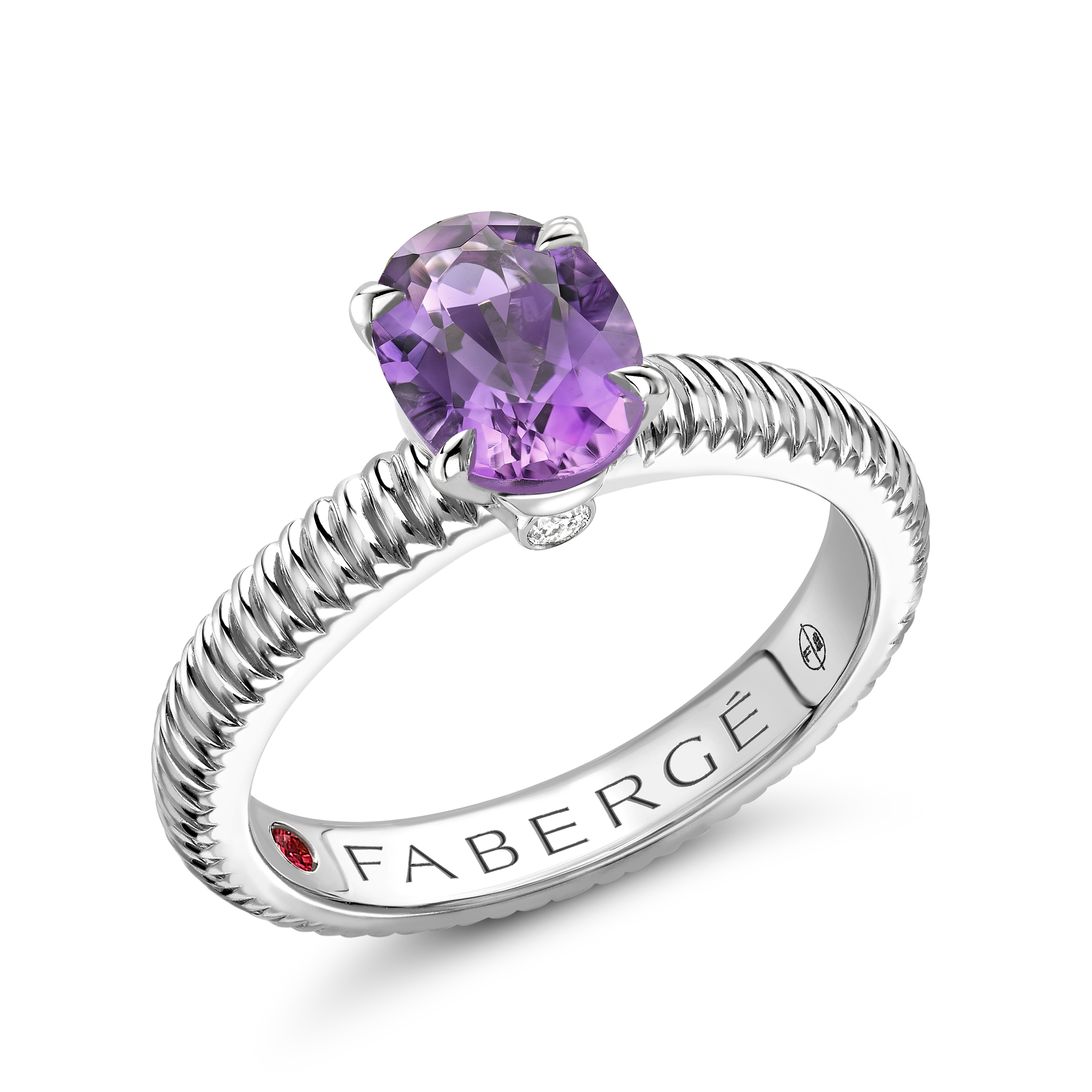 This Colours of Love Sterling Silver Amethyst Fluted Ring features an oval 8x6mm amethyst centre gemstone, set in fluted sterling silver and adorned with 2 brilliant cut white diamonds. In keeping with its fondness for delight, surprise and discovery, Fabergé has concealed a Mozambican ruby on the inside of the band. The measurements for the shank are 2.7mm in width and 2mm in depth.