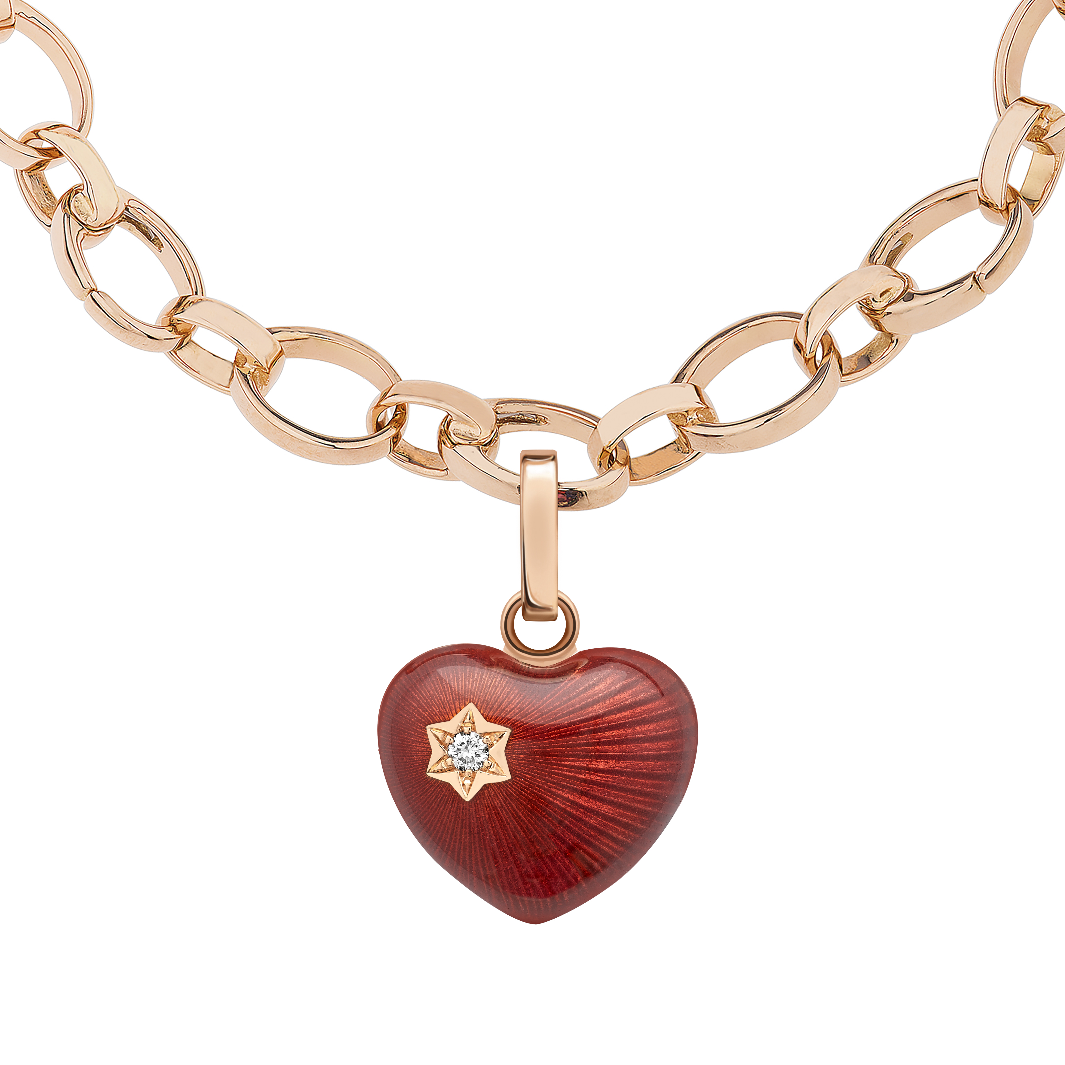 The Heritage Rose Gold Red Guilloché Enamel and Diamond Heart Charm has been crafted from 18k rose gold, and has been decorated with red guilloché enamel and set with 1 round brilliant cut white diamond. The Rose Gold Gold Chain Charm Bracelet is sold separately. The Heritage collection draws inspiration from Fabergé’s historical masterpieces. Traditional materials and complex traditional techniques, such as the delicate art of guilloché enamelling and hand-engraving, make up the signature elements of this colourful and opulent collection.