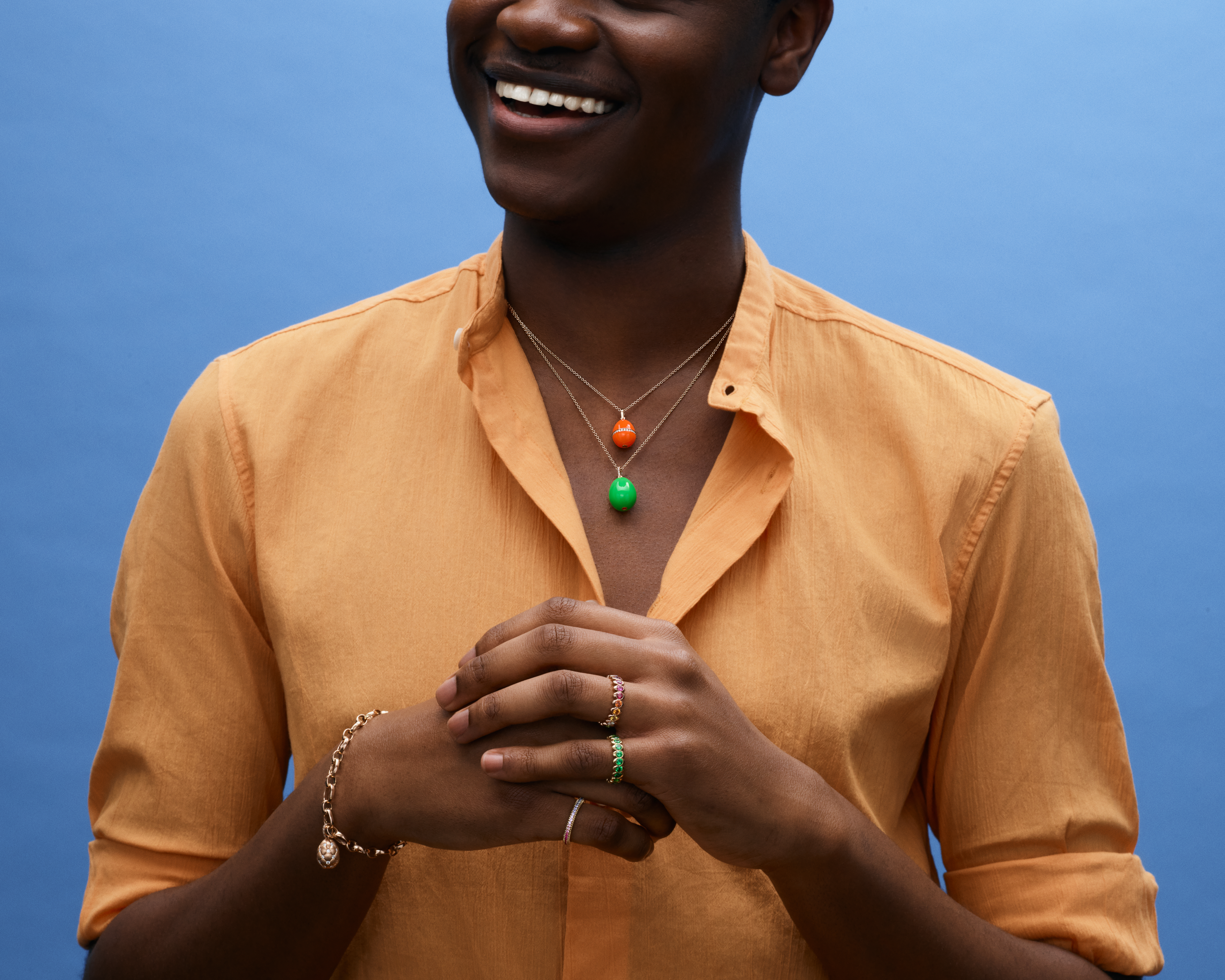 Available in five colours and two egg sizes, customers are encouraged to mix and match these playful egg pendants to create a bold and contemporary look. Eggs are available in 18mm with a sparkling diamond belt wrapping around the circumference, and 22mm with a diamond set bail. Ideal to be worn layered together with contrasting colours, or worn solo to add a burst of colour, these new pendants add a dose of fun to the everyday.