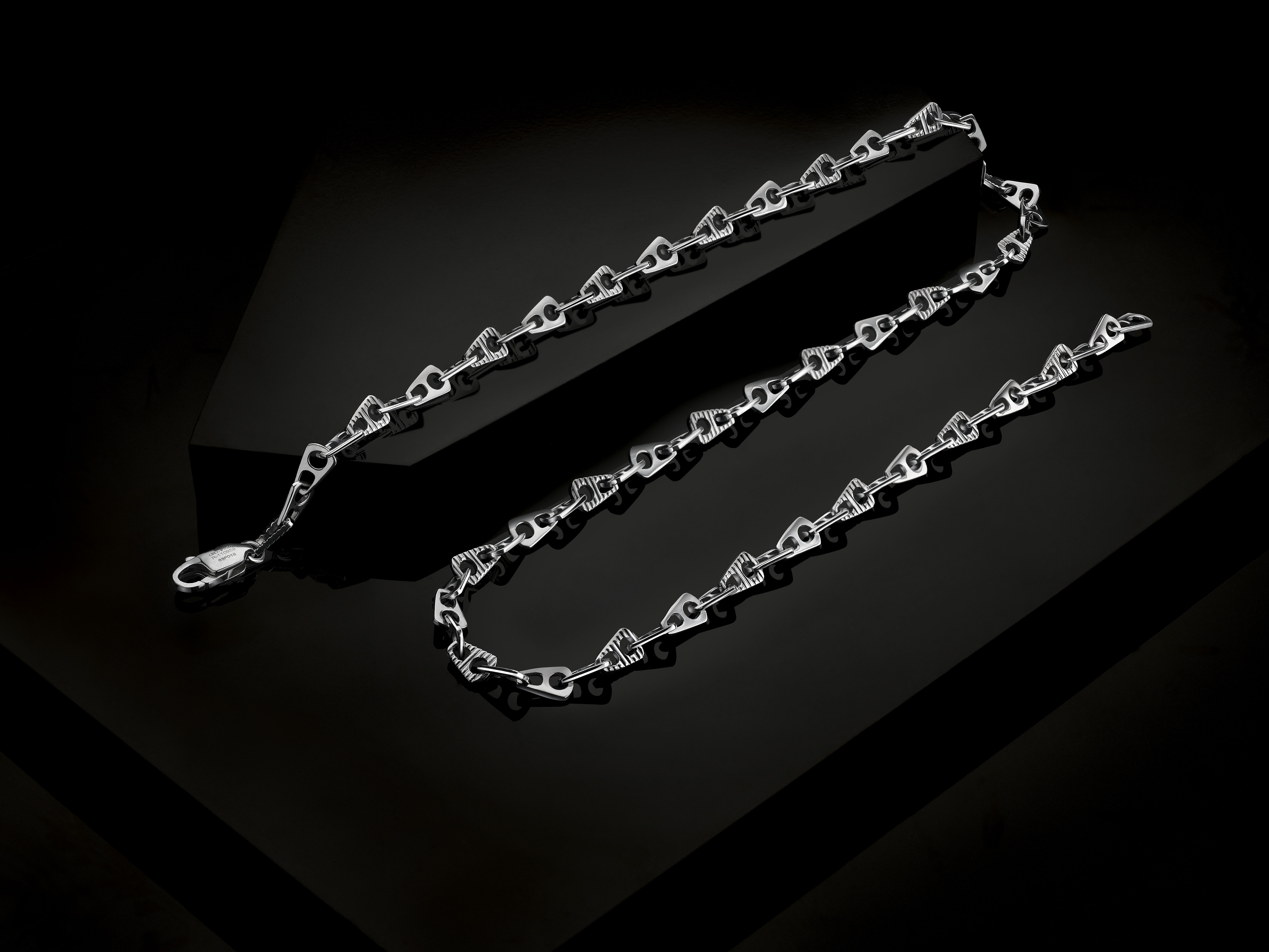 Featuring A-shaped arrow-like platinum facets linked together, this chain elevates the style code for modern men. Crafted in platinum, a metal that retains its natural white hue and form over time, never to fade or tarnish, the design is distinctive and timeless. It's the perfect companion to complete your year-end holiday look, whether you're heading to the beach or the mountains.
