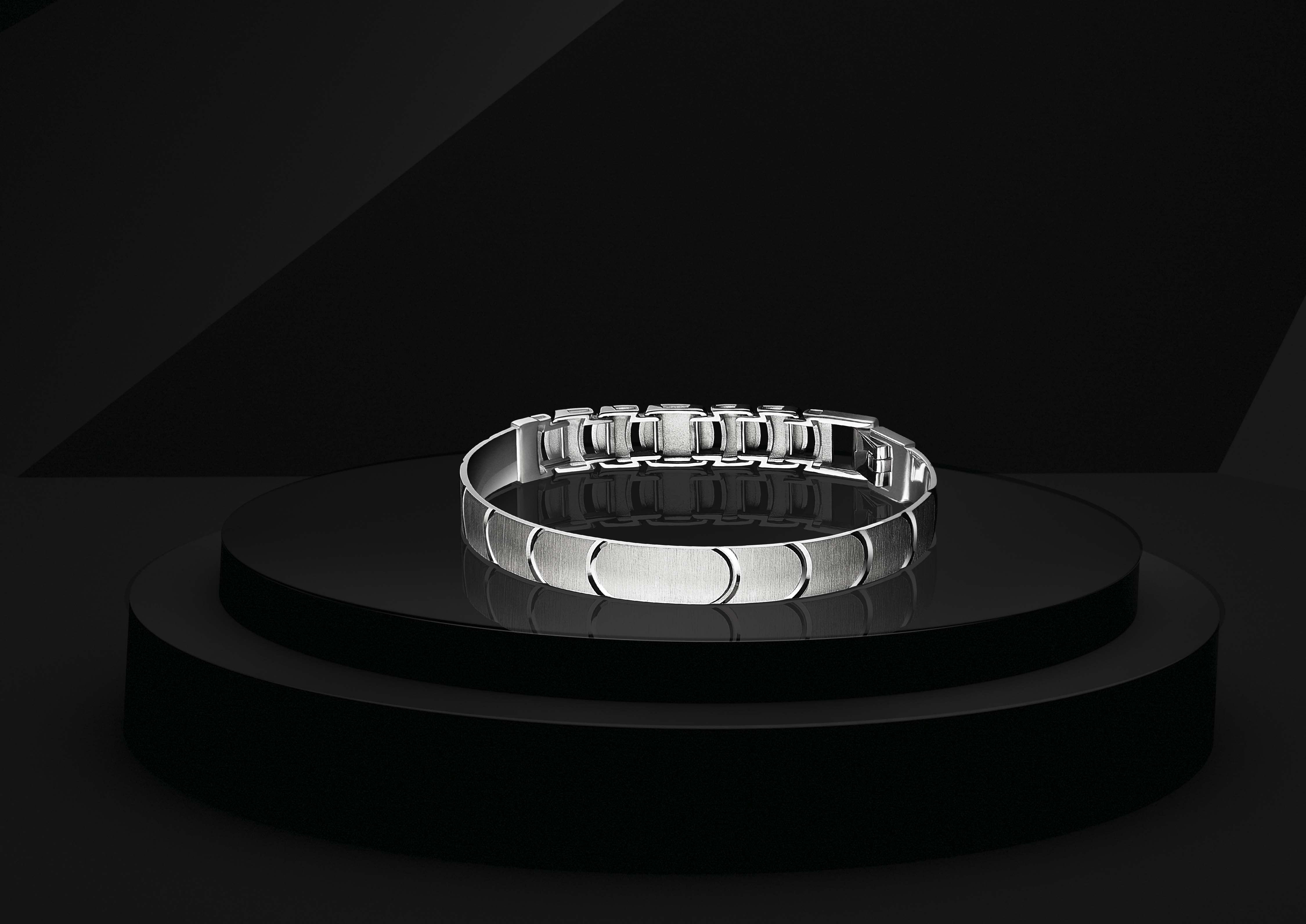 Celebrate the season of evening soirees with the Platinum Faceted Centerpiece Bracelet. Interlinked facets in this exquisite bracelet helps you make a noticeable statement, especially when paired with a sharp black suit and a block-colored tie.
