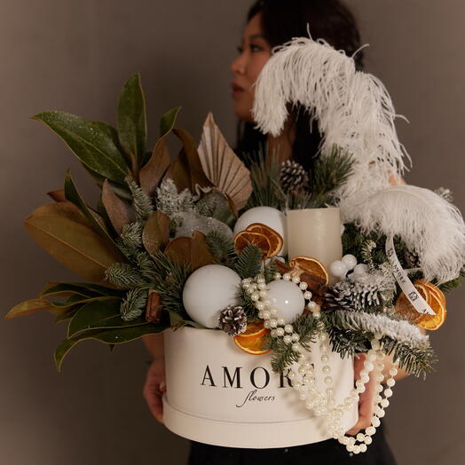 Indulge in holiday charm with the Snowkissed Elegance Composition. A delicate arrangement of Nobilis, Pinus, Conifer, magnolia leaves, dried palm smear, festive cinnamon sticks, orange slices, pinecones, pearls, and Christmas balls, all cradled in a signature branded box. Completed with soft feathers for a touch of whimsy and candle.