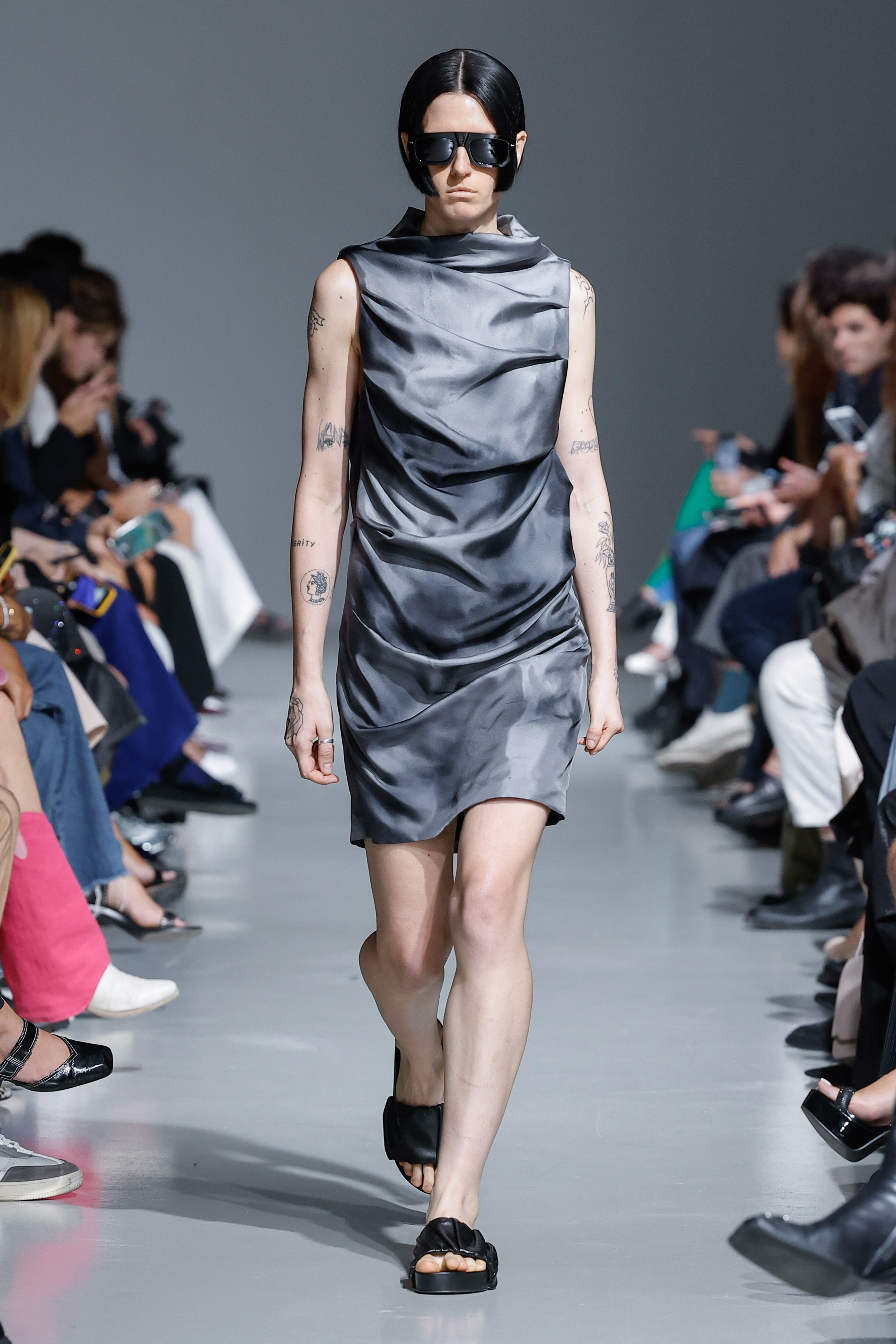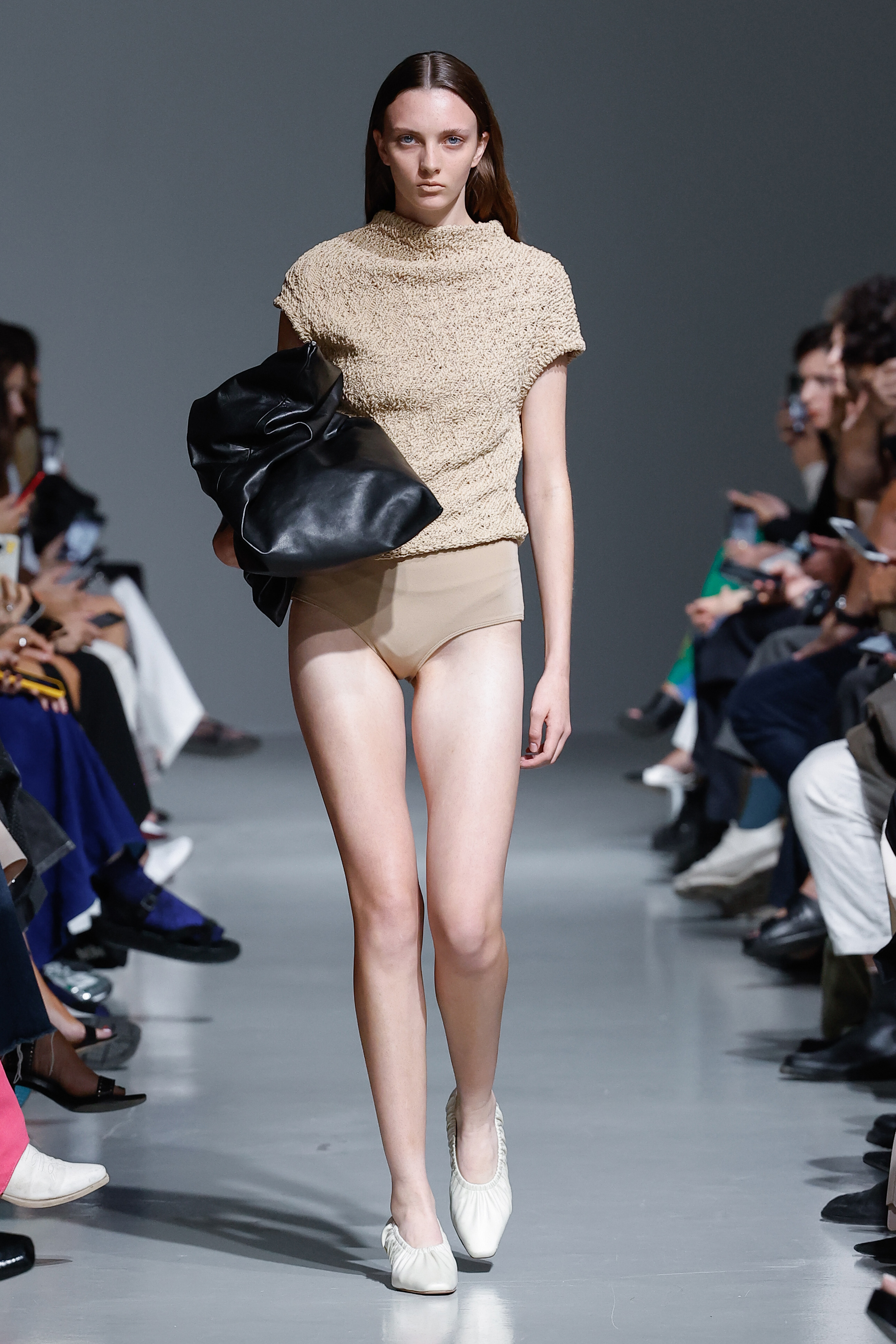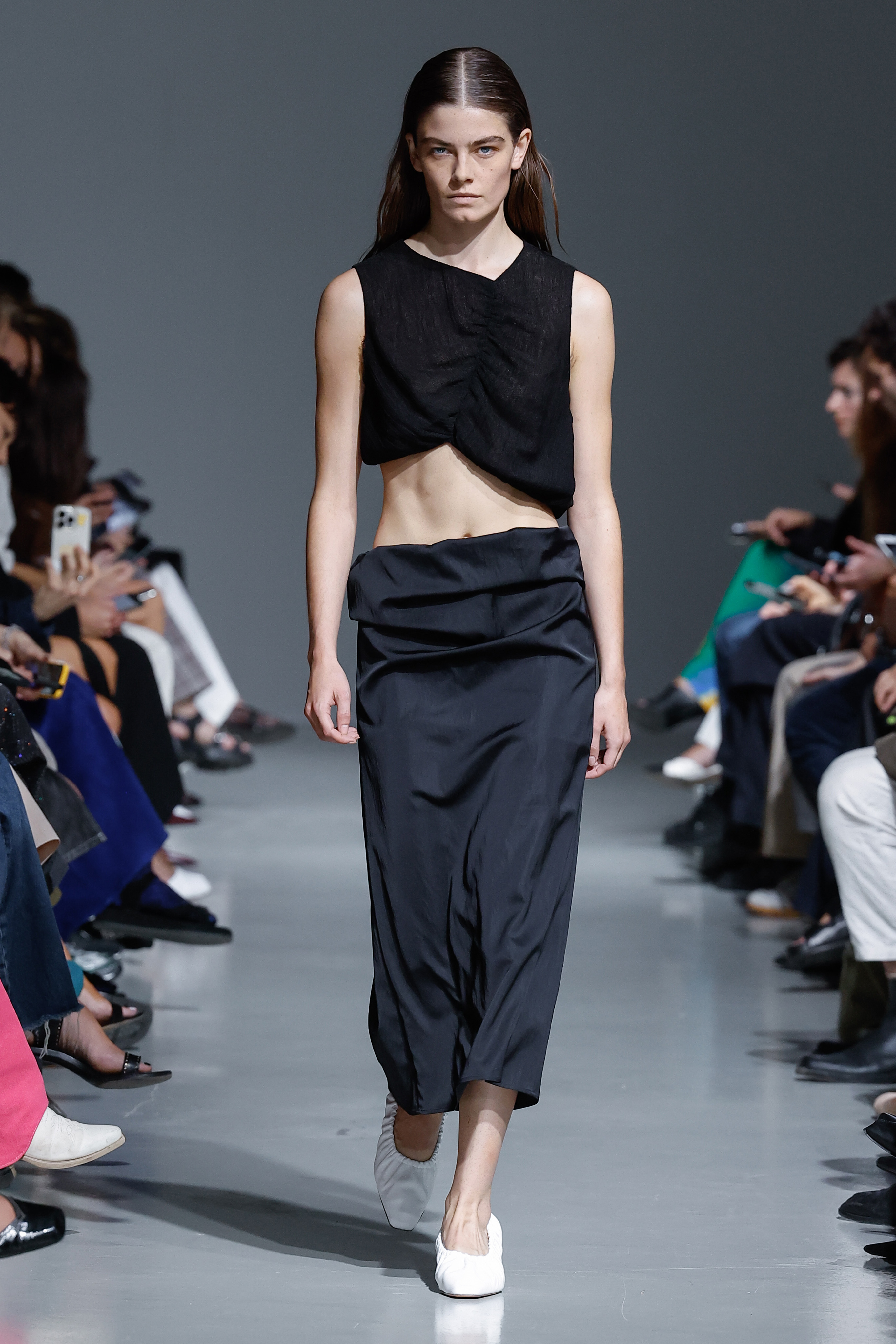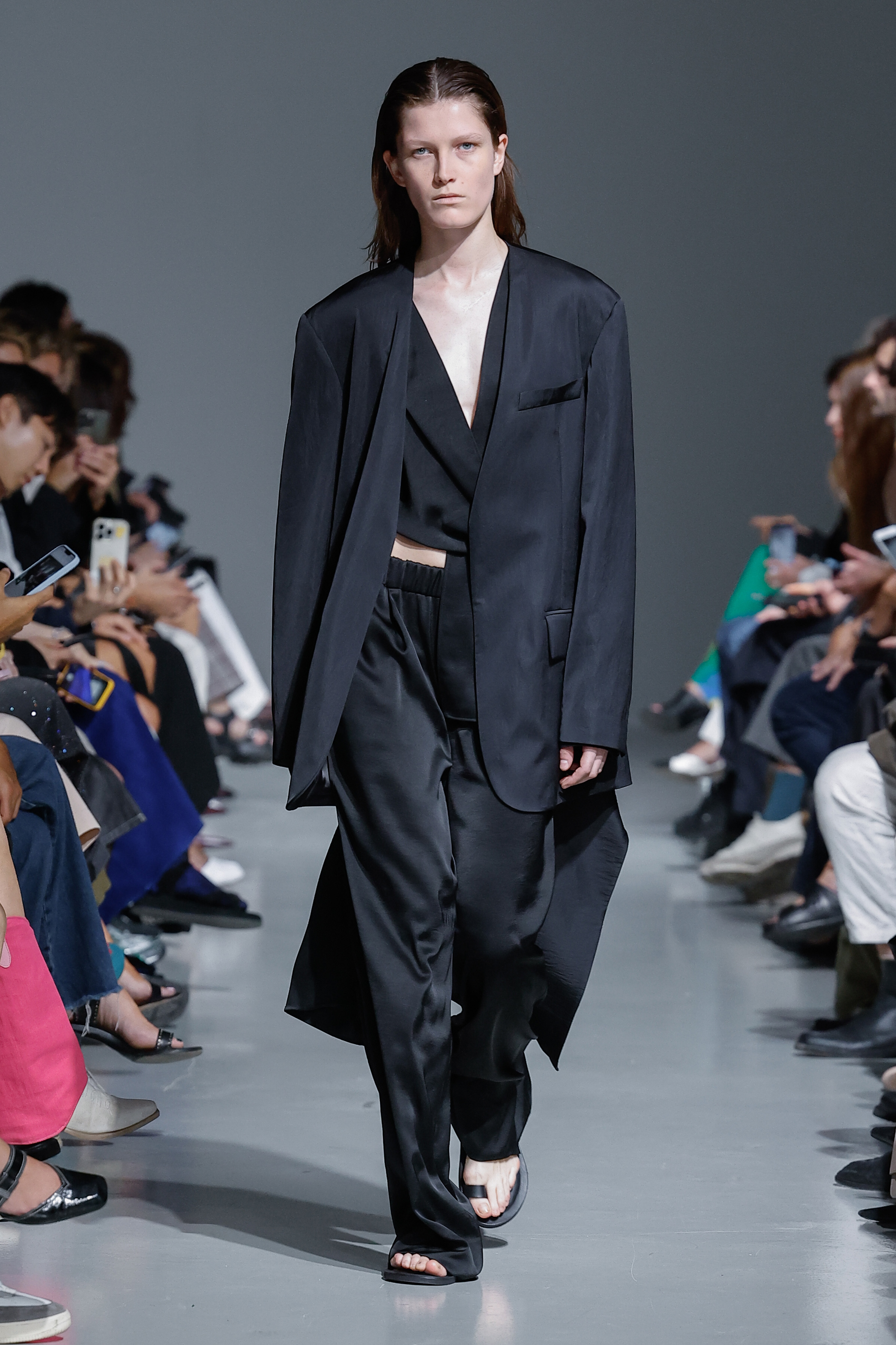 Backless tops, slits in skirts and jackets are revealing the body. Ultra-short pants are paired with oversized blazers. A play between sheer silk mousseline and opaque leather stand in contrast within the same silhouette. Wrapped and pleated tank tops and skirts in jersey represent a certain disjointed connection. Dropped large shoulders paired with a rushing detail at the waist becomes an important silhouette for blazers, shirts, tops, and skirts. They come in summer wool, light cotton, silk, and transparent gaze.