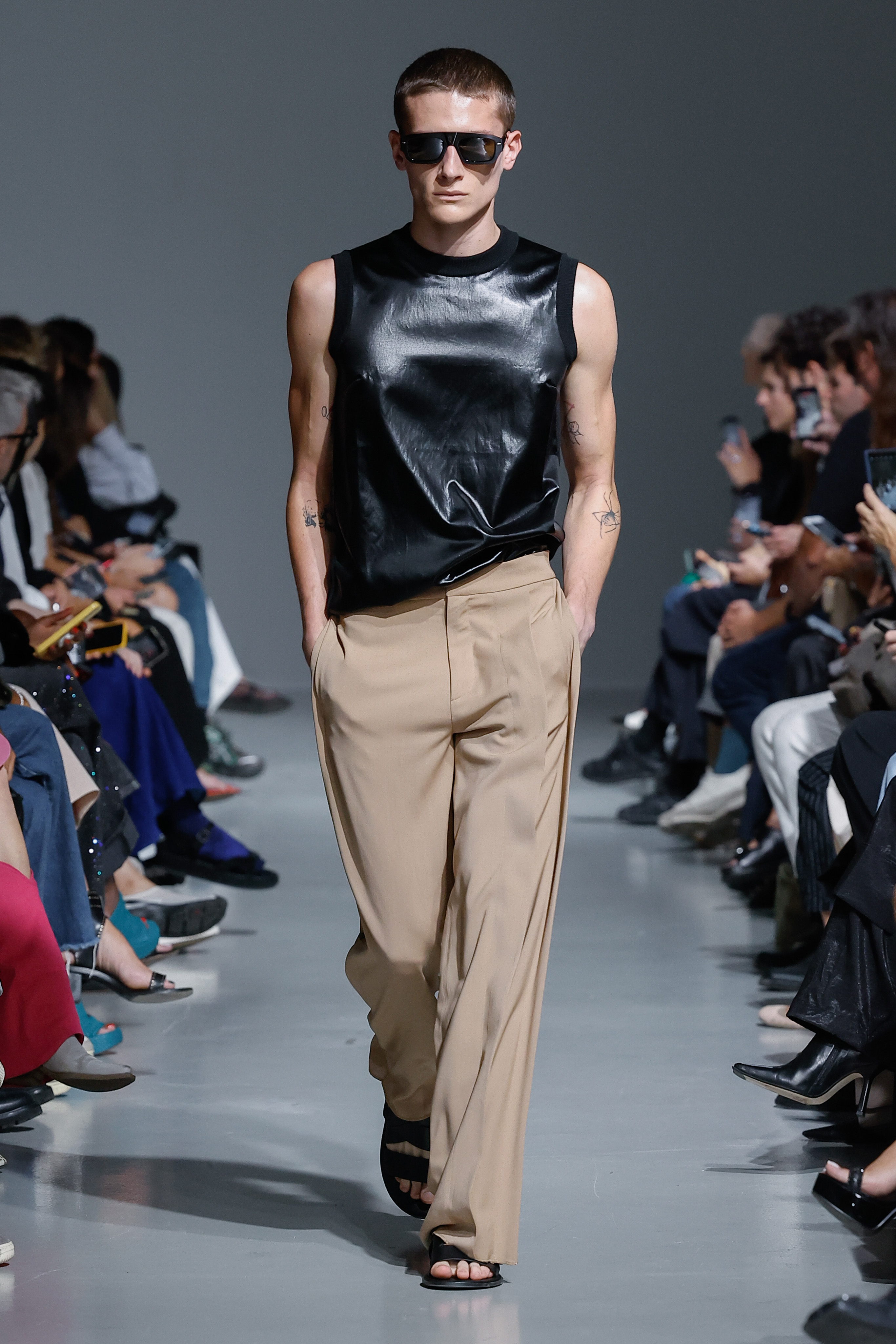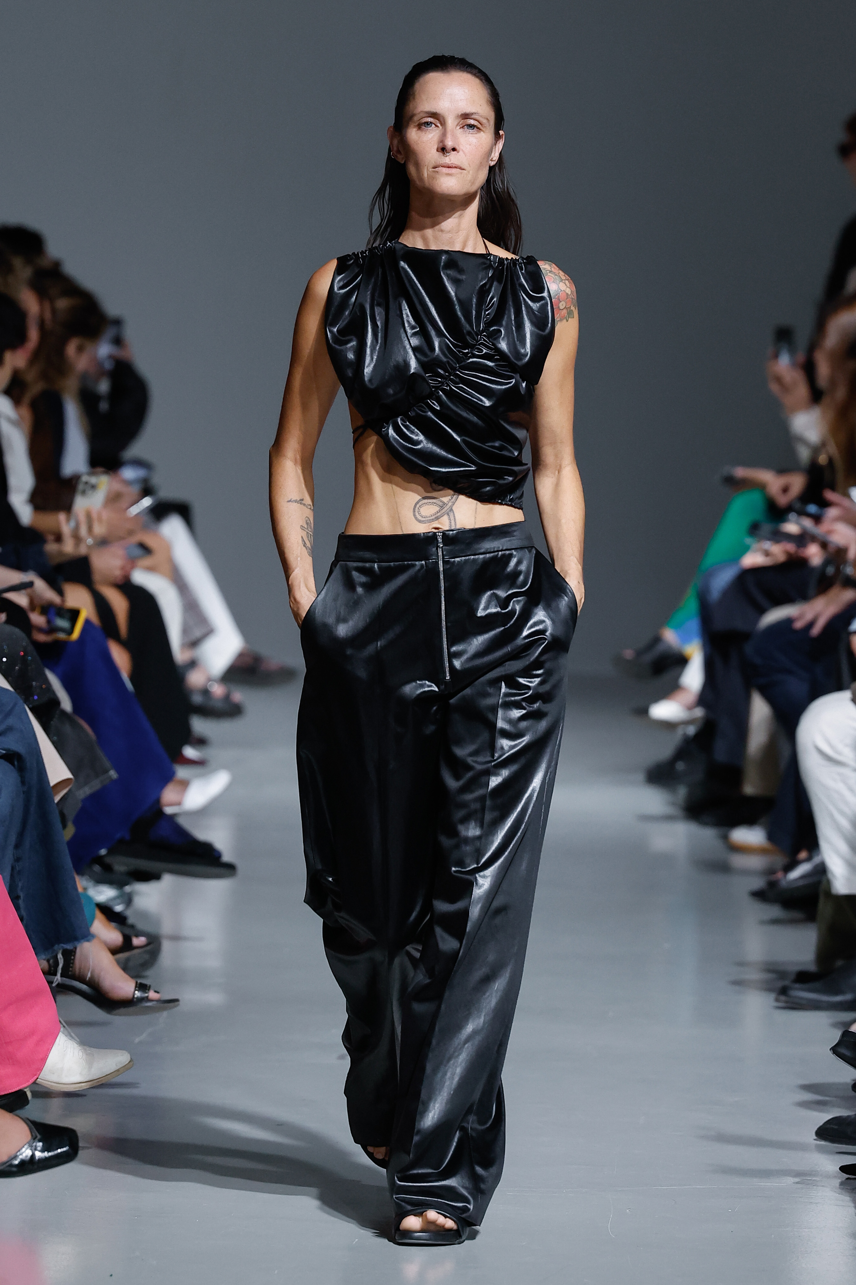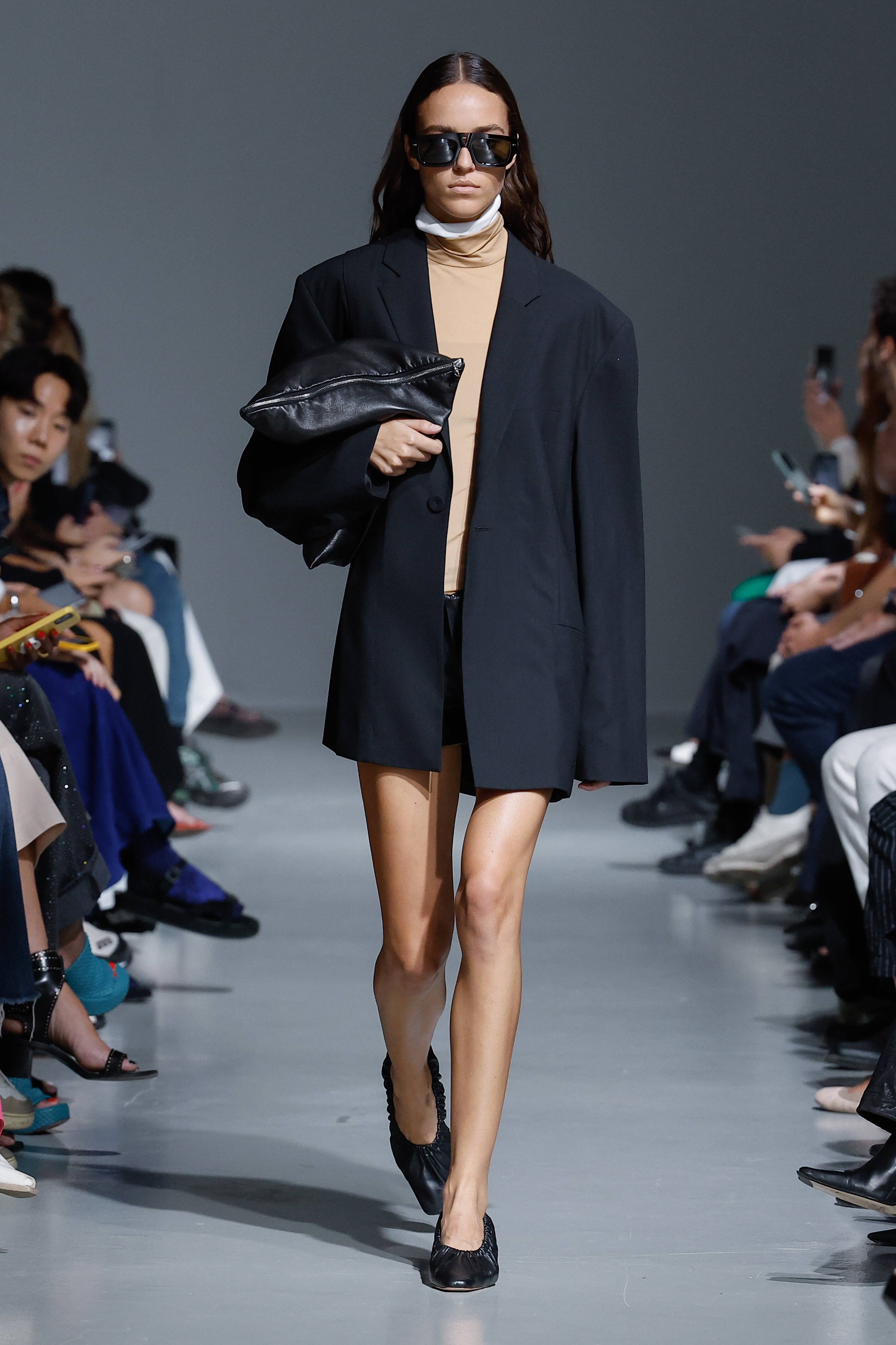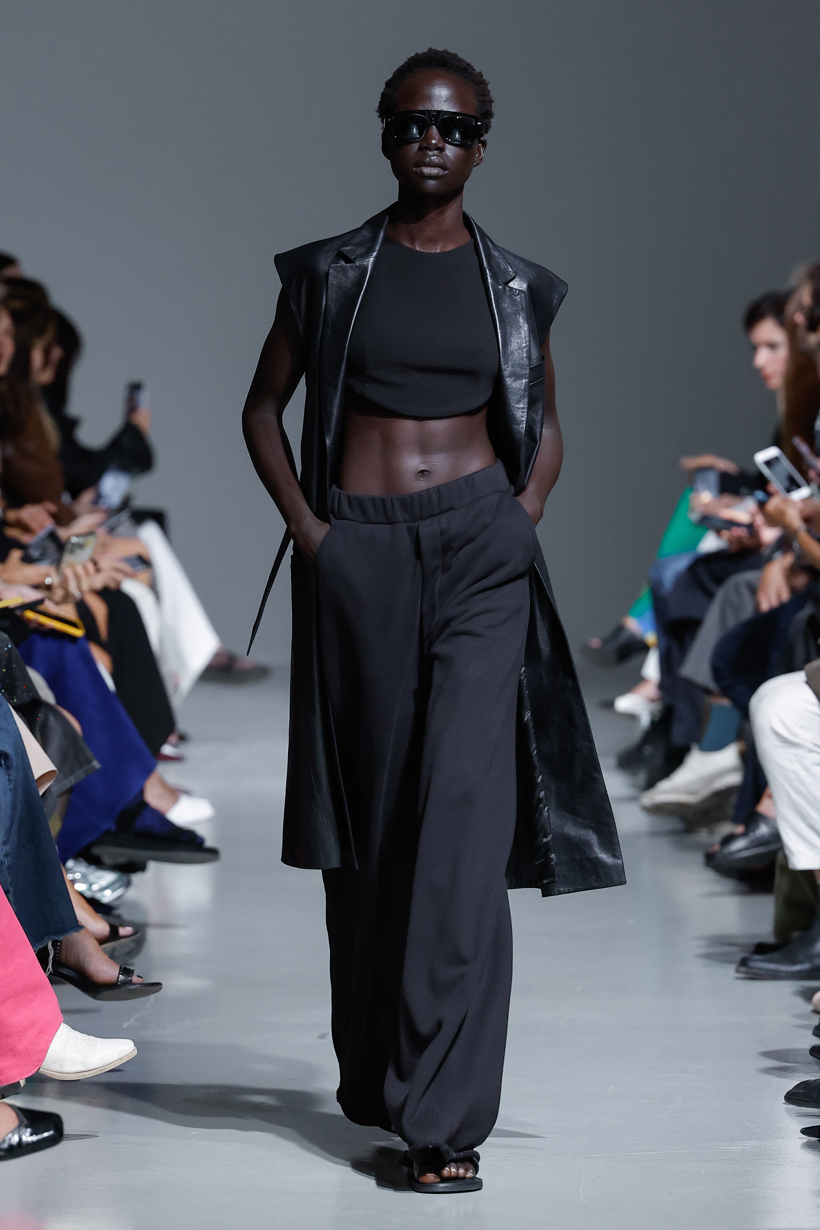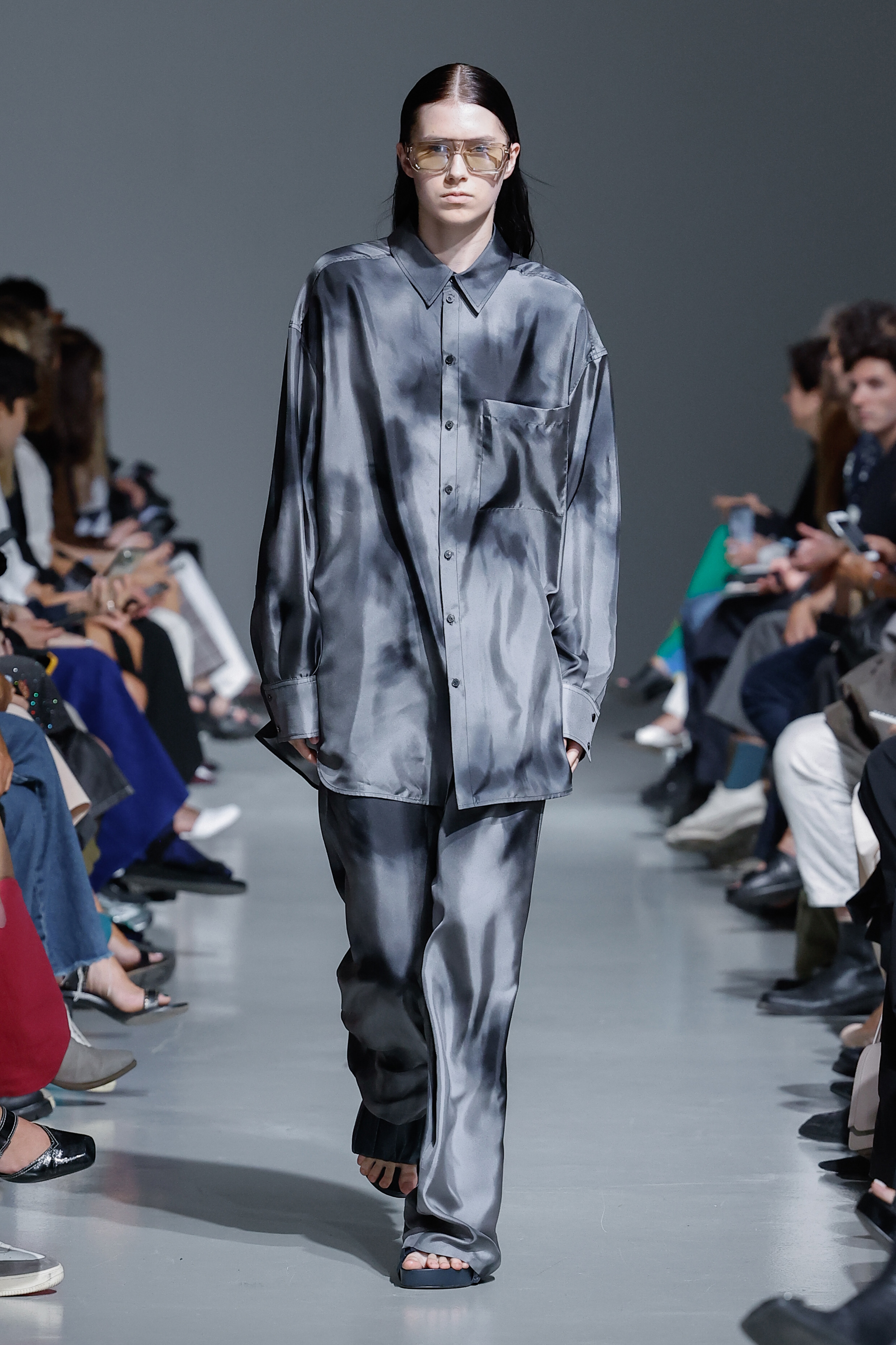 Backless tops, slits in skirts and jackets are revealing the body. Ultra-short pants are paired with oversized blazers. A play between sheer silk mousseline and opaque leather stand in contrast within the same silhouette. Wrapped and pleated tank tops and skirts in jersey represent a certain disjointed connection. Dropped large shoulders paired with a rushing detail at the waist becomes an important silhouette for blazers, shirts, tops, and skirts. They come in summer wool, light cotton, silk, and transparent gaze.