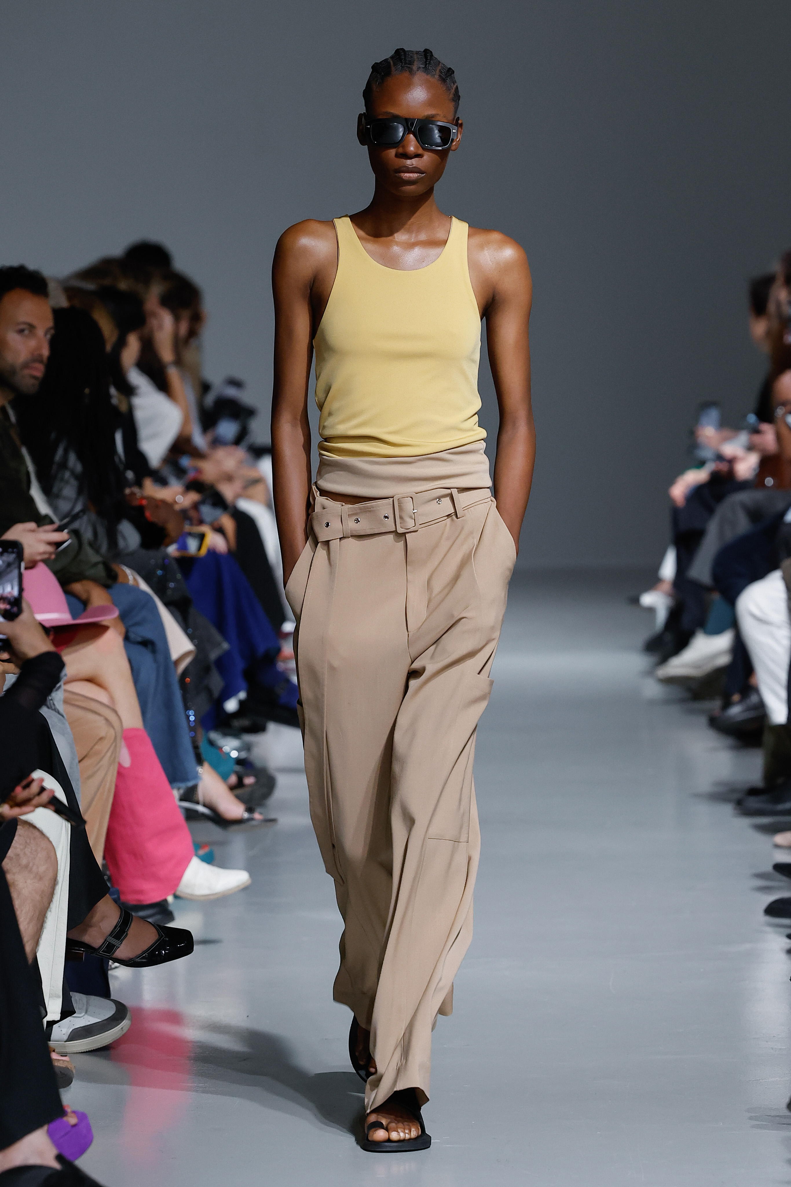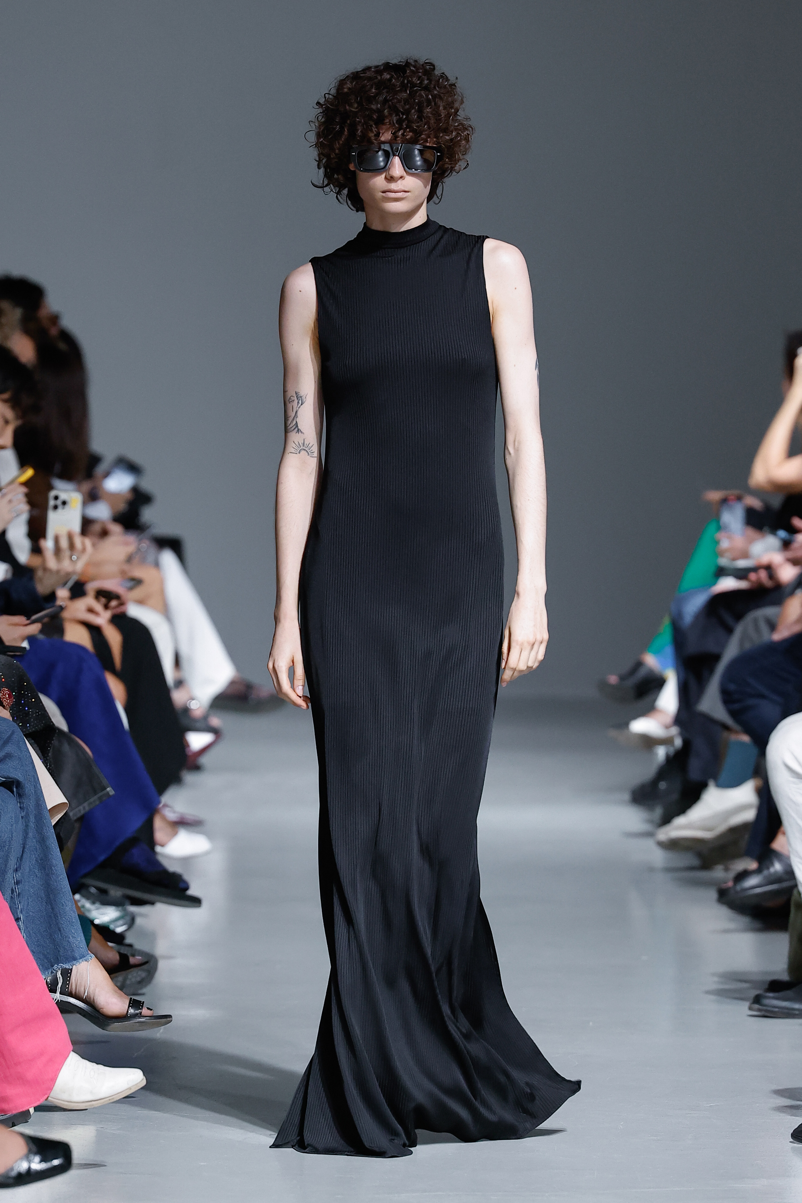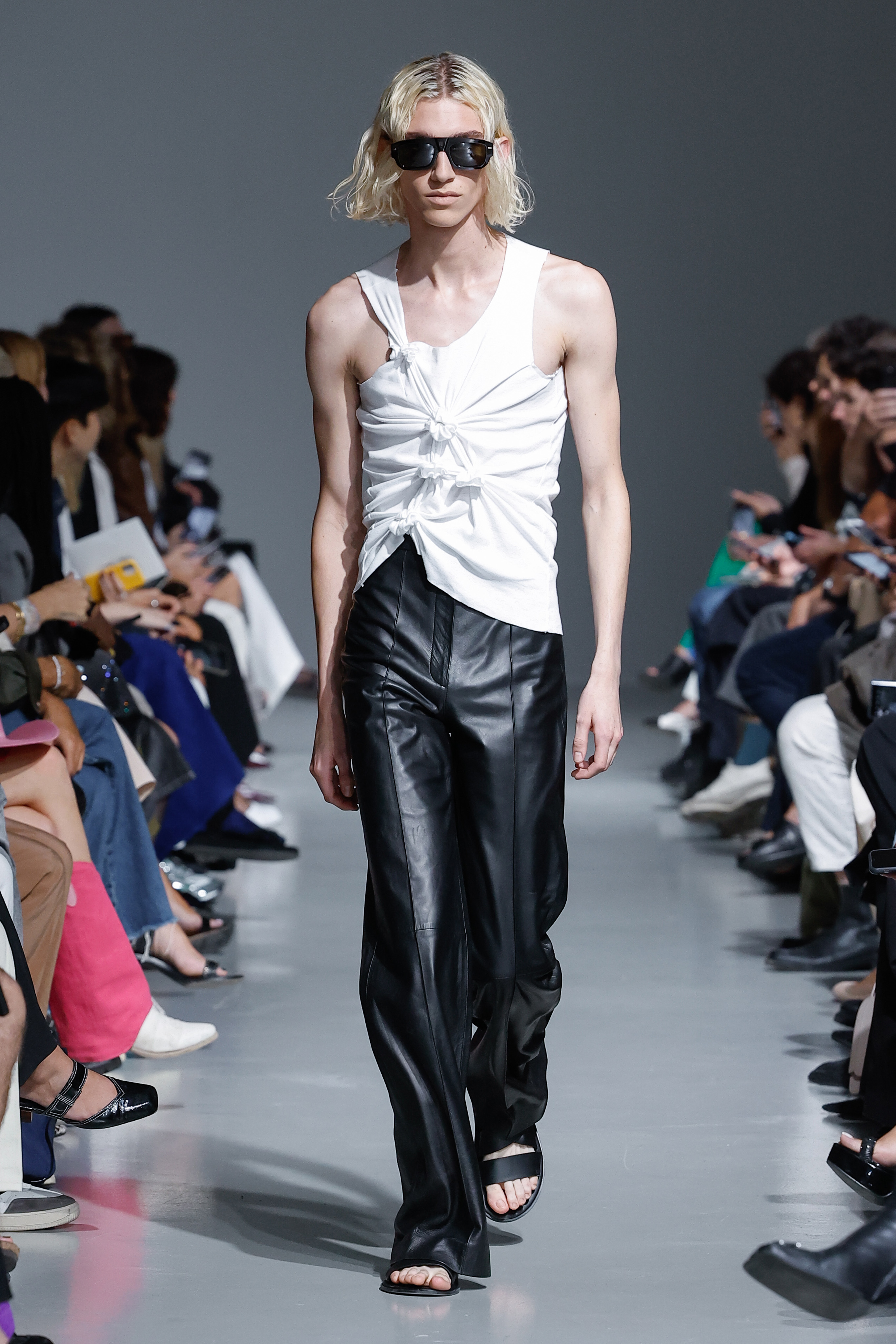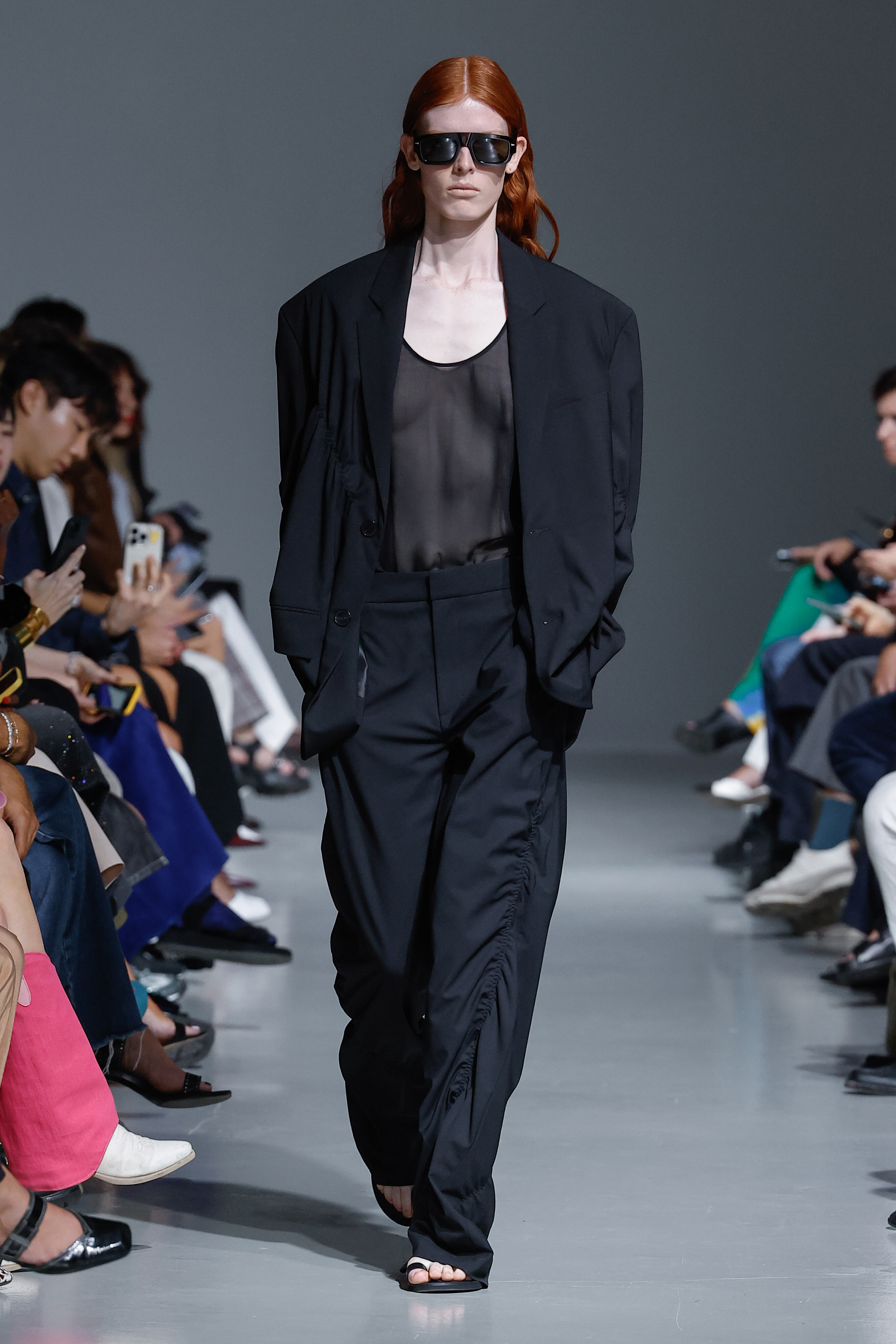 Backless tops, slits in skirts and jackets are revealing the body. Ultra-short pants are paired with oversized blazers. A play between sheer silk mousseline and opaque leather stand in contrast within the same silhouette. Wrapped and pleated tank tops and skirts in jersey represent a certain disjointed connection. Dropped large shoulders paired with a rushing detail at the waist becomes an important silhouette for blazers, shirts, tops, and skirts. They come in summer wool, light cotton, silk, and transparent gaze.