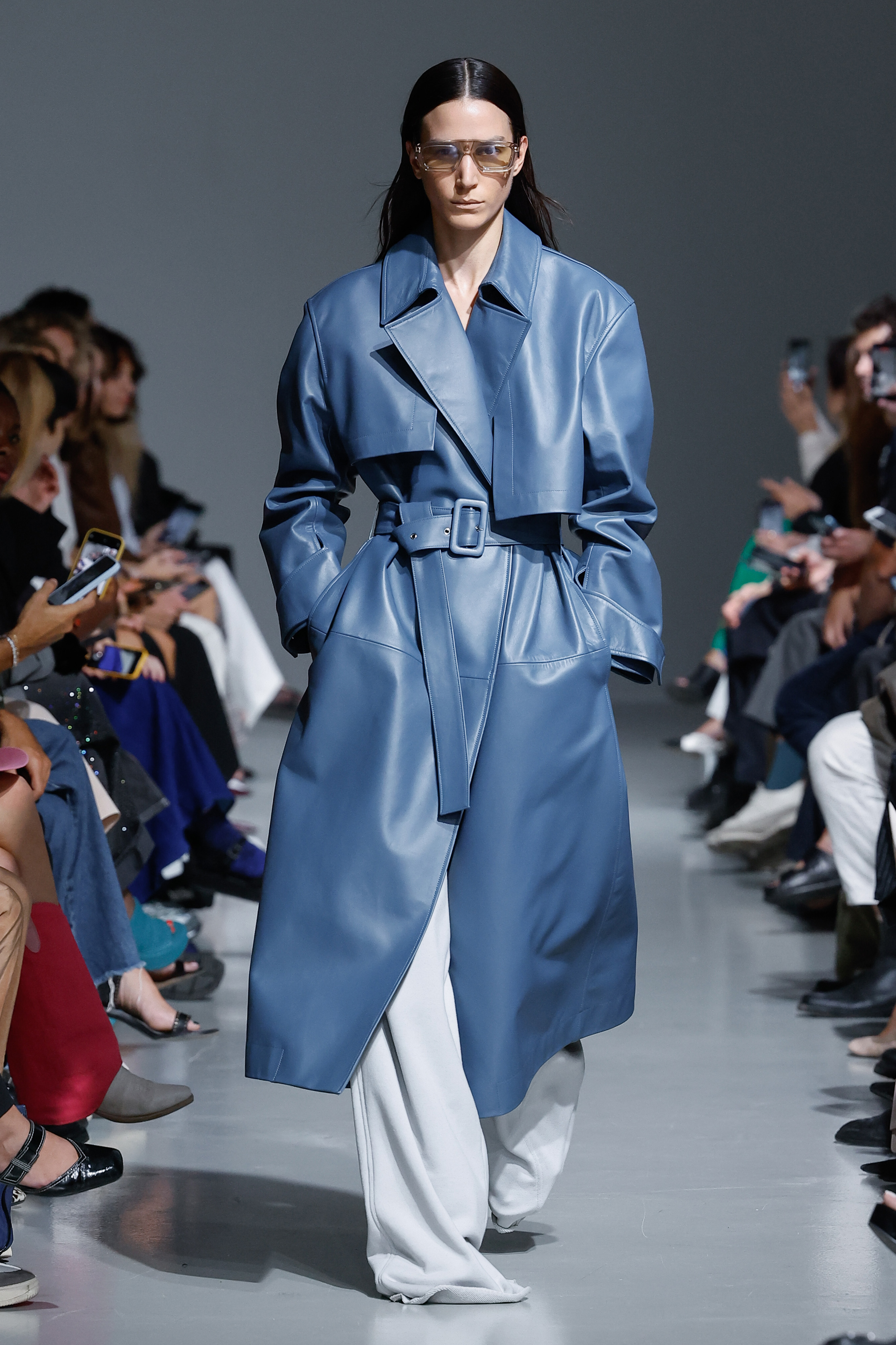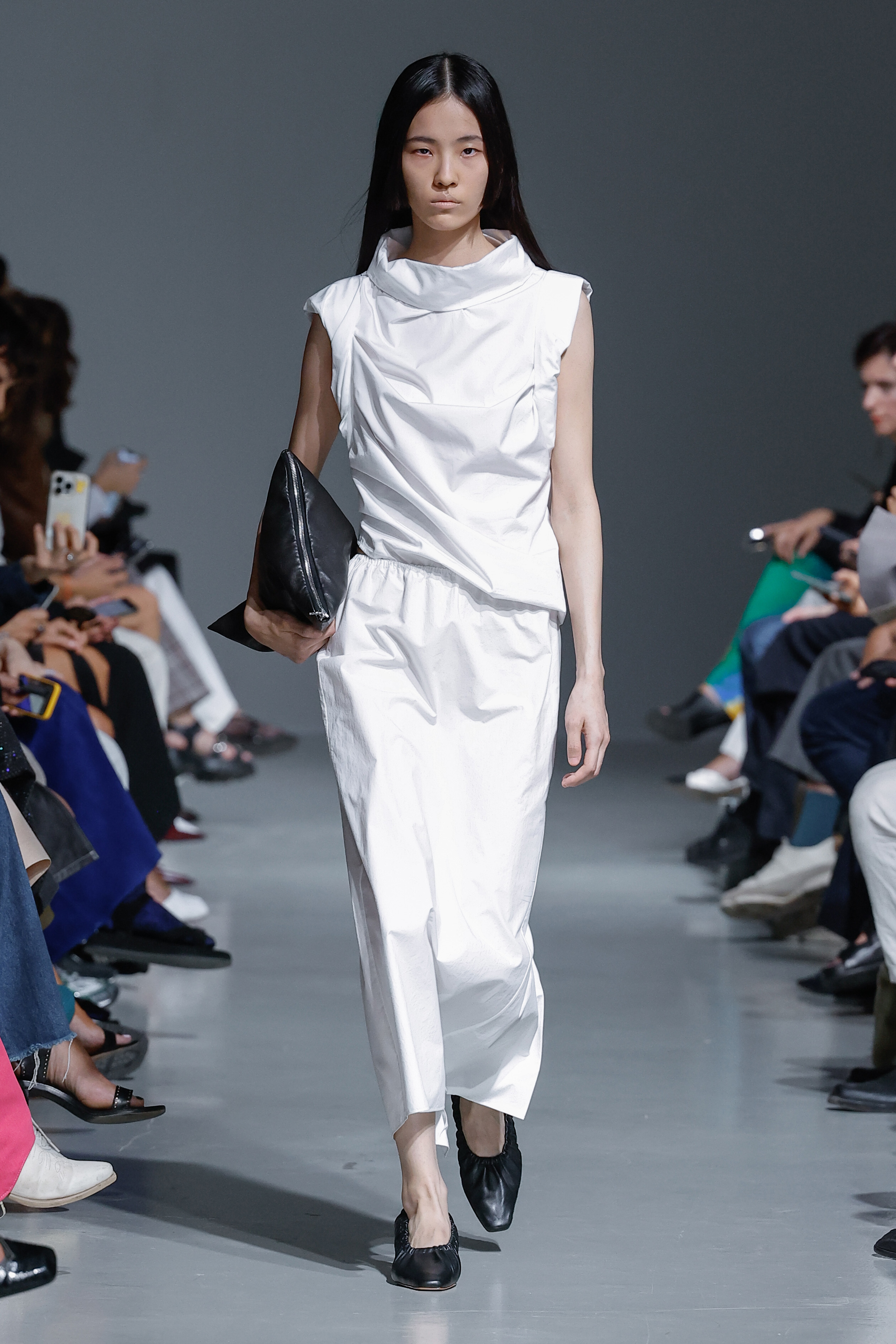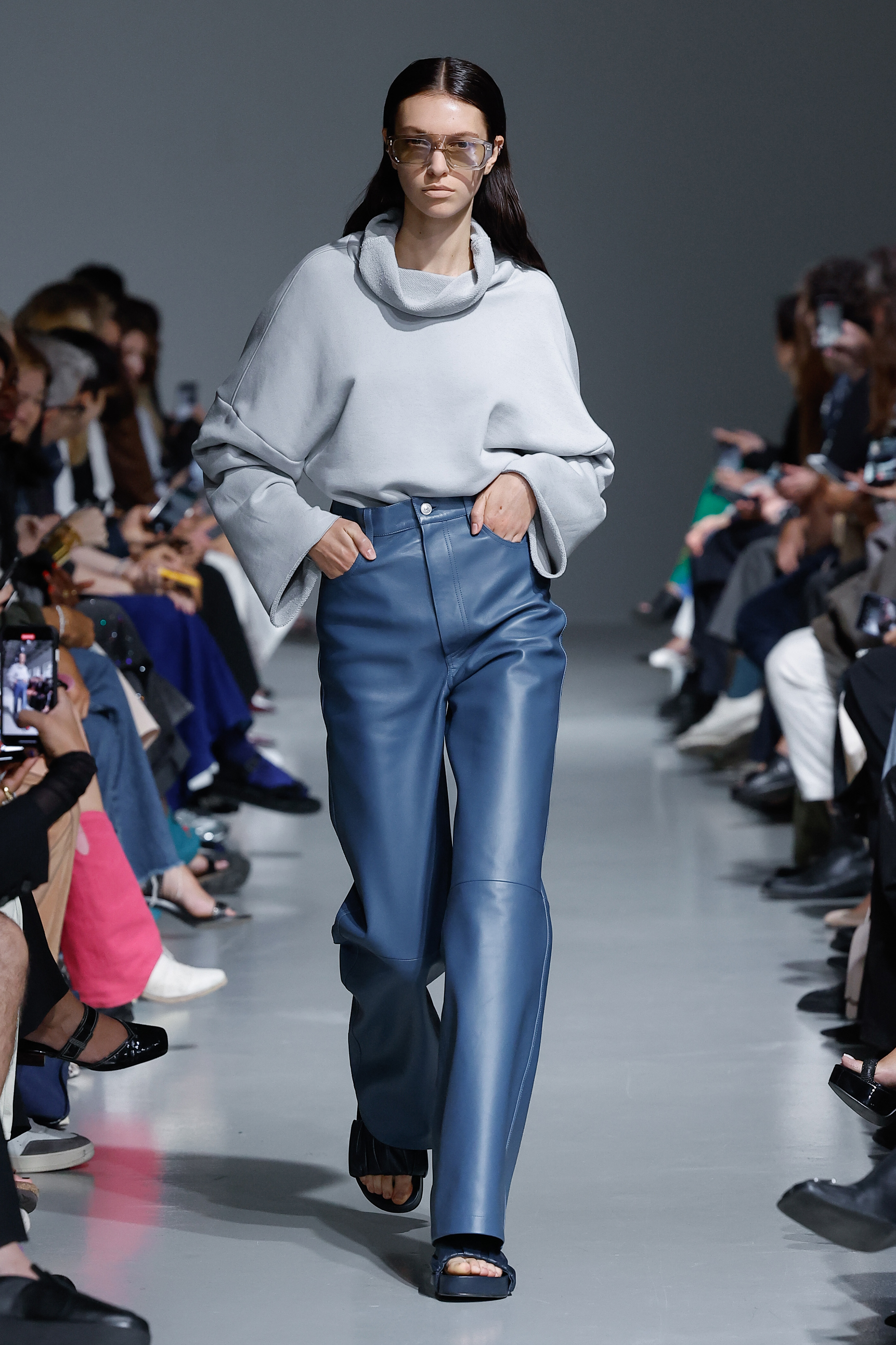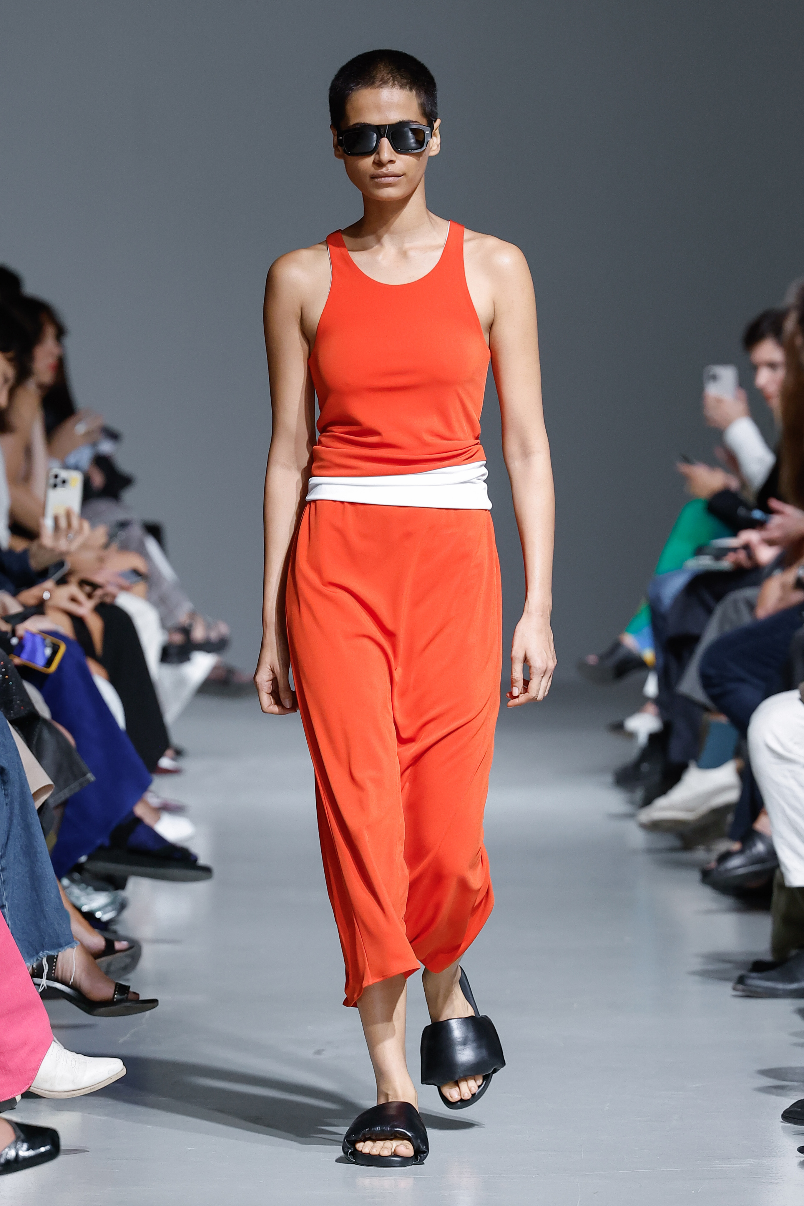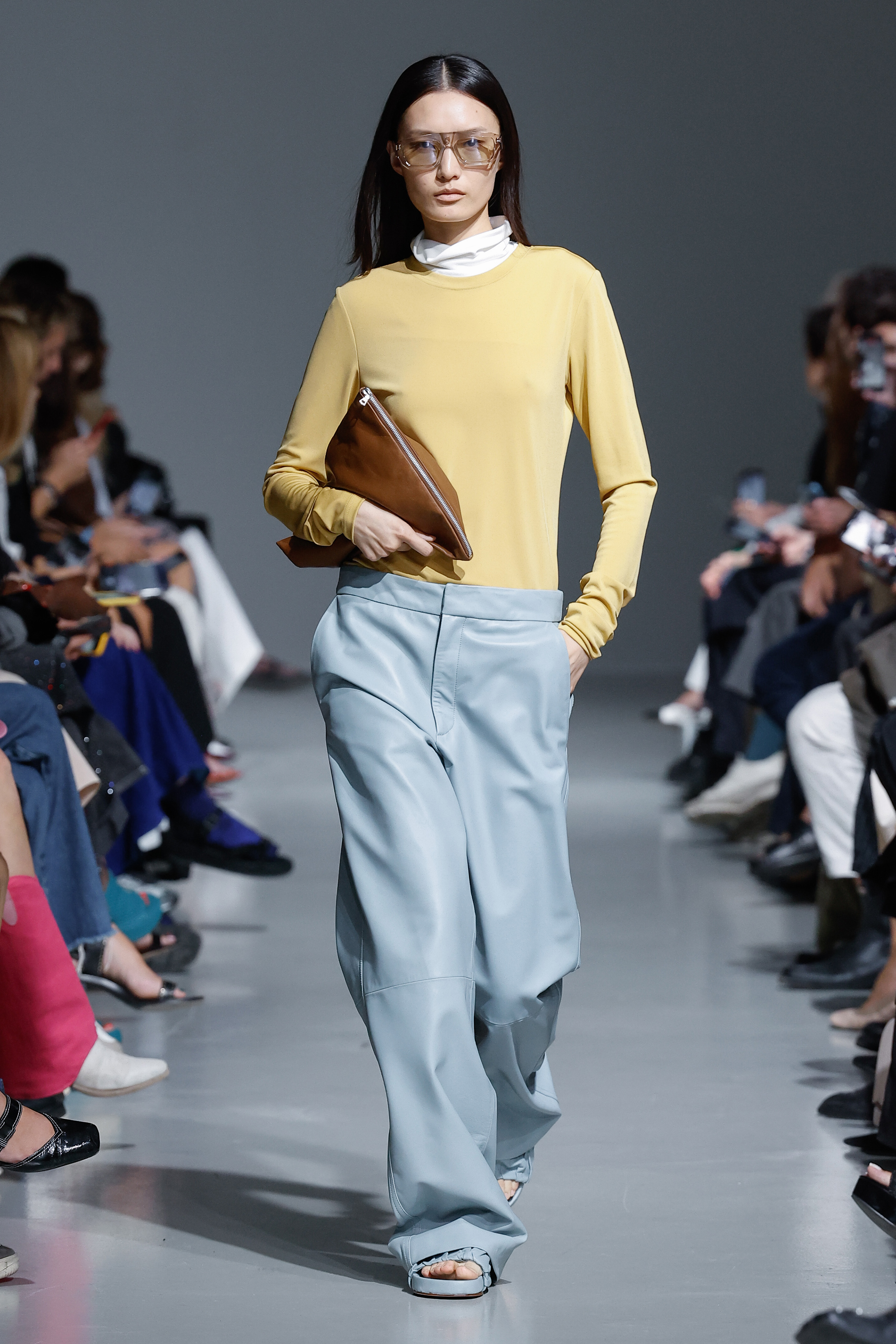 Backless tops, slits in skirts and jackets are revealing the body. Ultra-short pants are paired with oversized blazers. A play between sheer silk mousseline and opaque leather stand in contrast within the same silhouette. Wrapped and pleated tank tops and skirts in jersey represent a certain disjointed connection. Dropped large shoulders paired with a rushing detail at the waist becomes an important silhouette for blazers, shirts, tops, and skirts. They come in summer wool, light cotton, silk, and transparent gaze.