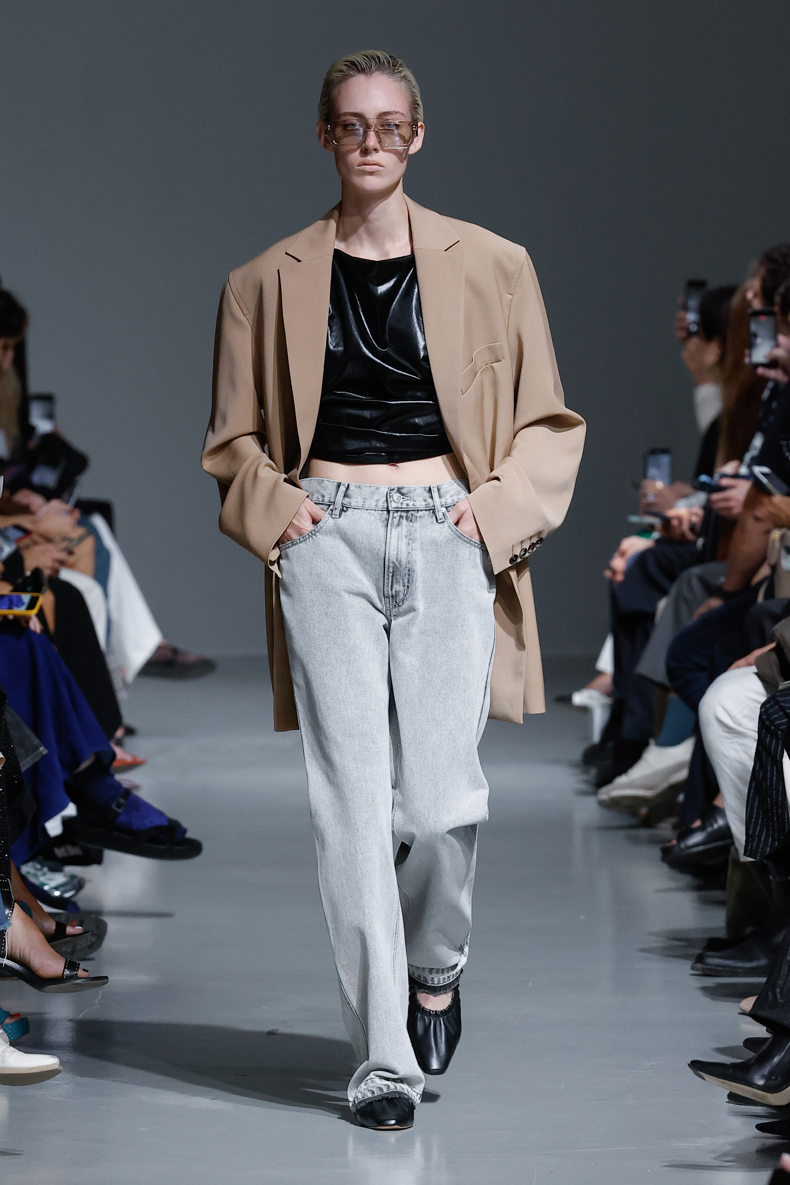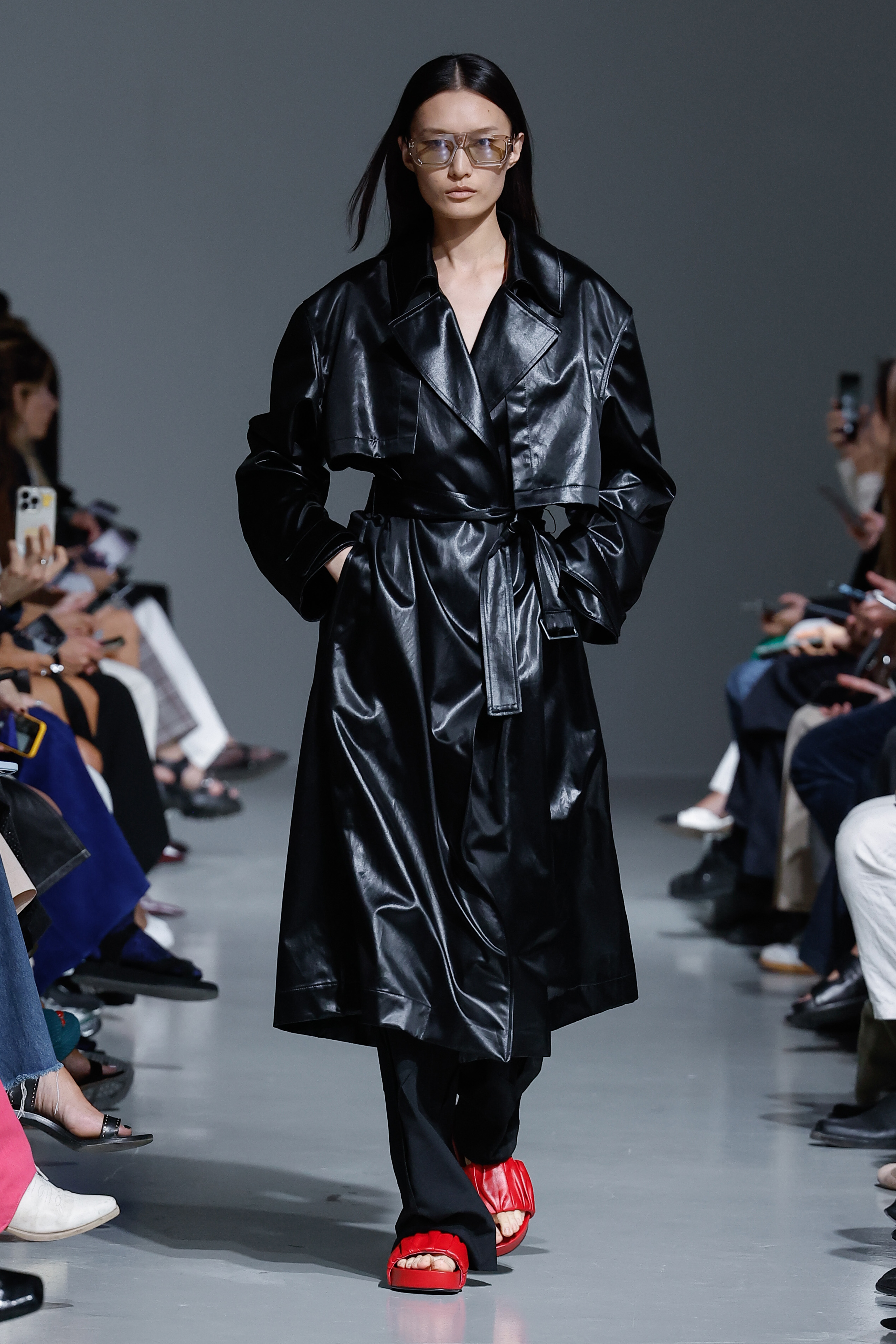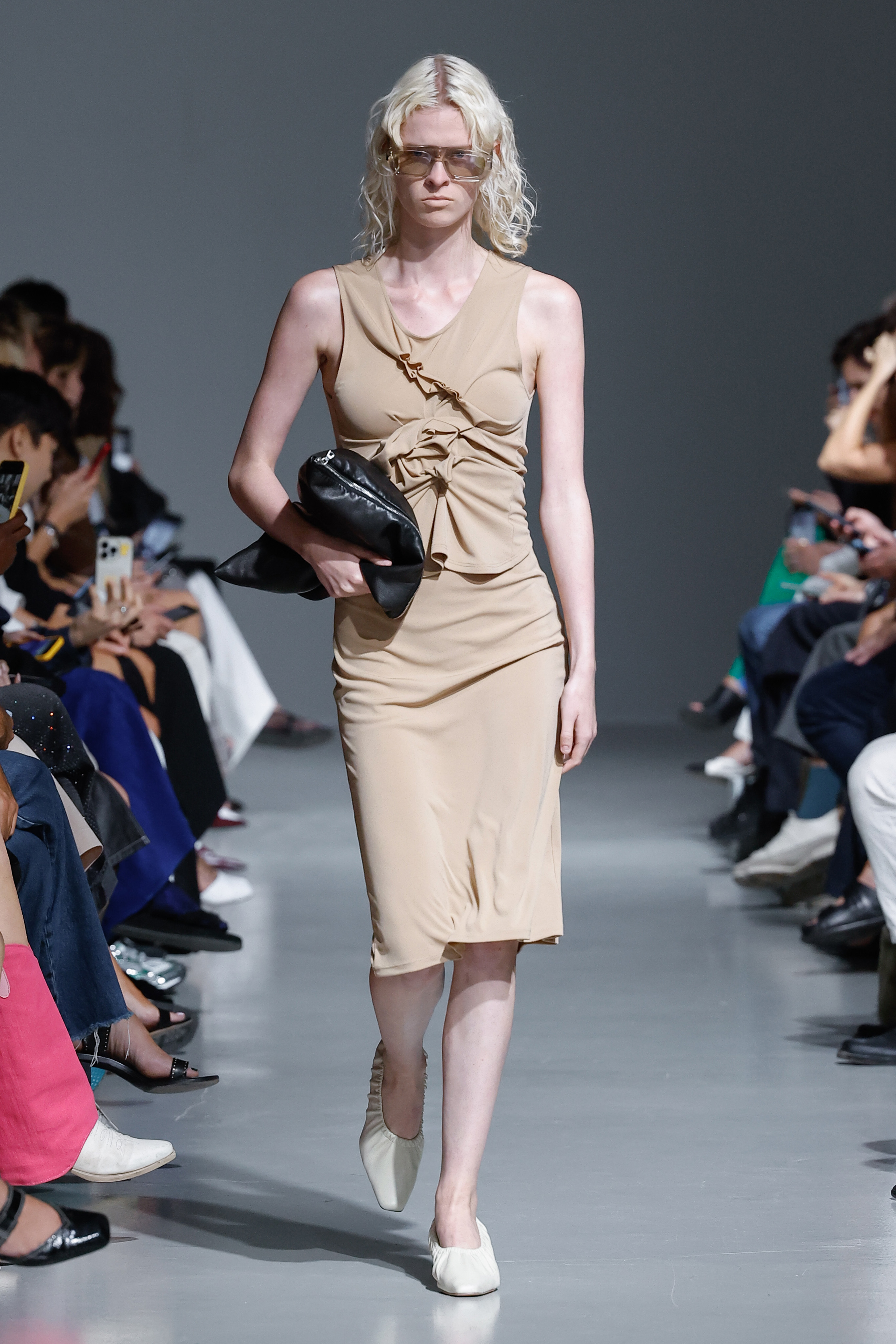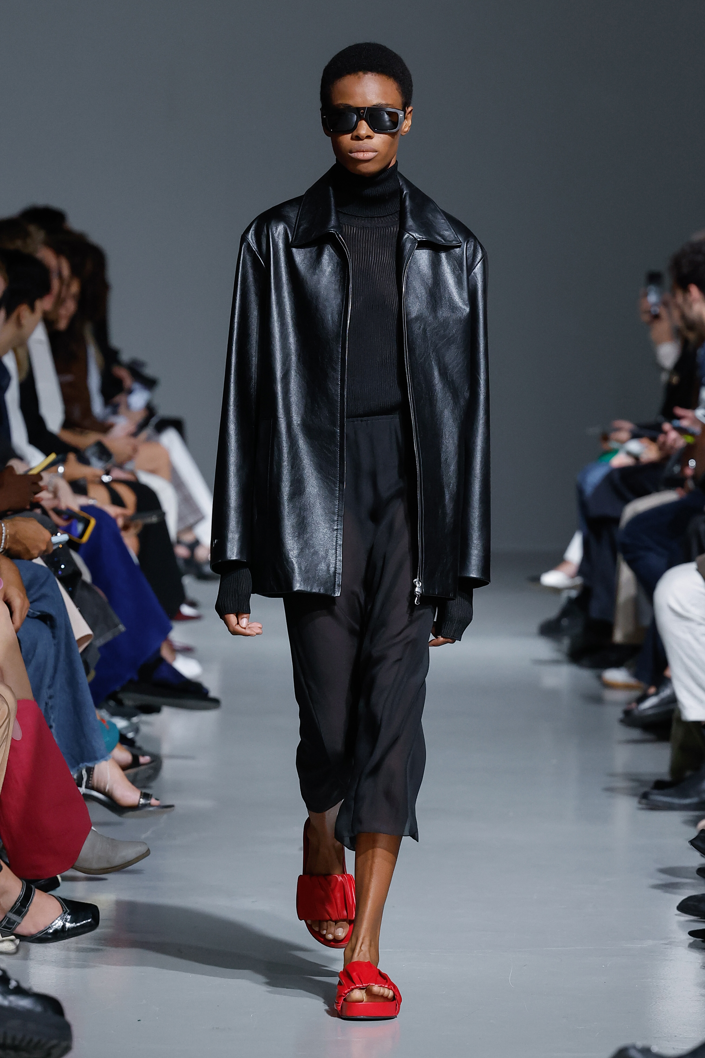Backless tops, slits in skirts and jackets are revealing the body. Ultra-short pants are paired with oversized blazers. A play between sheer silk mousseline and opaque leather stand in contrast within the same silhouette. Wrapped and pleated tank tops and skirts in jersey represent a certain disjointed connection. Dropped large shoulders paired with a rushing detail at the waist becomes an important silhouette for blazers, shirts, tops, and skirts. They come in summer wool, light cotton, silk, and transparent gaze.