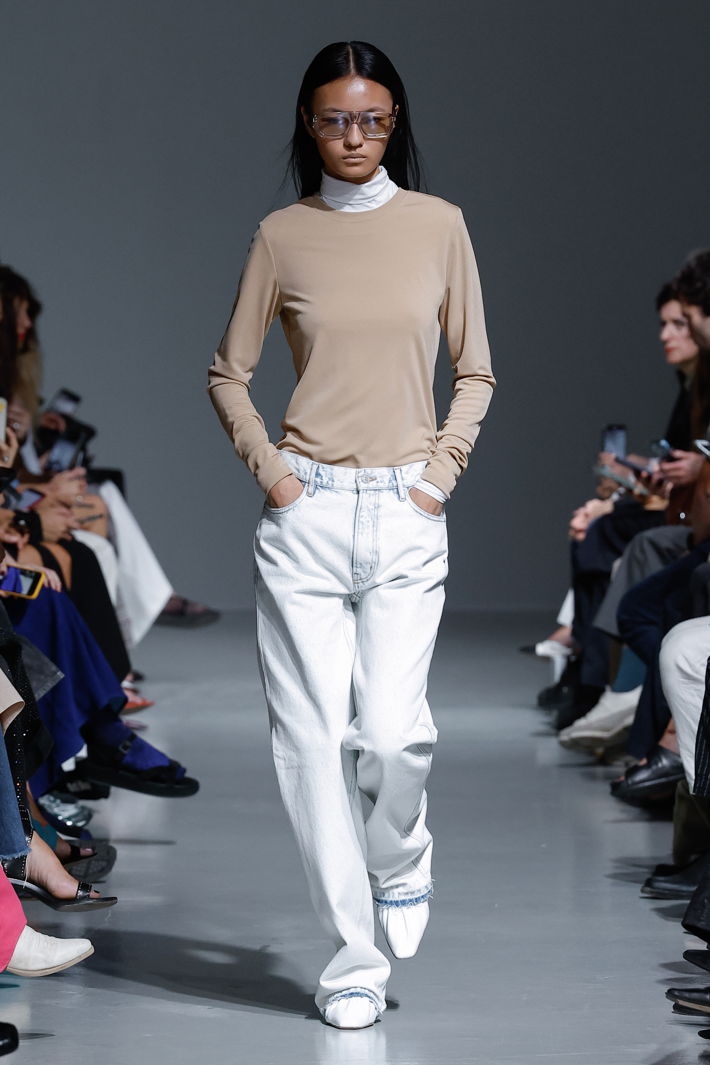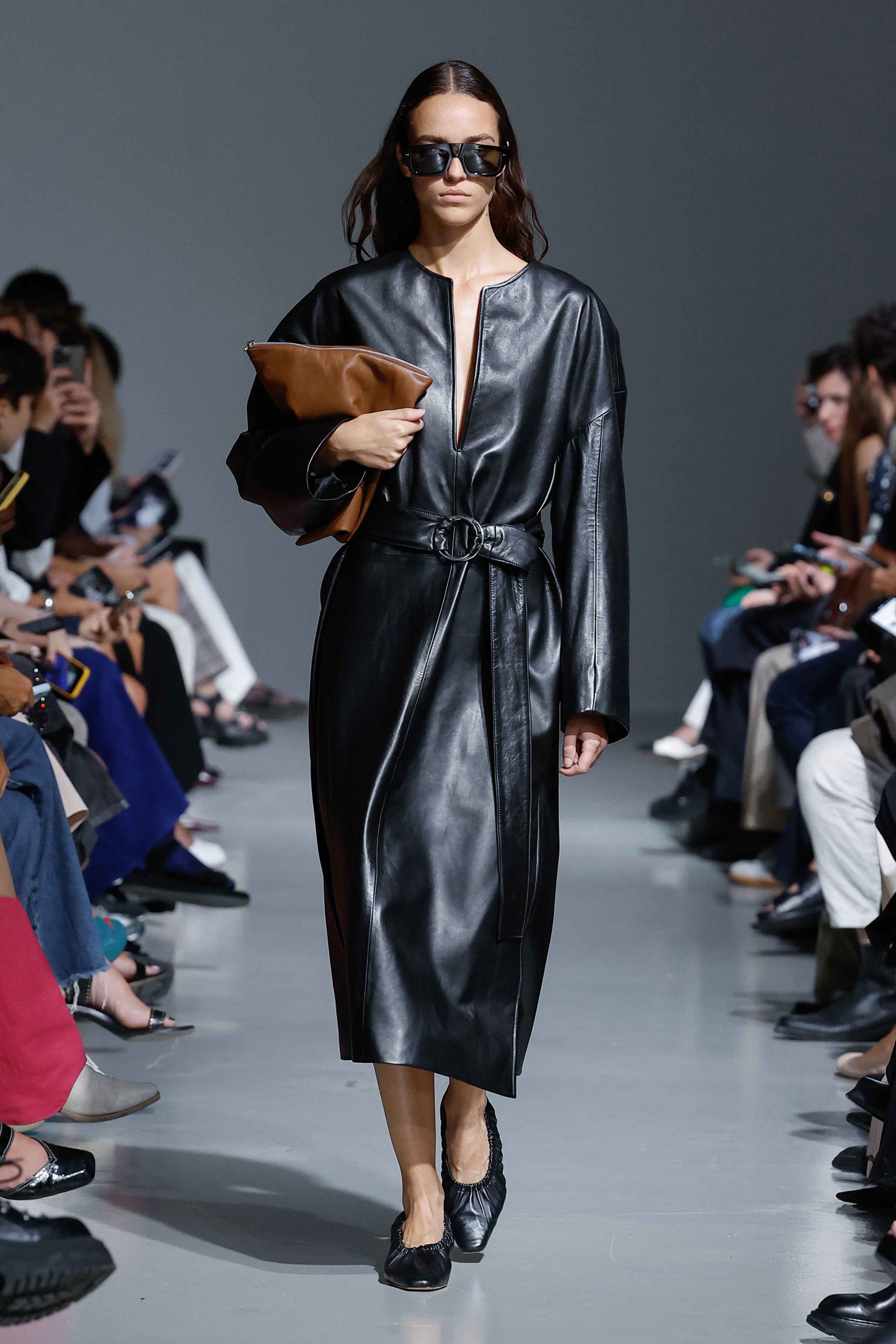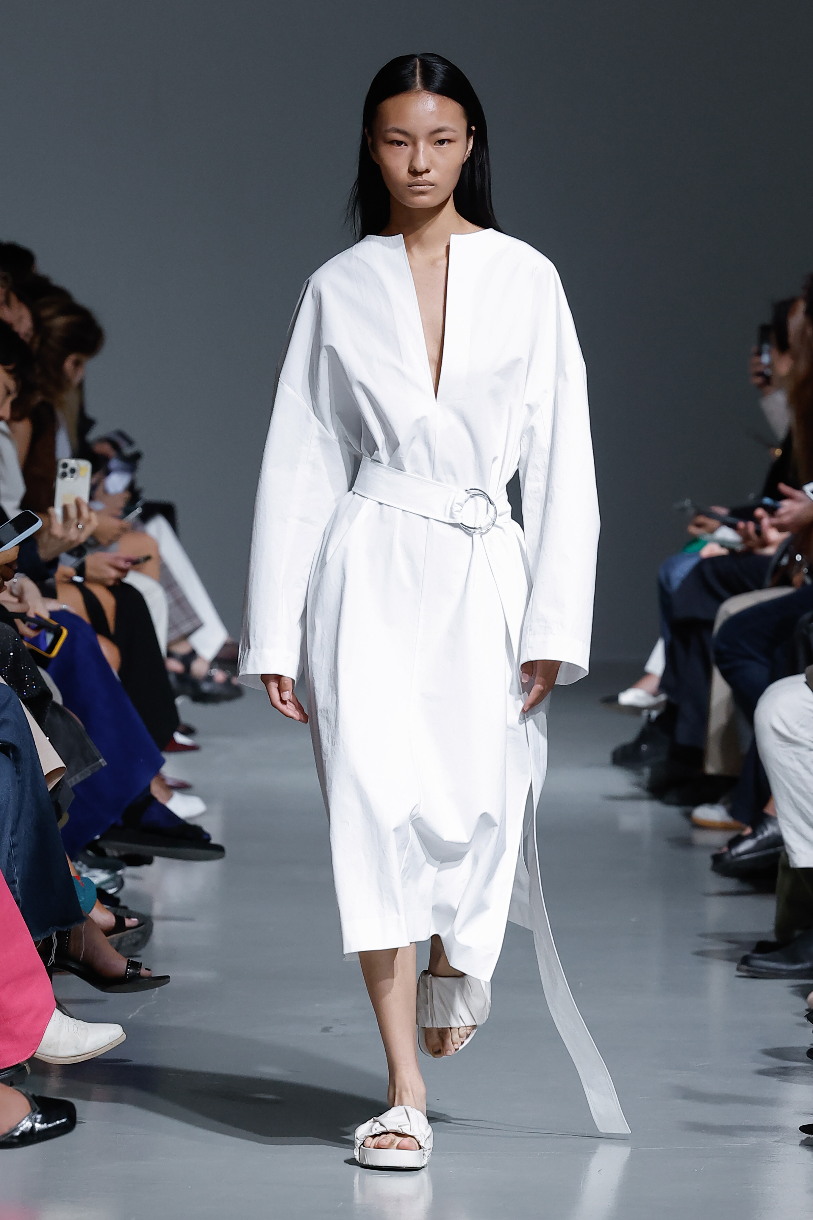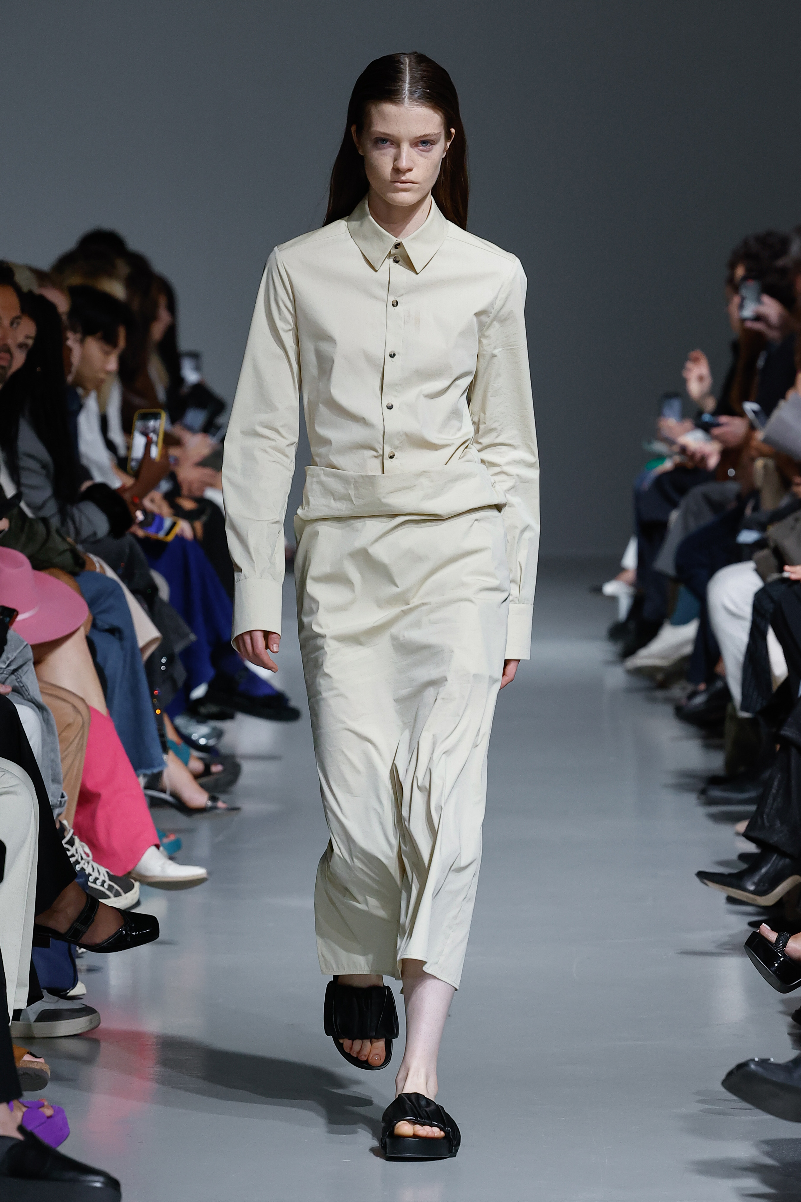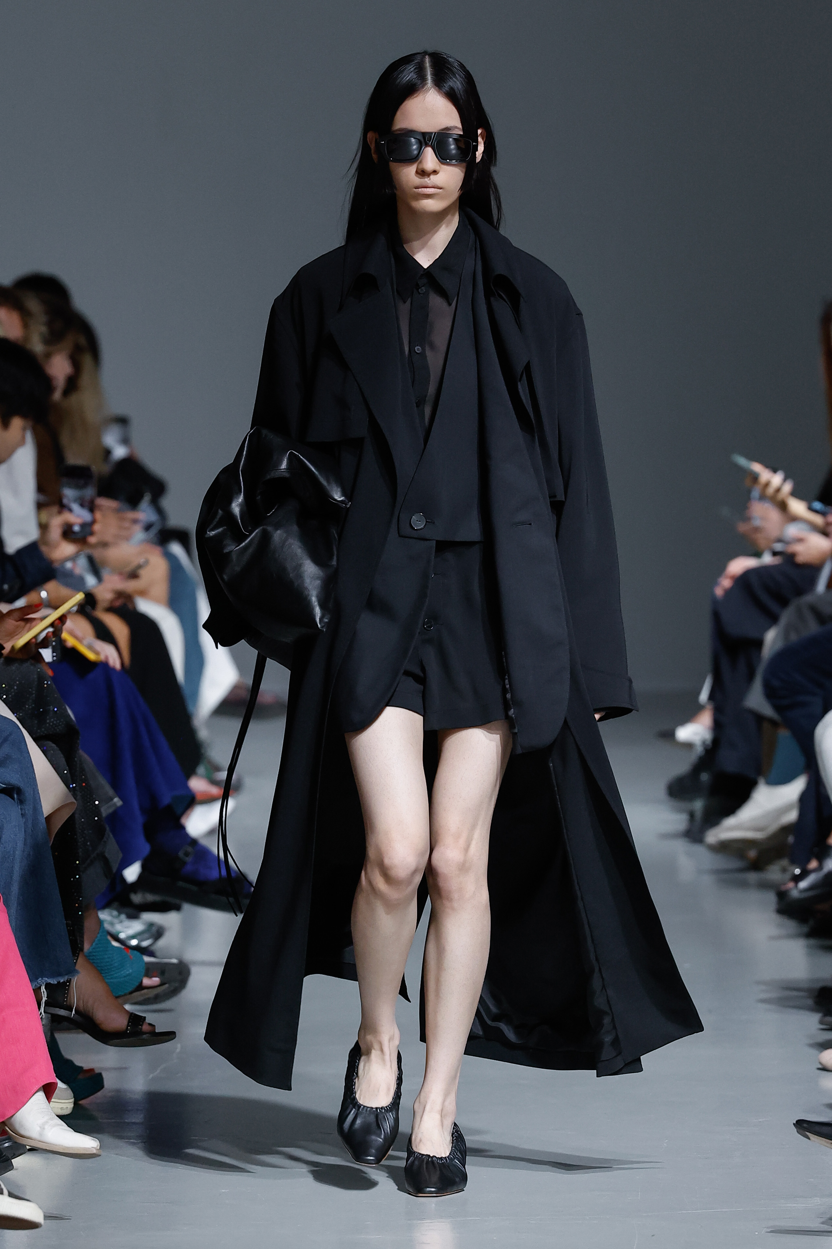 Backless tops, slits in skirts and jackets are revealing the body. Ultra-short pants are paired with oversized blazers. A play between sheer silk mousseline and opaque leather stand in contrast within the same silhouette. Wrapped and pleated tank tops and skirts in jersey represent a certain disjointed connection. Dropped large shoulders paired with a rushing detail at the waist becomes an important silhouette for blazers, shirts, tops, and skirts. They come in summer wool, light cotton, silk, and transparent gaze.