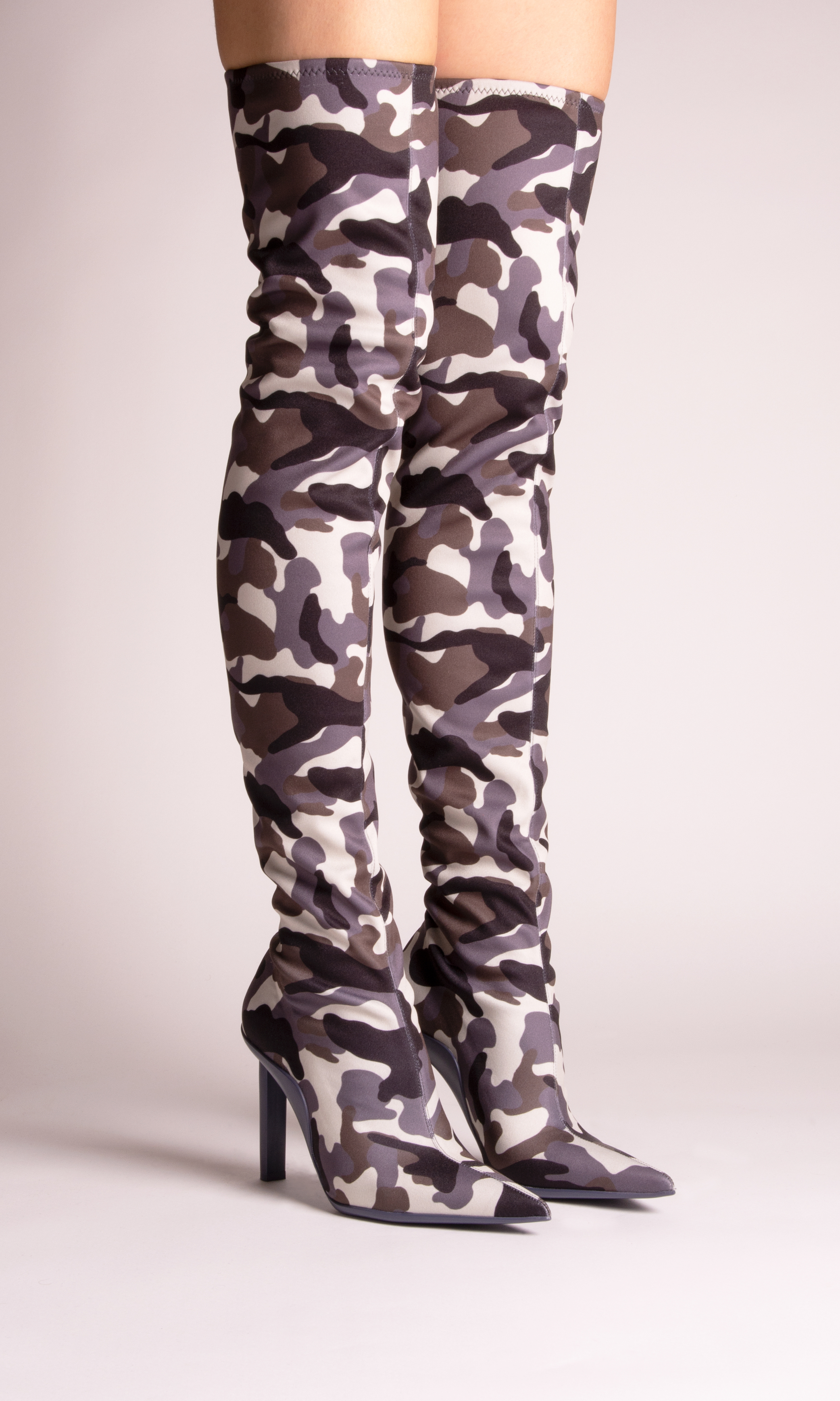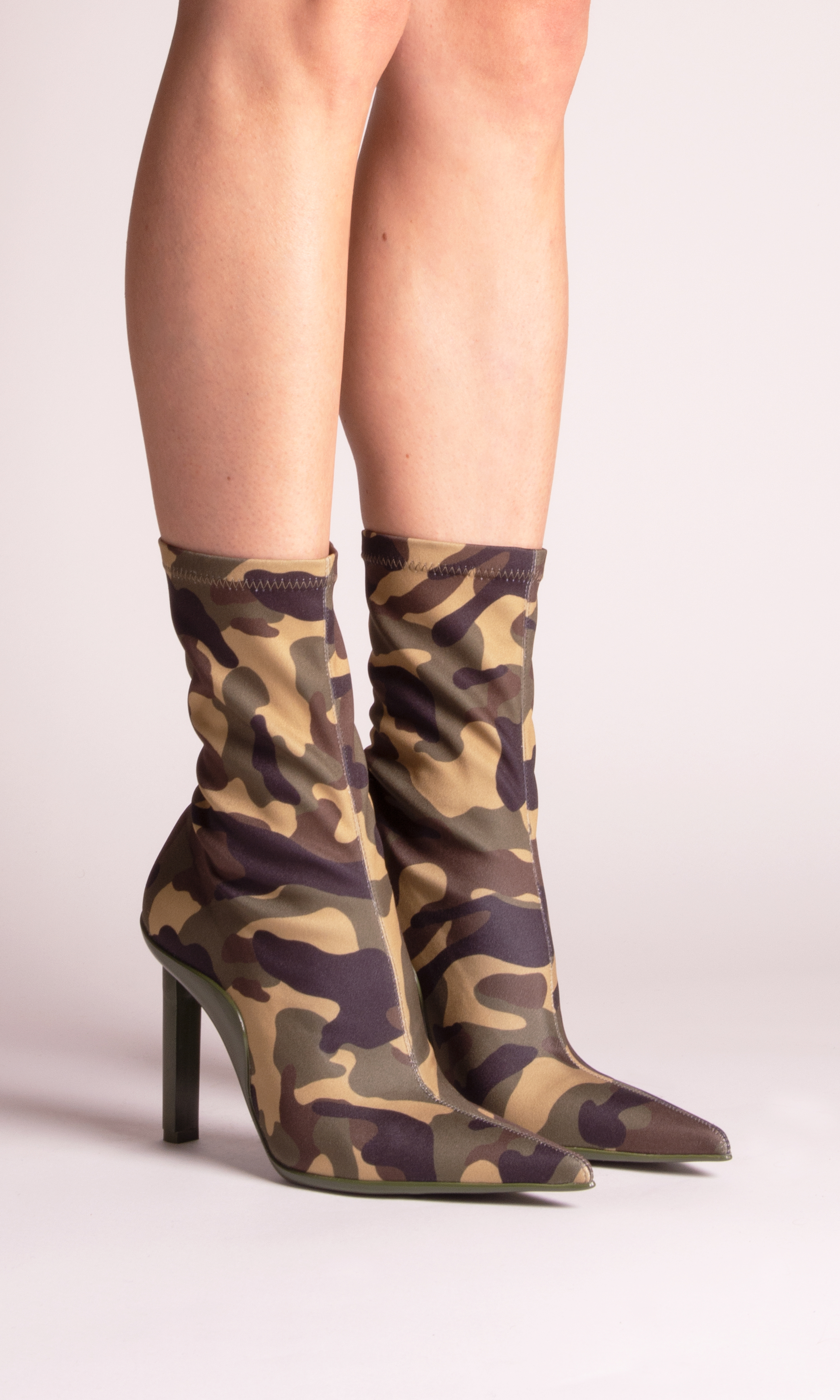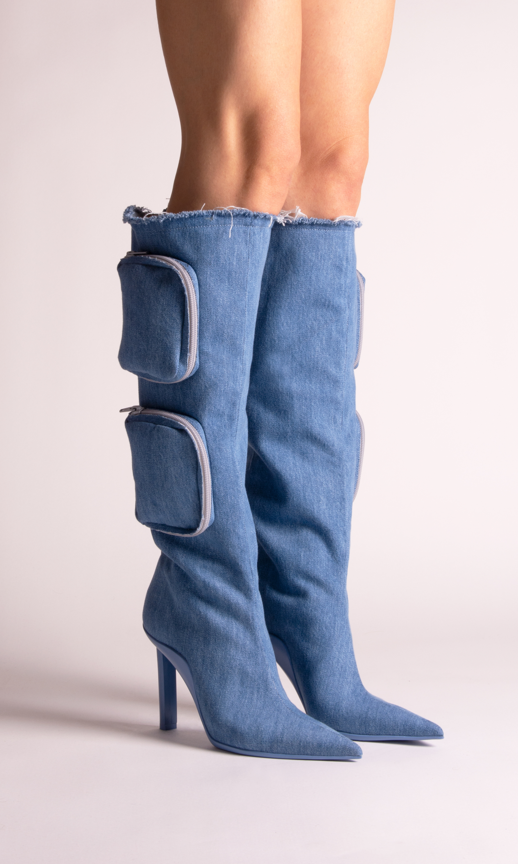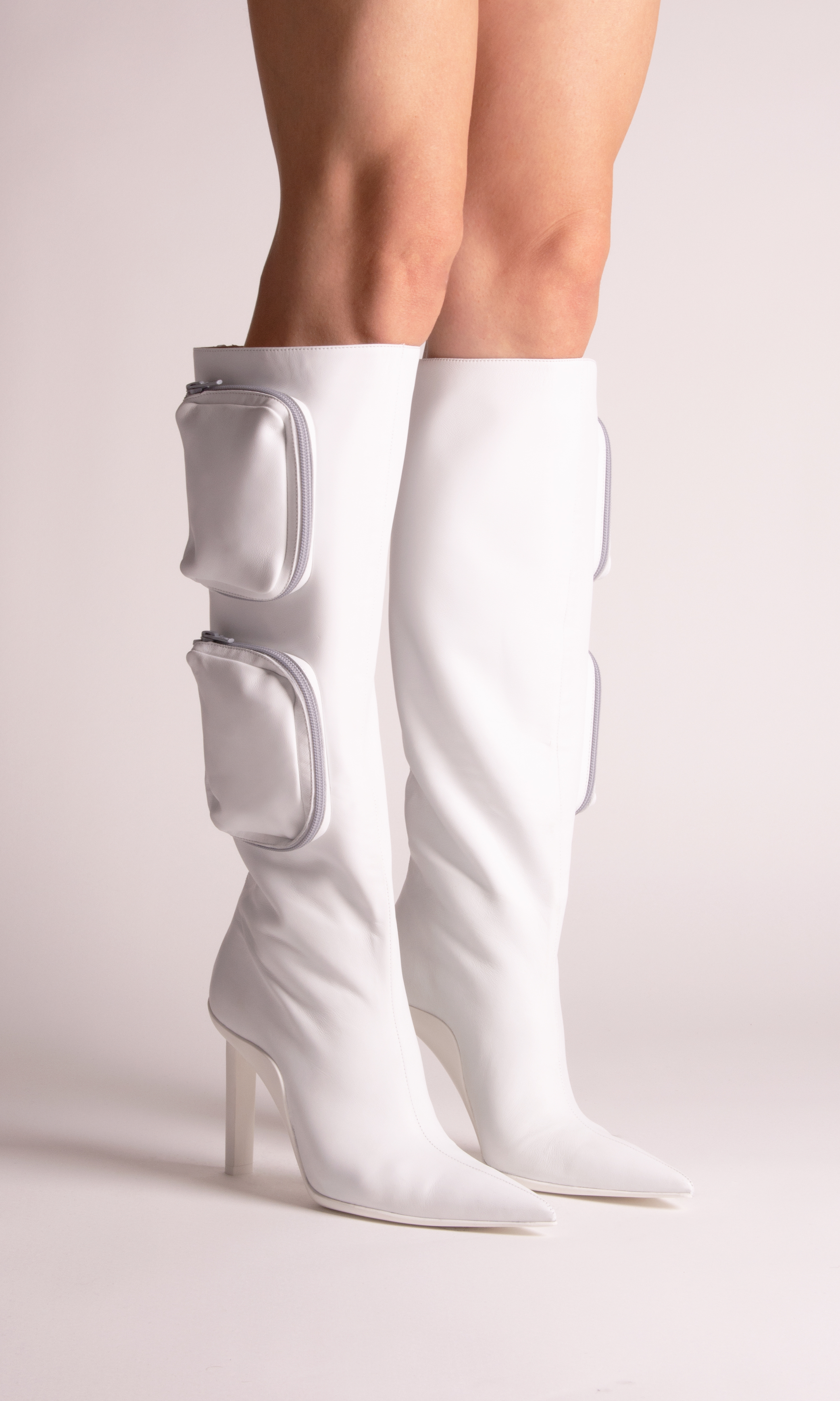 Expressing GIABORGHINI’s most feminine attitude, a geometric high heel defines a selection of sexy shoes. They span from pointed pumps and second-skin booties, to two boots: a stretchy over-the-knee style and a knee-length variation embellished with cargo pockets for a utility vibe.