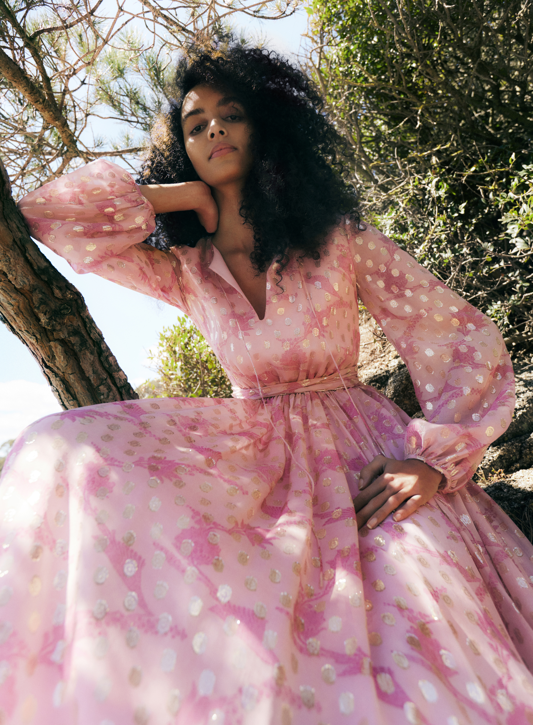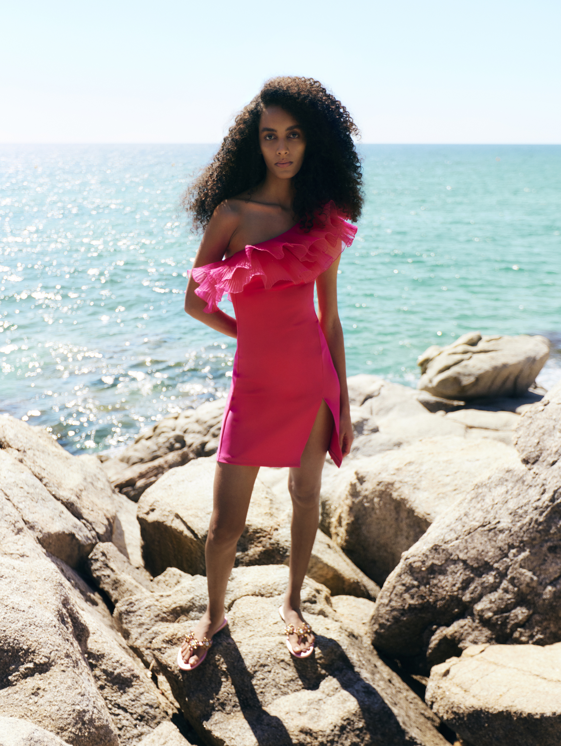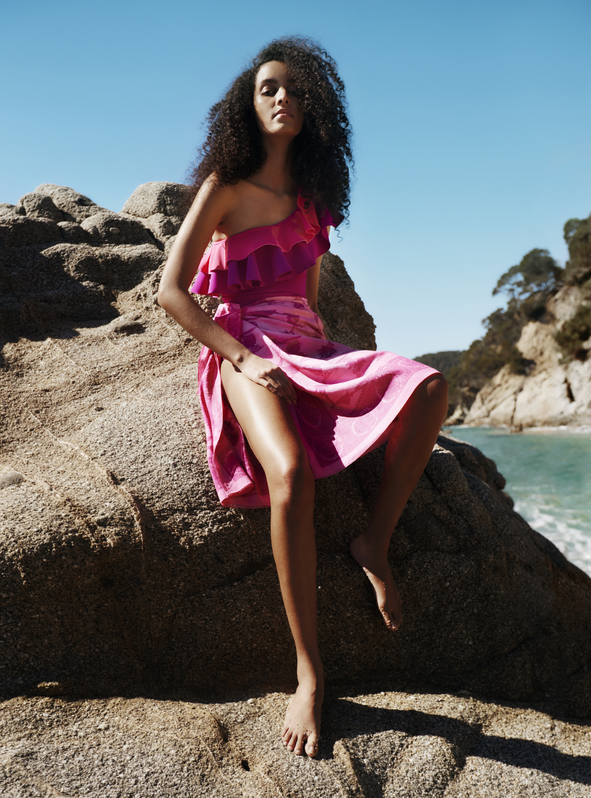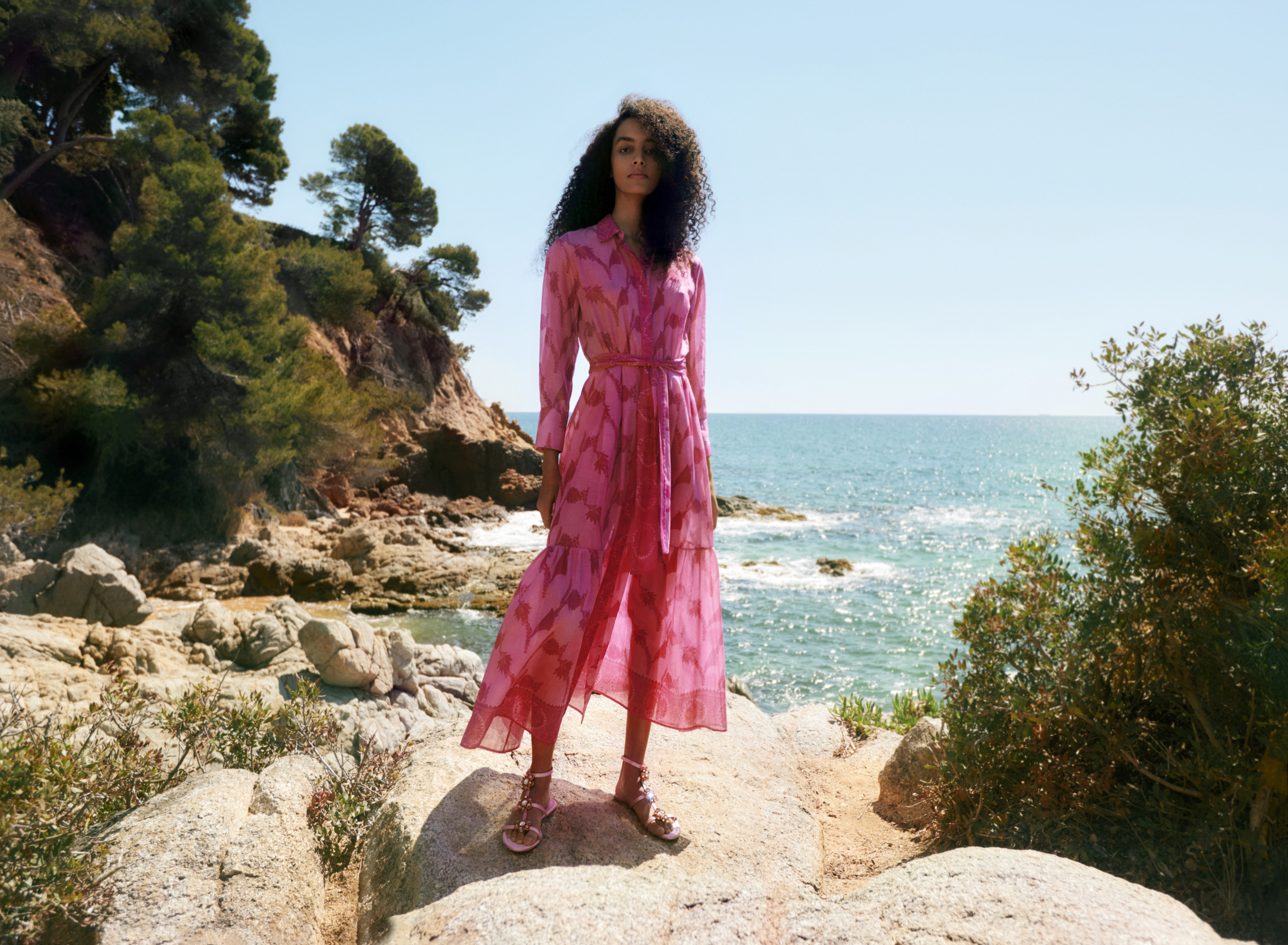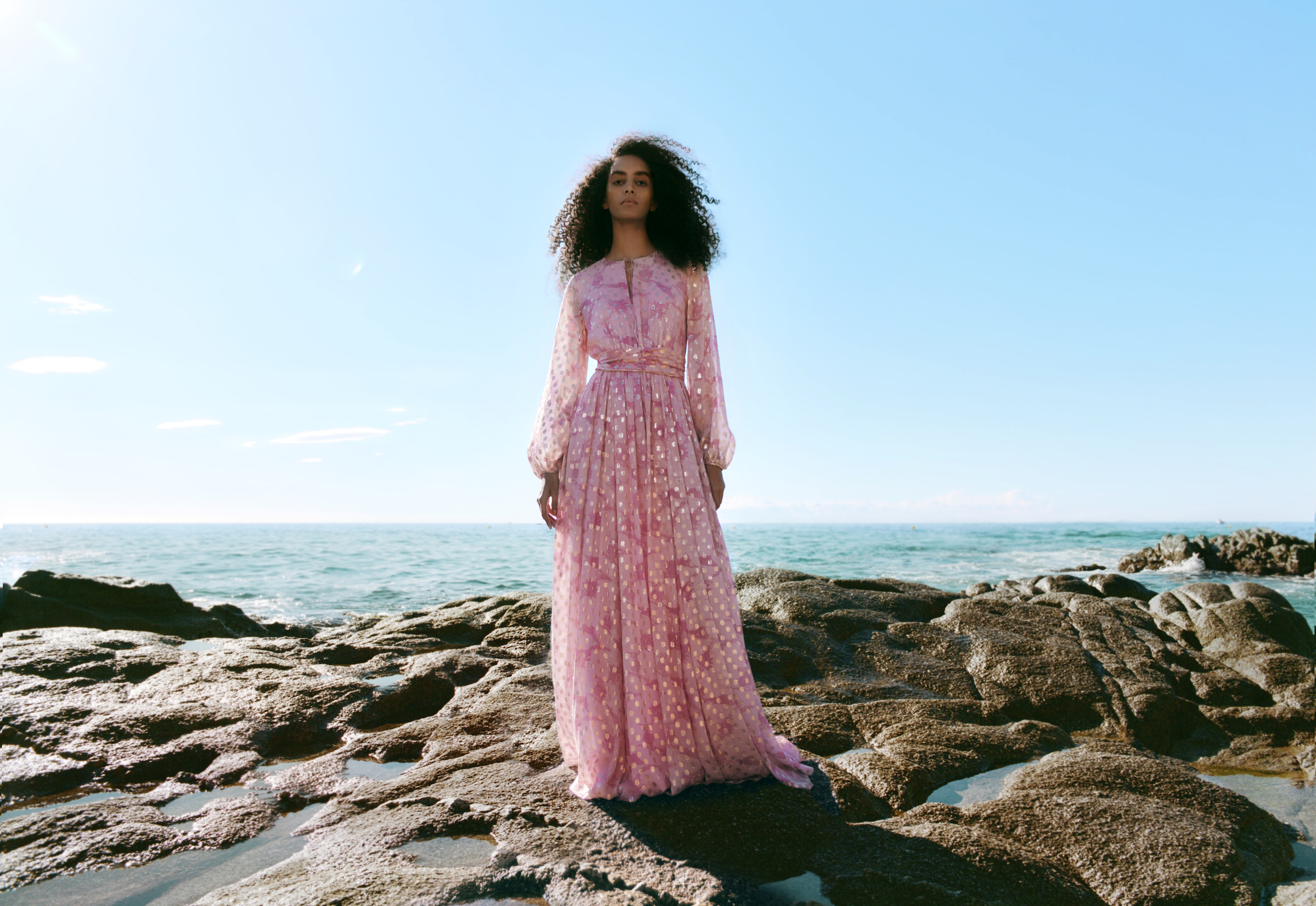 The brand’s signature details and silhouettes have been reimagined in fuchsia and pale pink to create modern, feminine pieces for lush getaways and summer occasions. The capsule includes a ruffled swimsuit and mini-dress, printed light cotton beachwear and three evening dresses crafted from beautiful silk and gold lurex fil coupé.