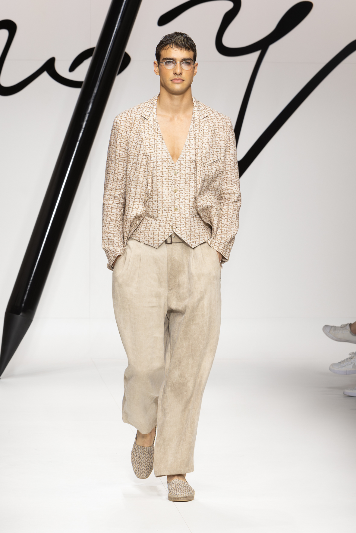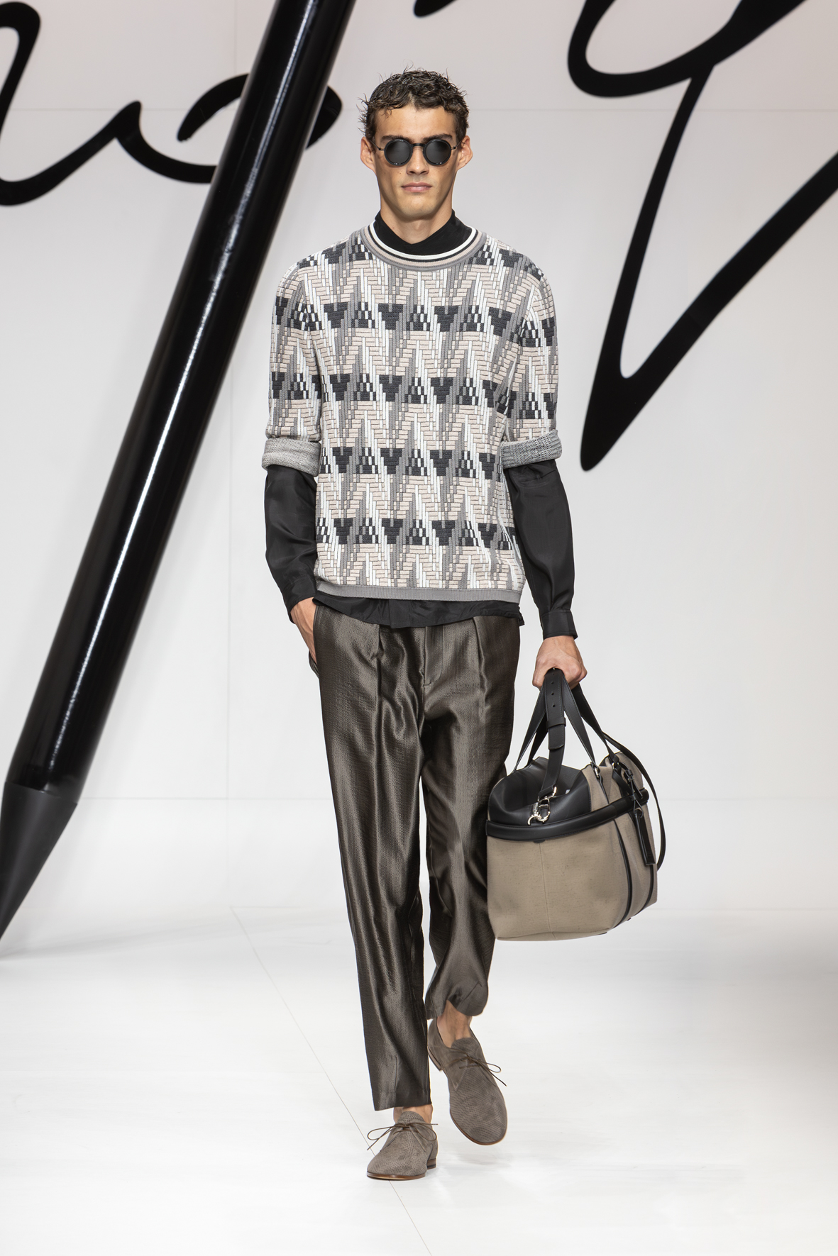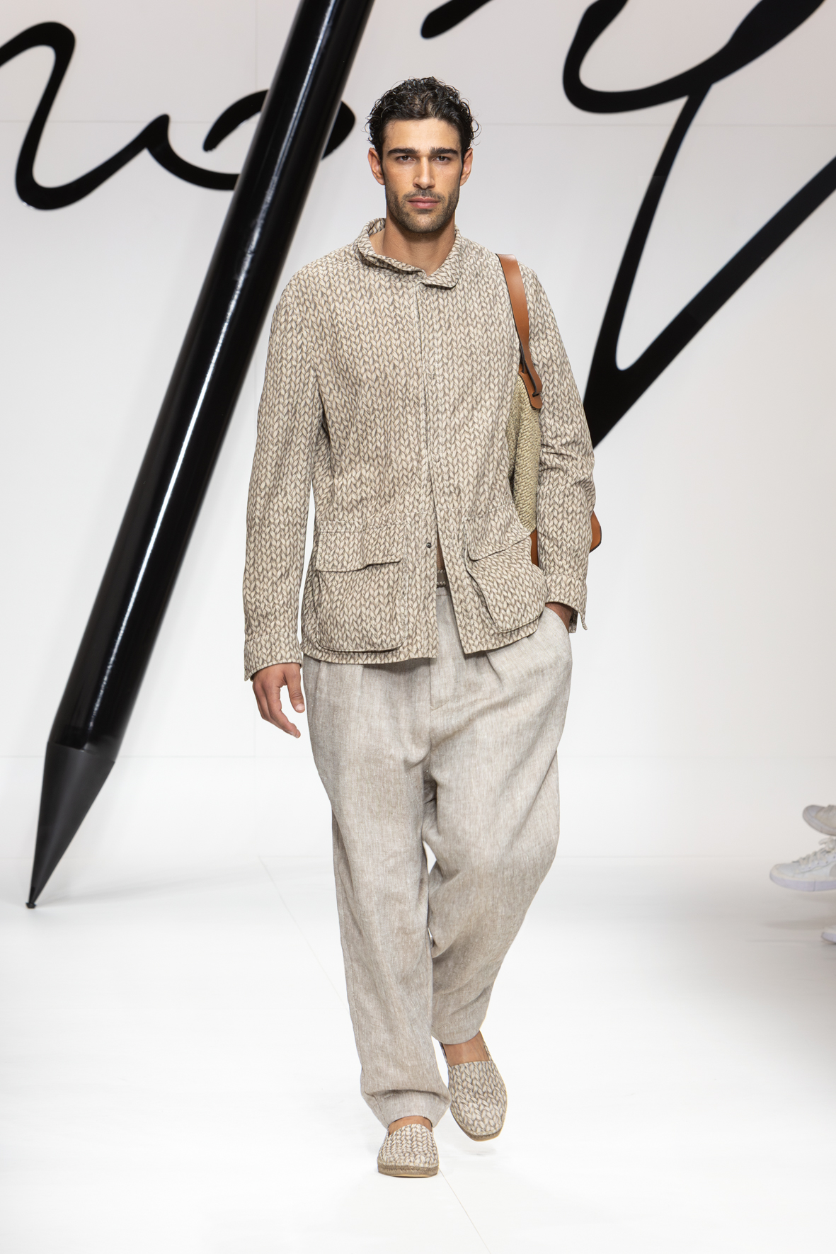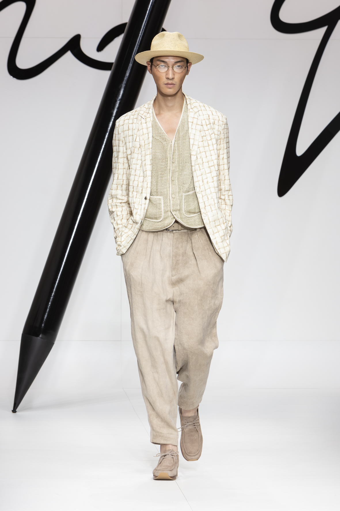 Narrating a certain style is a constant process of writing and rewriting. It involves examining familiar elements from different angles to craft new plots and weave new stories. Giorgio Armani’s story always stems from the same unwavering urgency: to clothe the present with a vibrant, authentic sign fashioned from dignity and elegance. This collection reiterates the code while weaving a new storyline: forms are soft and lengthened, intertwining threads either actually woven or evoked in prints that imitate knots, weaves with a summery feel, and geometric motifs for rhythm.