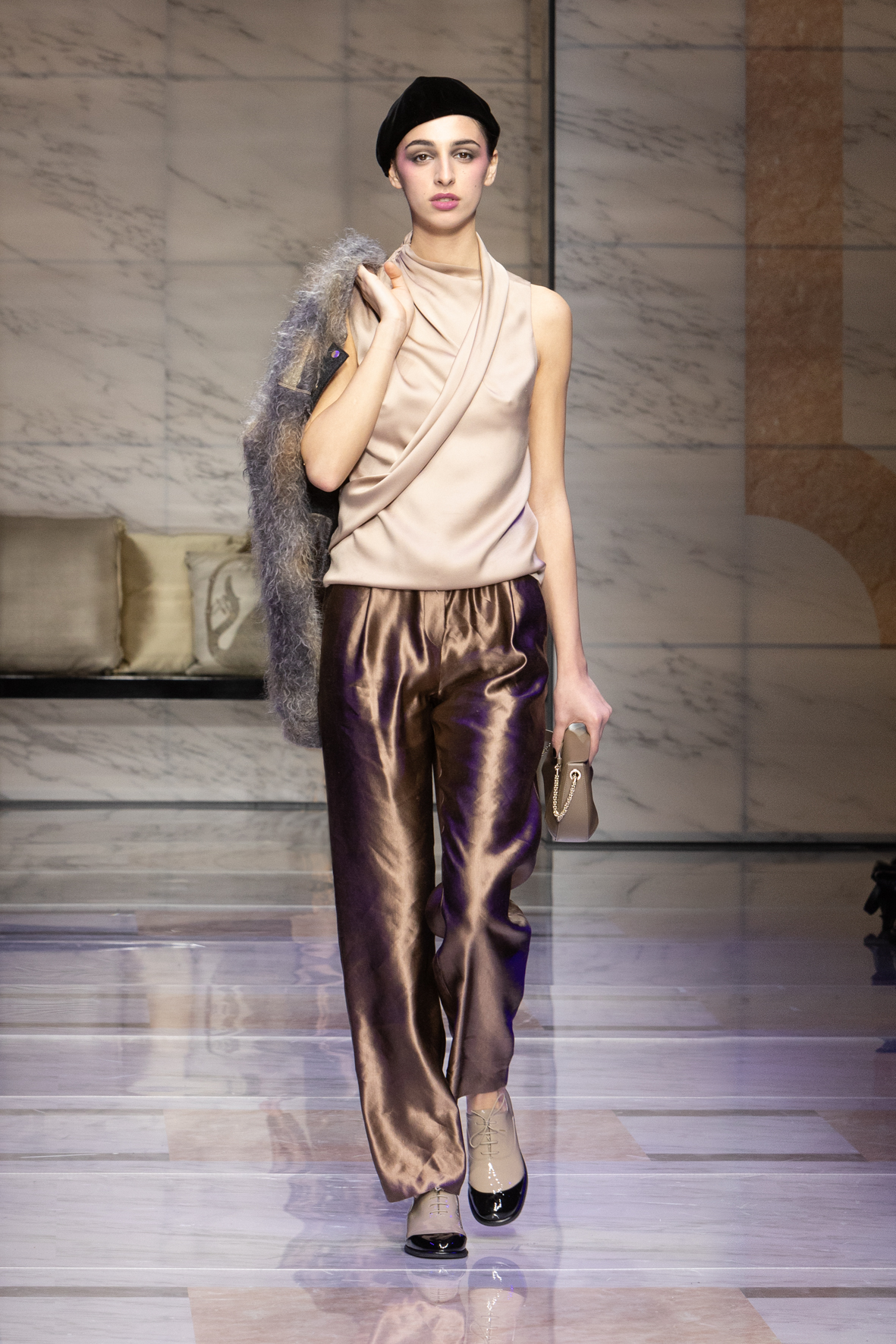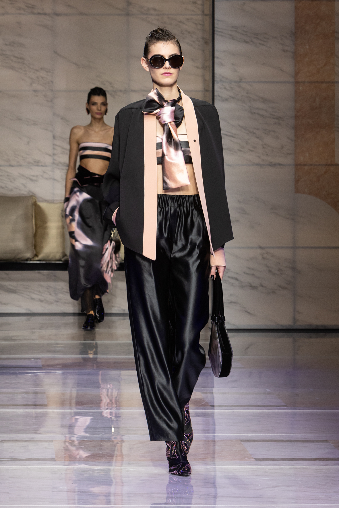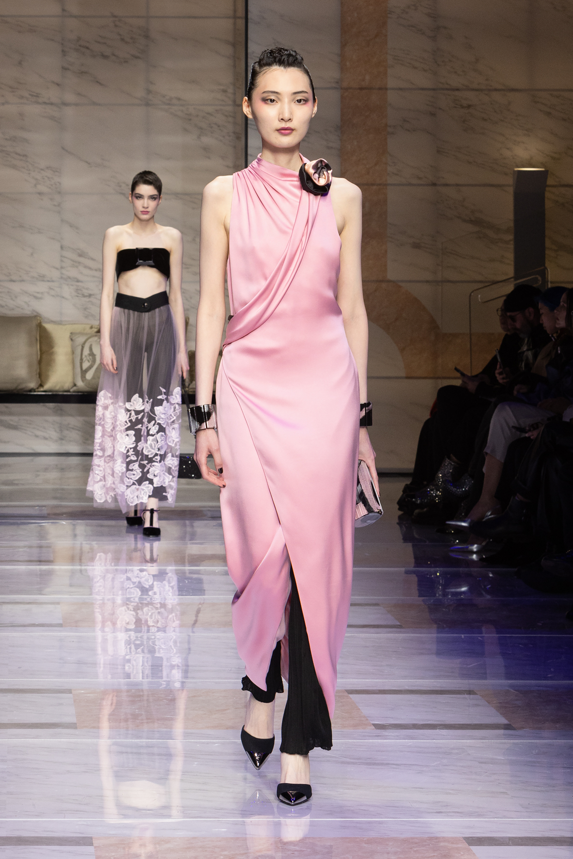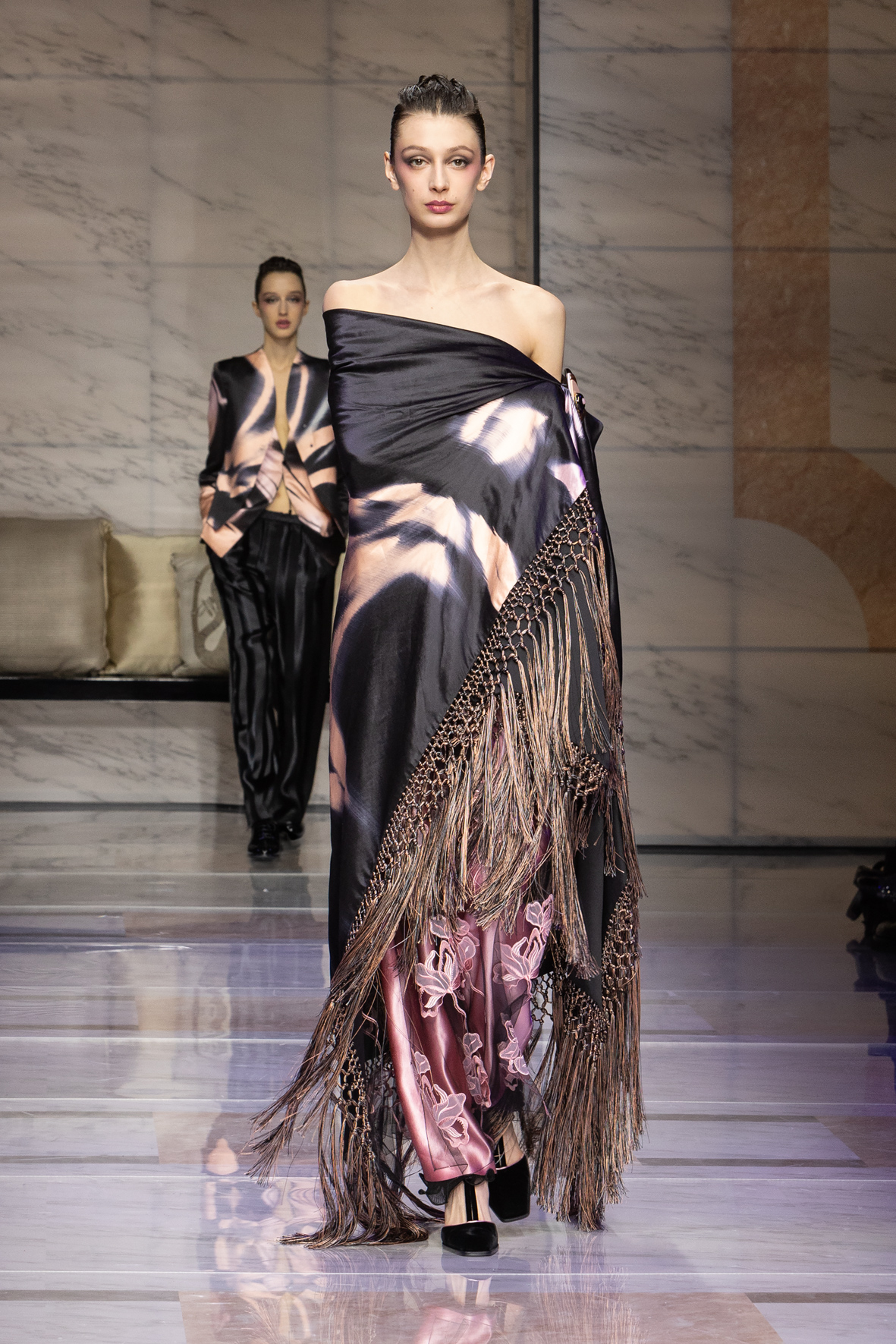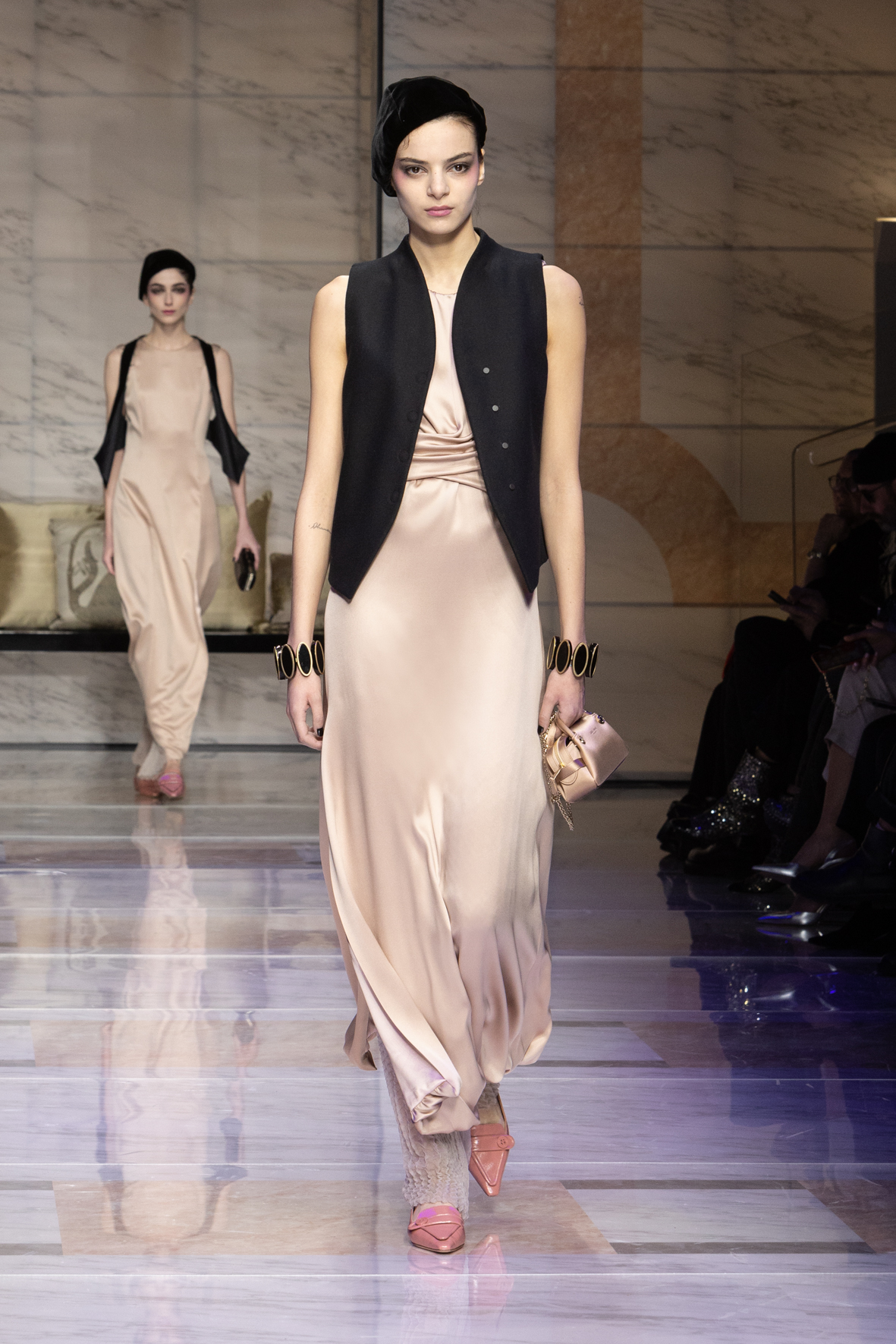 Having crossed the threshold of the Milanese palazzos, hinted to by the elegant marble setting and the harmonious colours and spaces, guests are welcomed into a domestic dimension evoked by the presence of sofa cushions. It feels like a living room, a place for dialogue and socialising, and the wardrobe that accompanies this idea of gentle domesticity is fluid and sublime.
