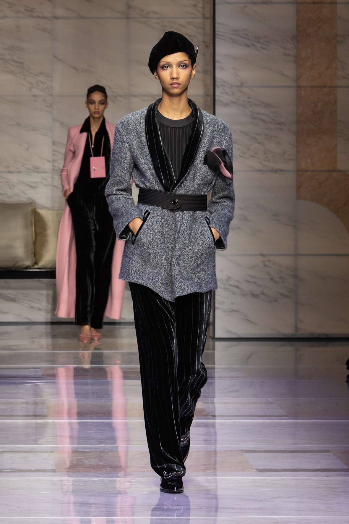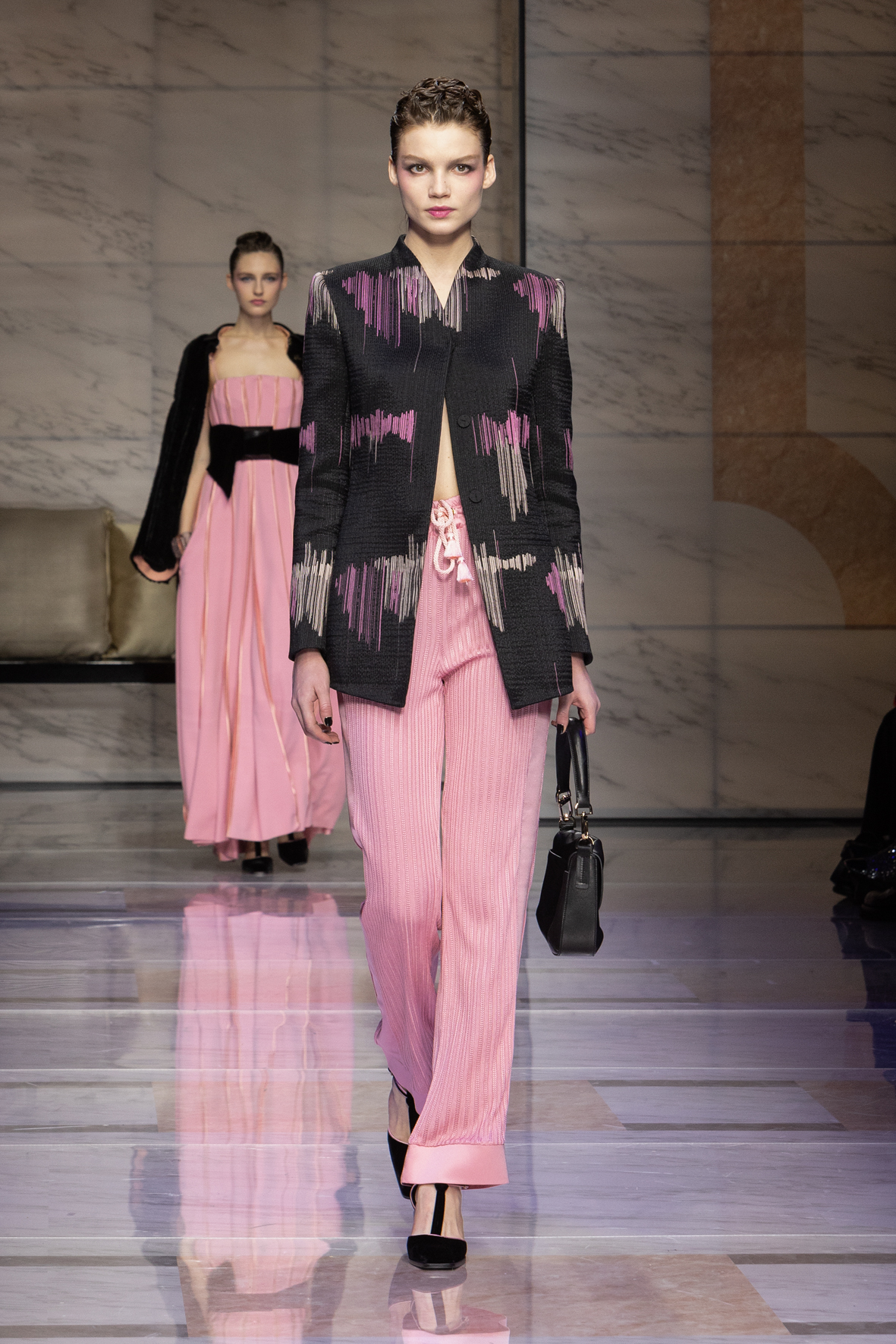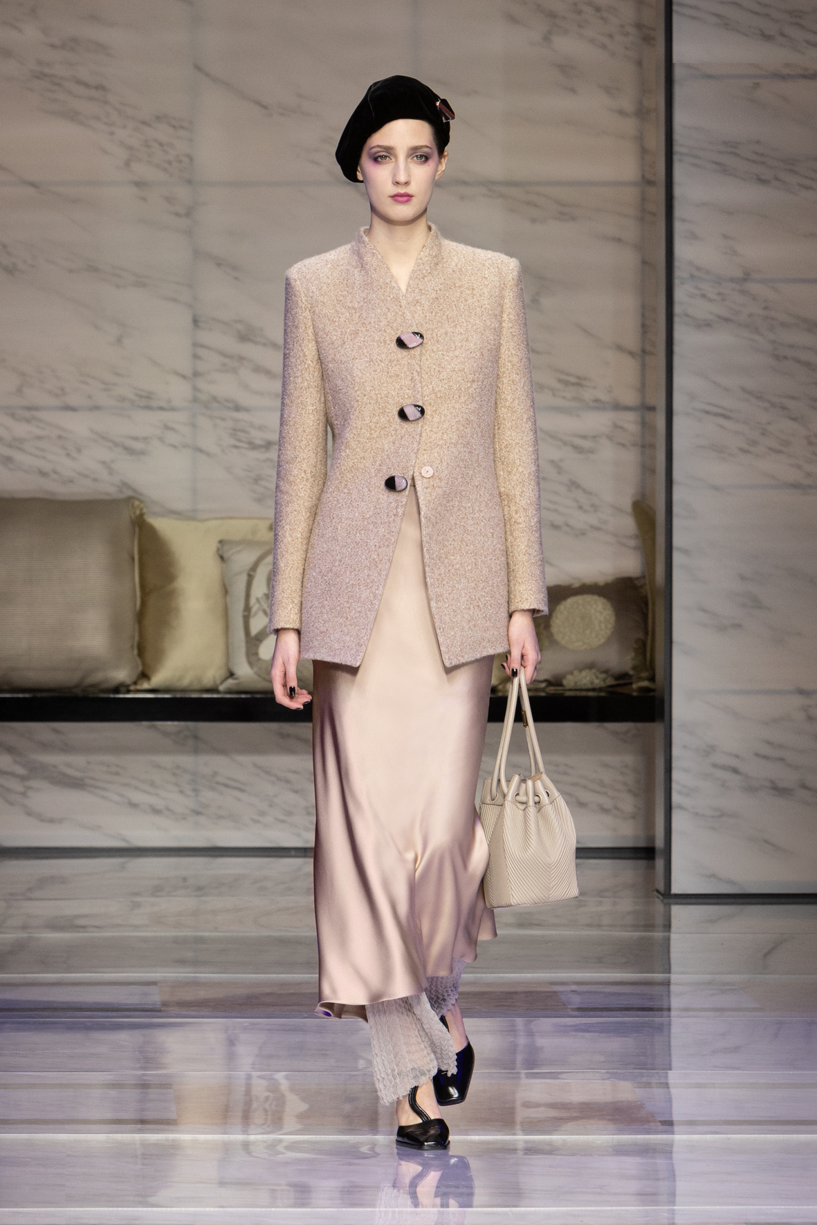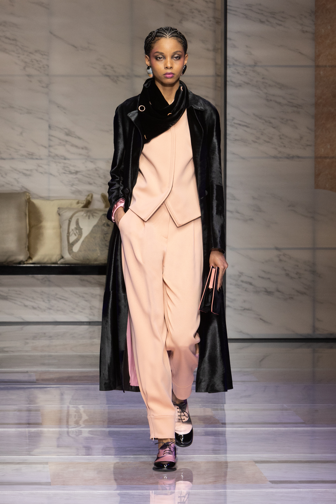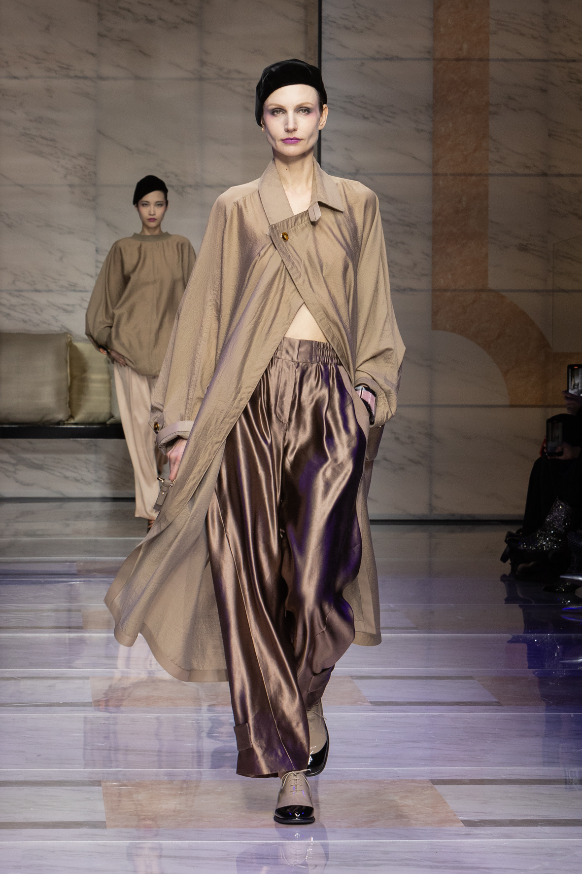 Having crossed the threshold of the Milanese palazzos, hinted to by the elegant marble setting and the harmonious colours and spaces, guests are welcomed into a domestic dimension evoked by the presence of sofa cushions. It feels like a living room, a place for dialogue and socialising, and the wardrobe that accompanies this idea of gentle domesticity is fluid and sublime.