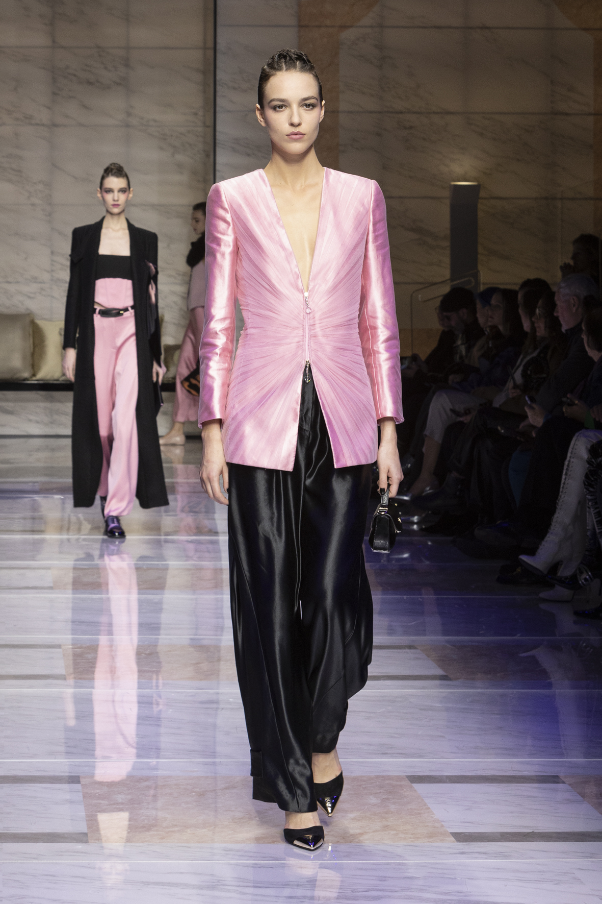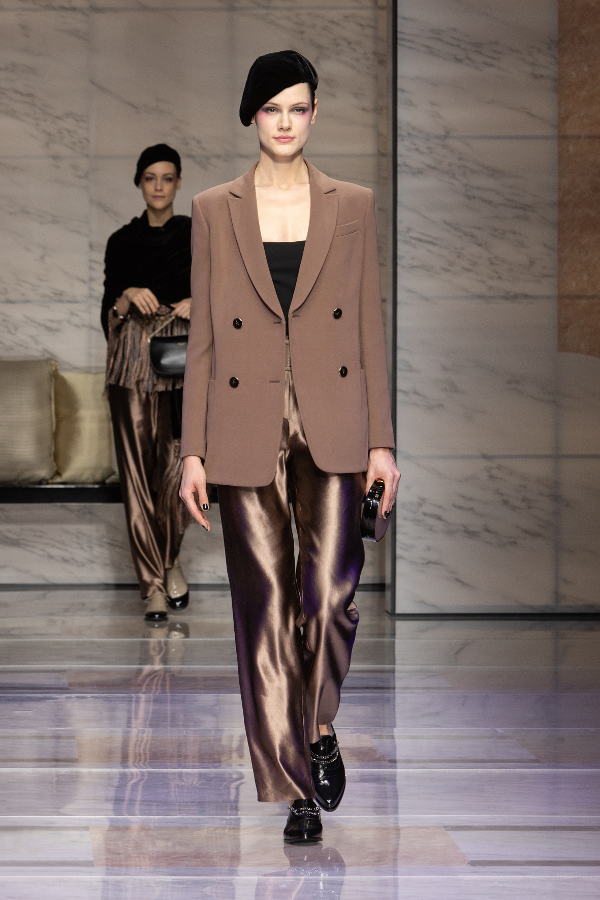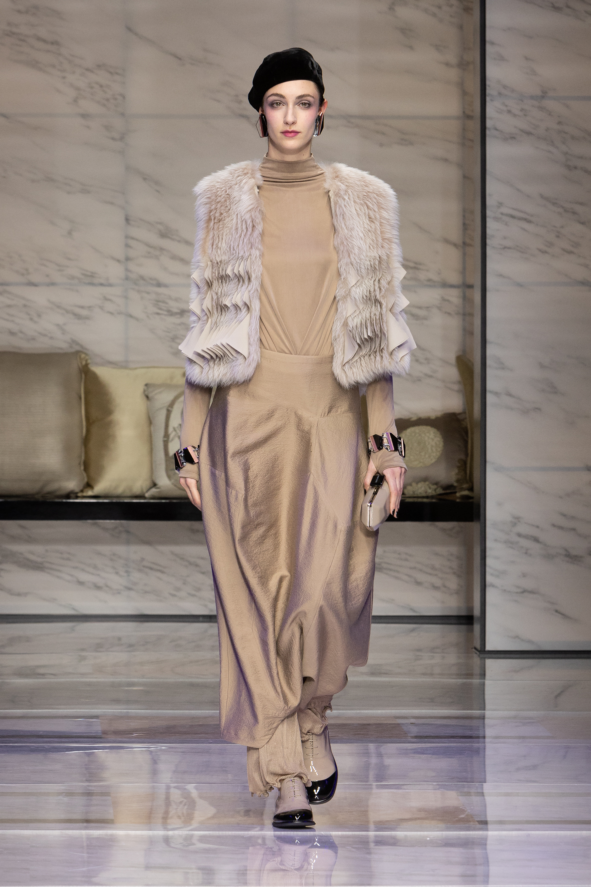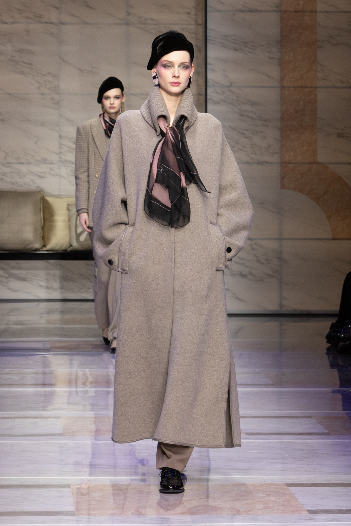 Having crossed the threshold of the Milanese palazzos, hinted to by the elegant marble setting and the harmonious colours and spaces, guests are welcomed into a domestic dimension evoked by the presence of sofa cushions. It feels like a living room, a place for dialogue and socialising, and the wardrobe that accompanies this idea of gentle domesticity is fluid and sublime.
