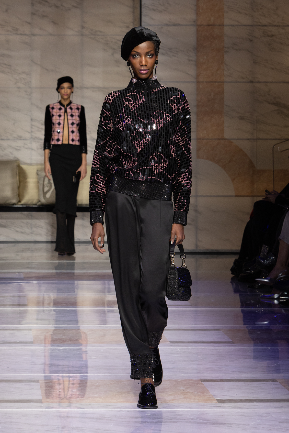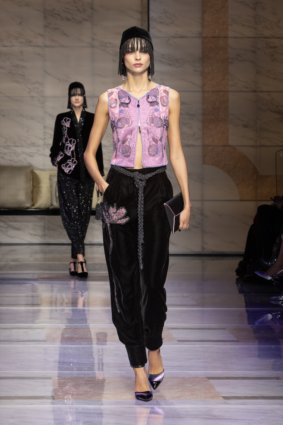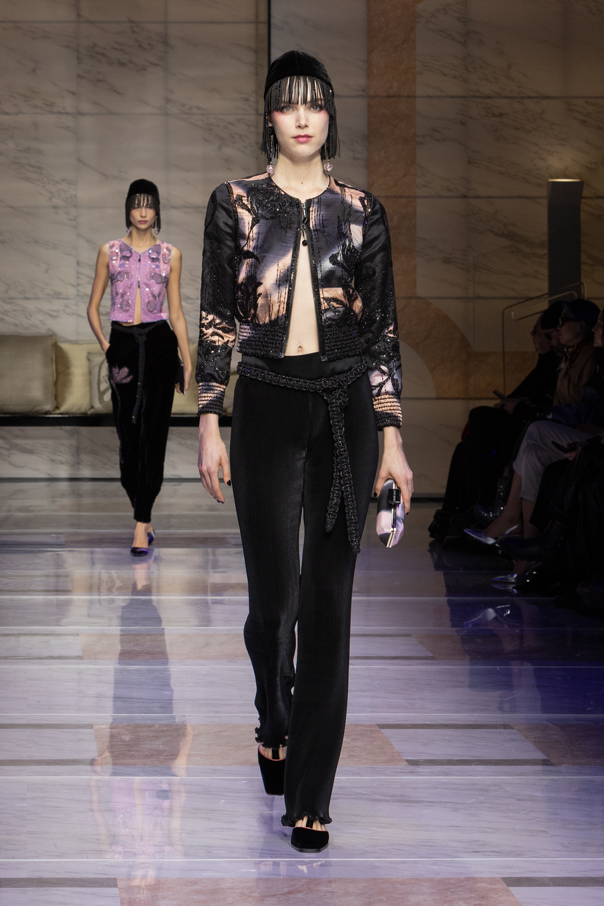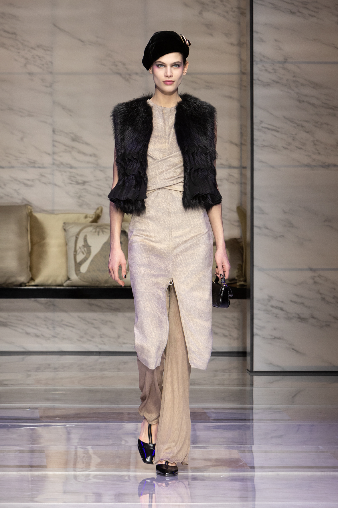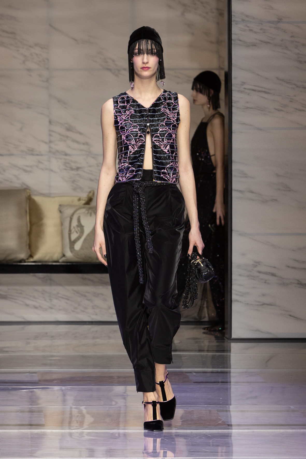 Having crossed the threshold of the Milanese palazzos, hinted to by the elegant marble setting and the harmonious colours and spaces, guests are welcomed into a domestic dimension evoked by the presence of sofa cushions. It feels like a living room, a place for dialogue and socialising, and the wardrobe that accompanies this idea of gentle domesticity is fluid and sublime.