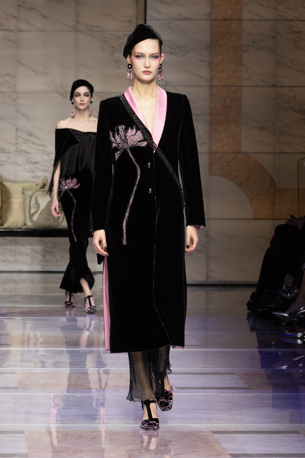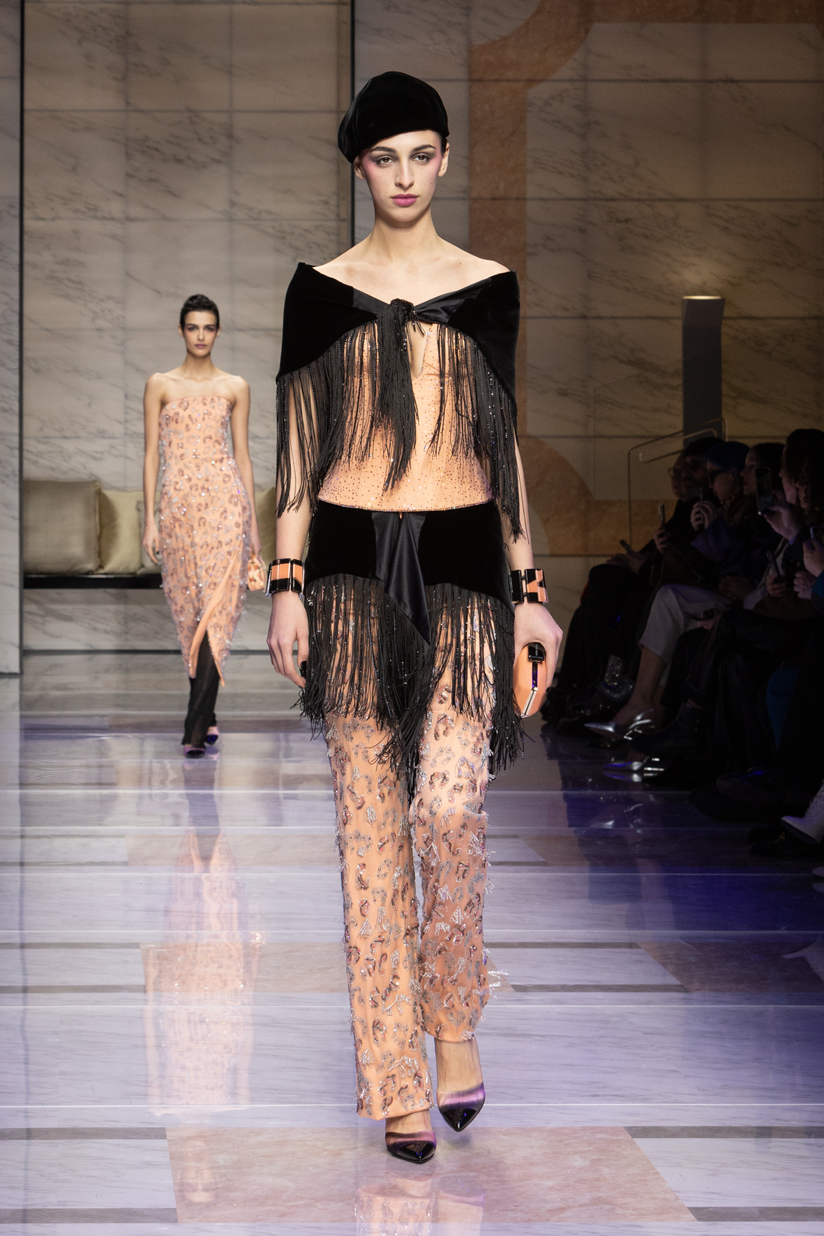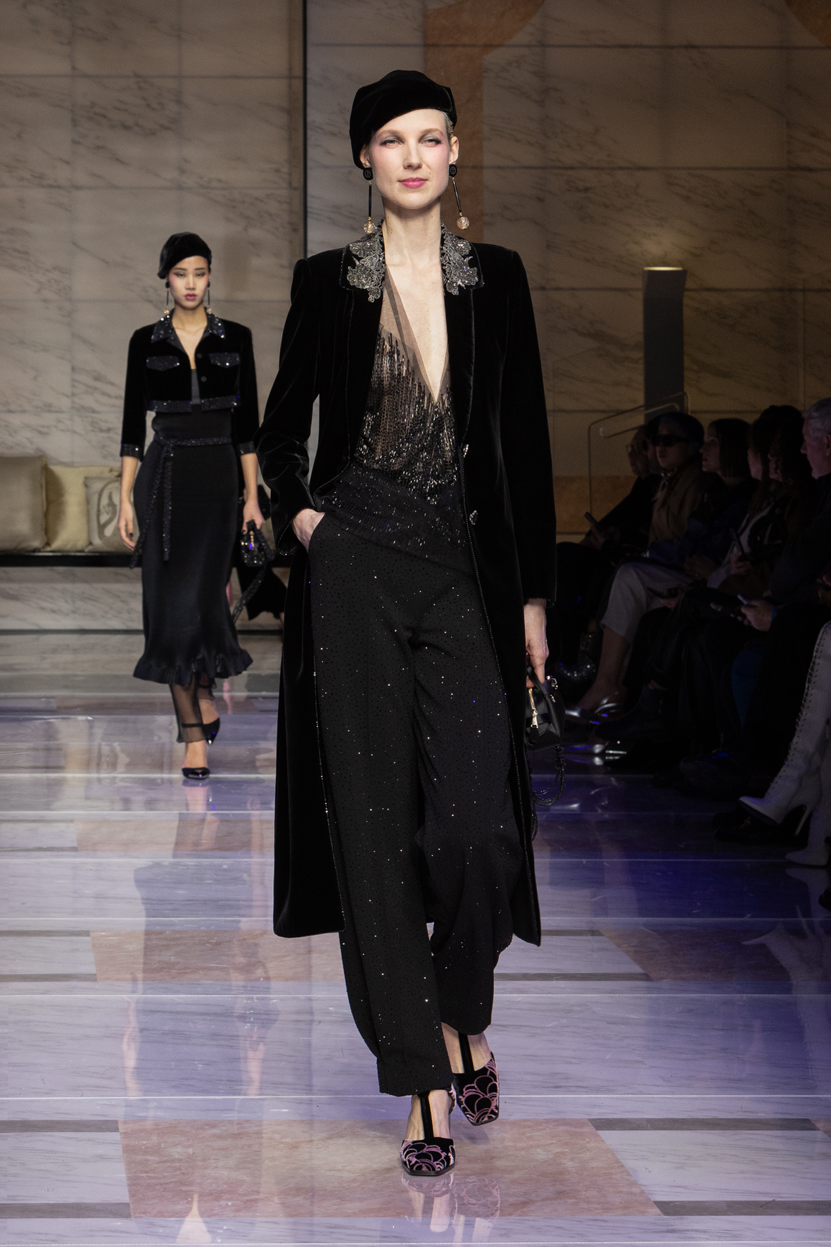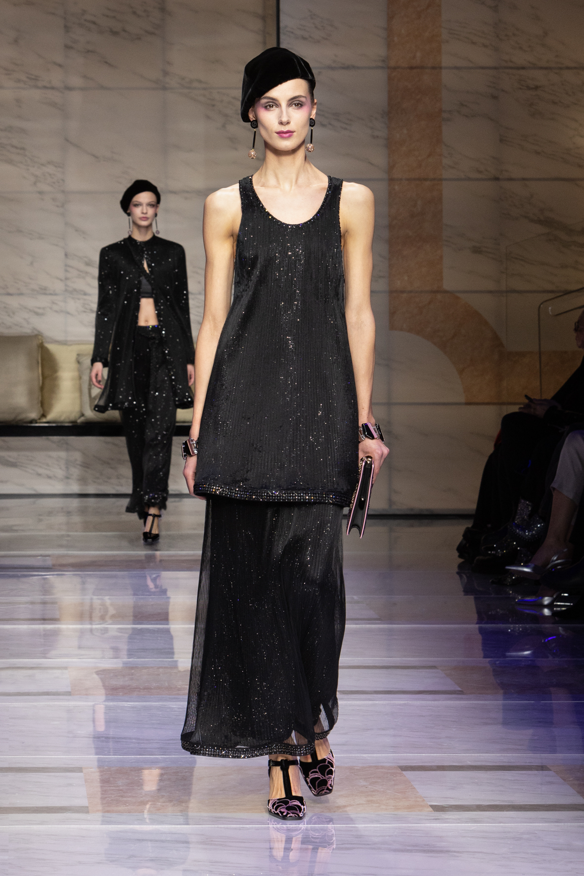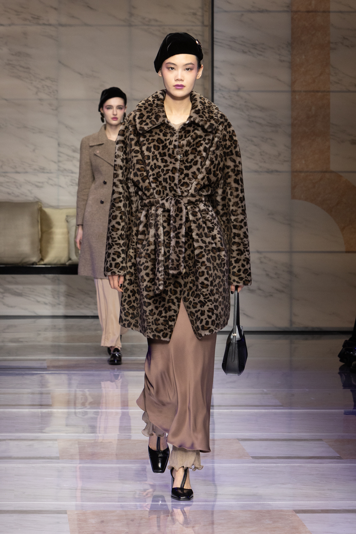 Having crossed the threshold of the Milanese palazzos, hinted to by the elegant marble setting and the harmonious colours and spaces, guests are welcomed into a domestic dimension evoked by the presence of sofa cushions. It feels like a living room, a place for dialogue and socialising, and the wardrobe that accompanies this idea of gentle domesticity is fluid and sublime.