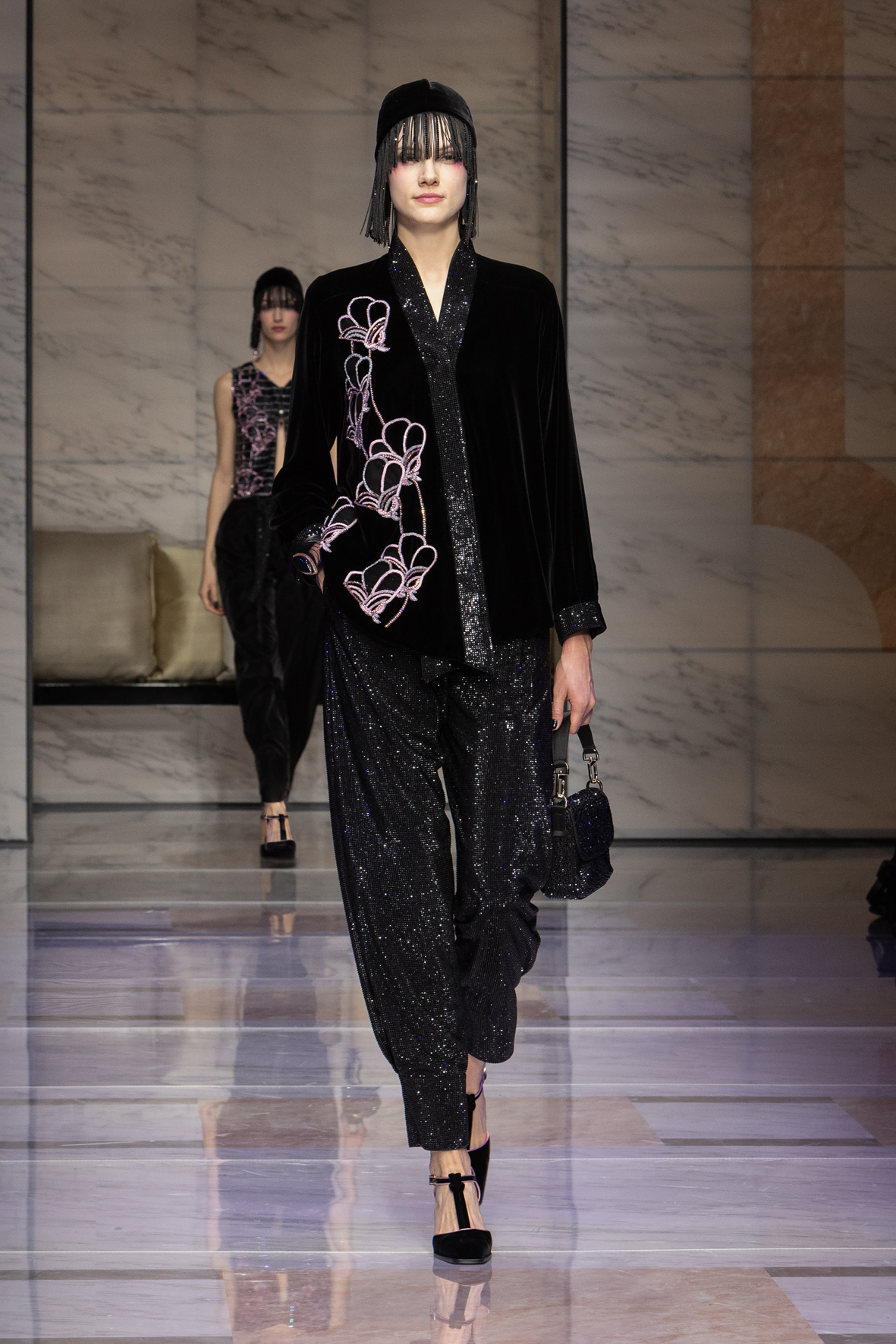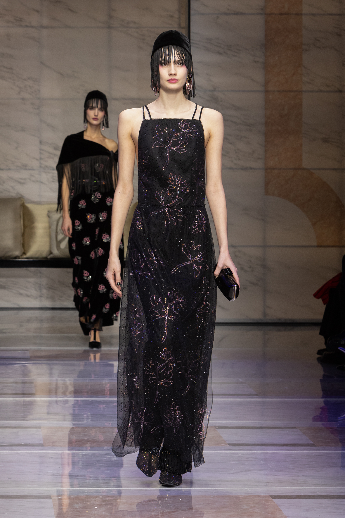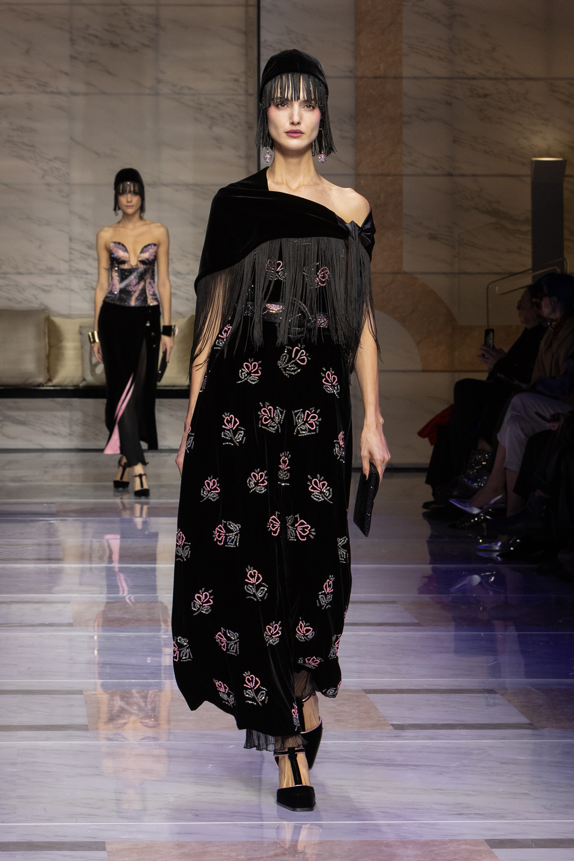 Shapes follow the body and its movements: silky dresses that recall pyjamas, enveloping shawls, soft trousers, pullovers, elongated jackets, and long dresses, in a cosmetic palette of earth, bronze, and powder with touches of mandarin enhanced by an abundance of black kajal. The stylised flower motif is recurrent, a synthesis of grace, delicacy, and discretion. This interior story is accompanied by subtle plays of shiny and matte that range from clothes to accessories, equally soft, including the new model of La Prima. Beaded fringes dance on berets, almost resembling sparkling hairstyles and adding allure and mystery. An enveloping and personal vision that suggests intimacy as an antidote to a moment of theatrical excess.