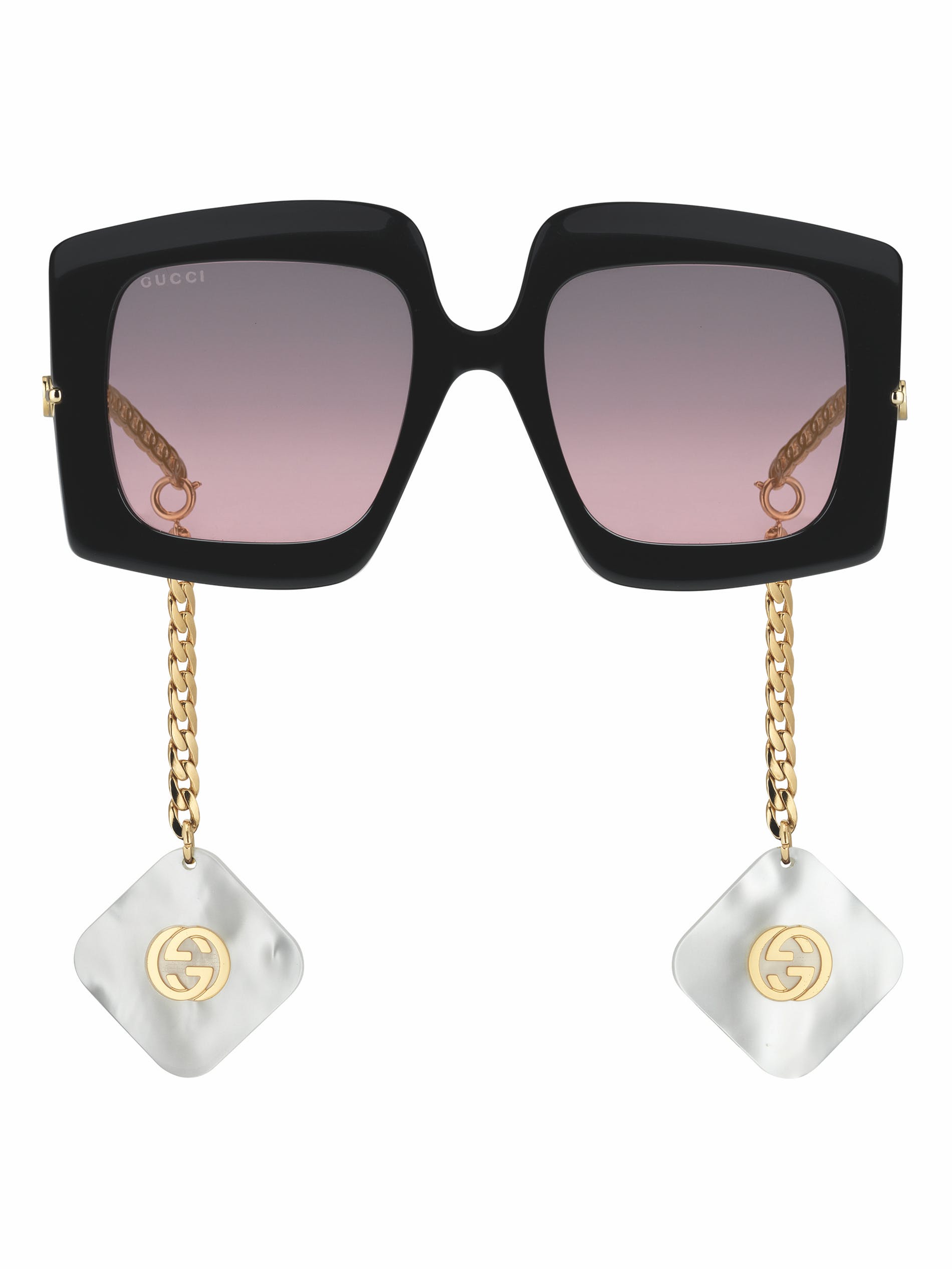 One style has an oversized butterfly frame in shiny Endura Gold and comes with shiny pink mother-of-pearl earrings and a solid brown lens, or shiny black earrings and a solid yellow lens. A second model has a shiny black thick squared frame, shiny white mother-of-pearl earrings and a double gradient smoke/pink lens; the same style also comes with a shiny black and ivory zebra pattern frame in acetate created exclusively for Gucci, matching earrings and a solid red lens. The third model is an aviator style with a thick frame in shiny black, with matching earrings and a solid grey lens; this style also comes with a shiny transparent light yellow-and-brown frame, matching earrings and a solid green lens.