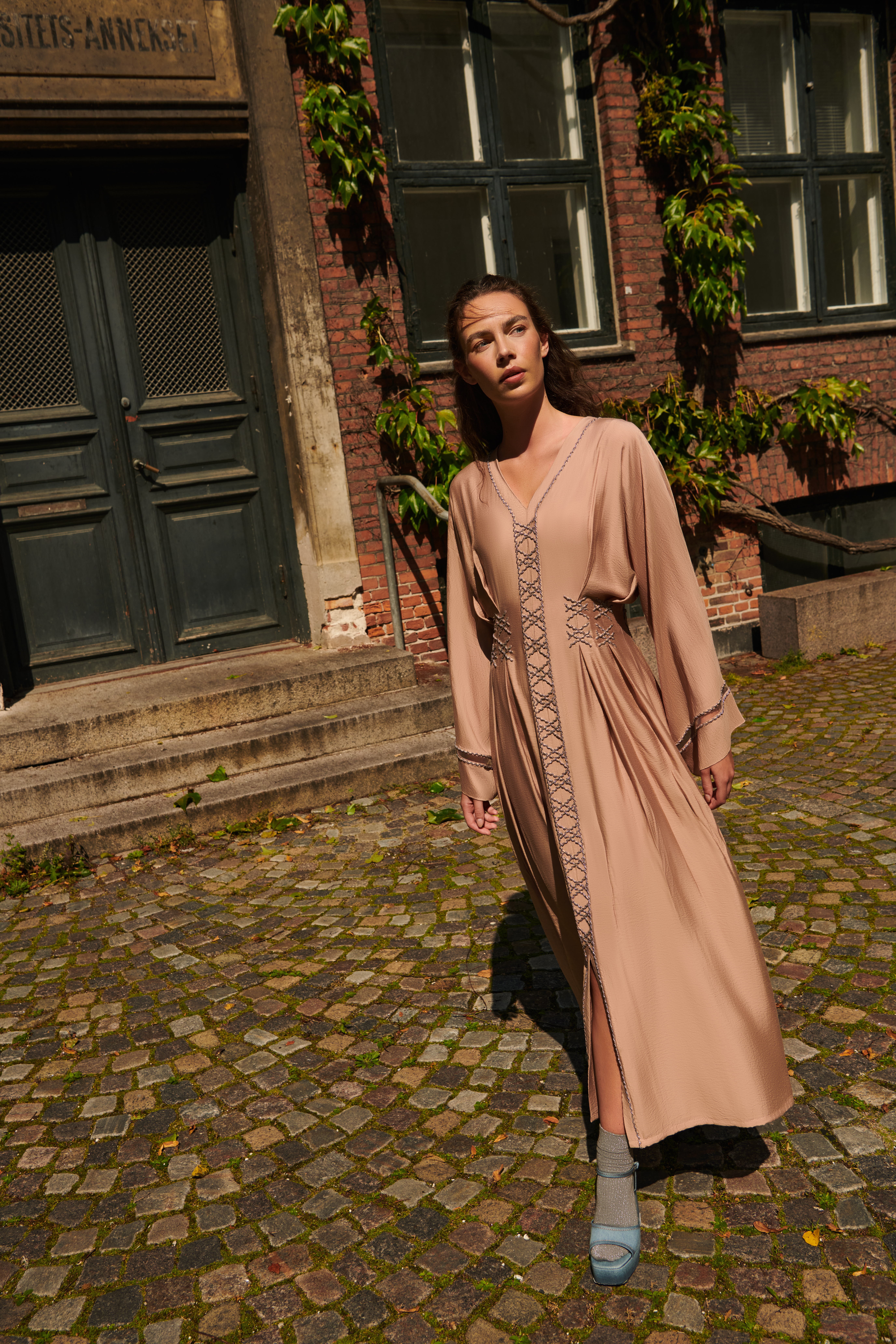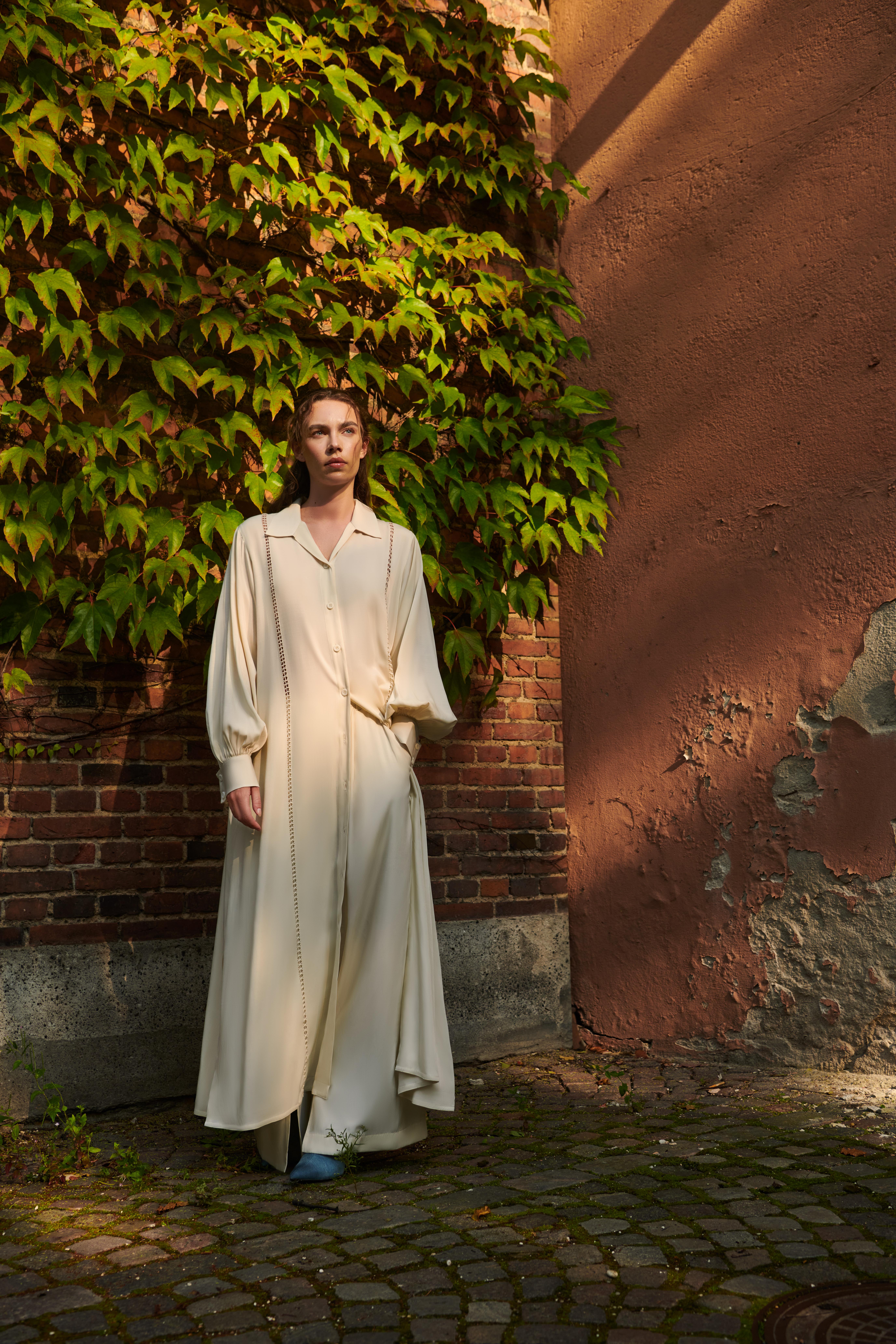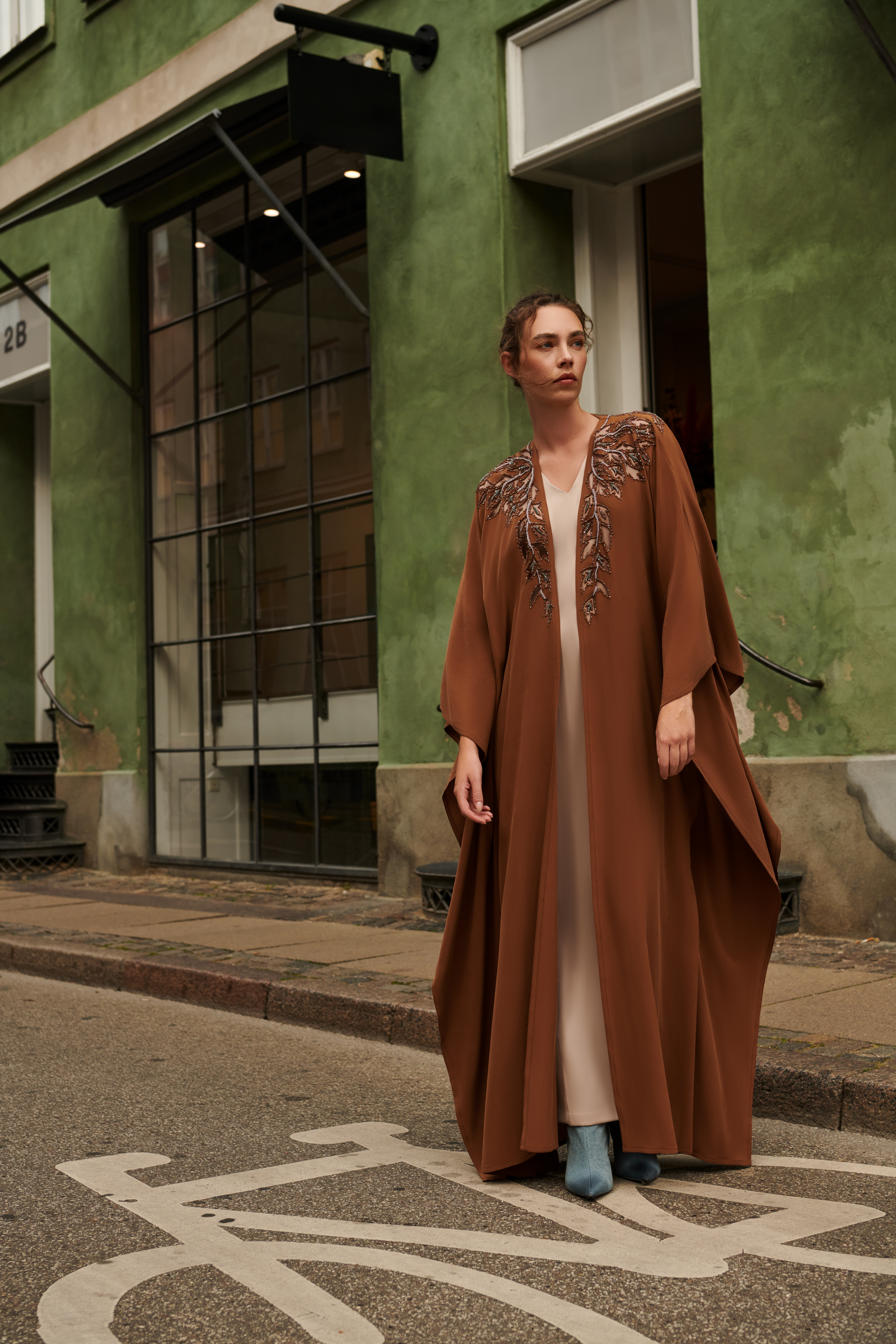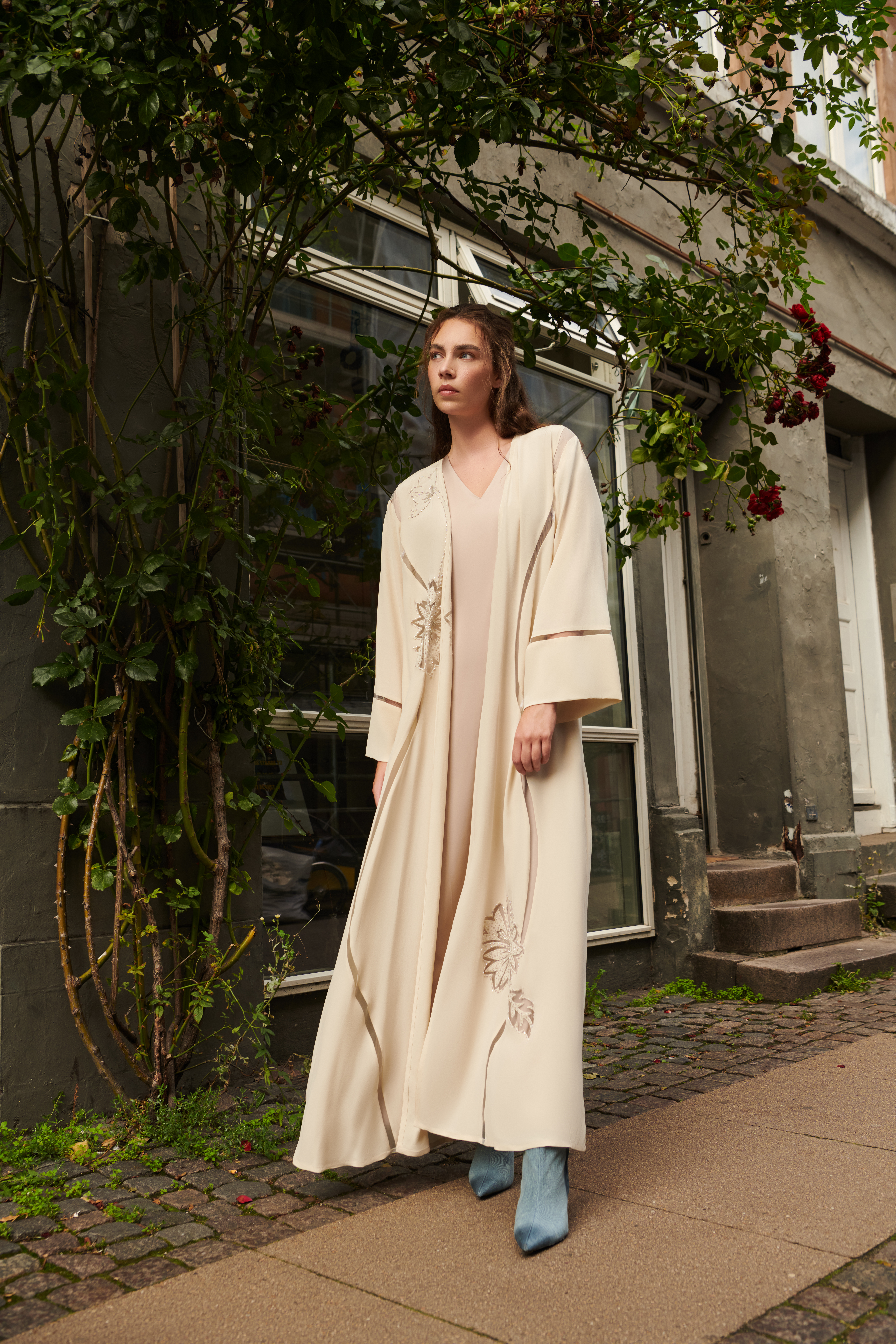 An array of flowy silhouettes of long dresses, kaftans & cape-like coats is accentuated with a modern take on embroidery patterns, tying each look togther. This season, Hashimi introduces cutout patterns & sheer embroidery patterns, enhancing the signature aesthetic. A calming harmony of tradition & modern emanates within each style.