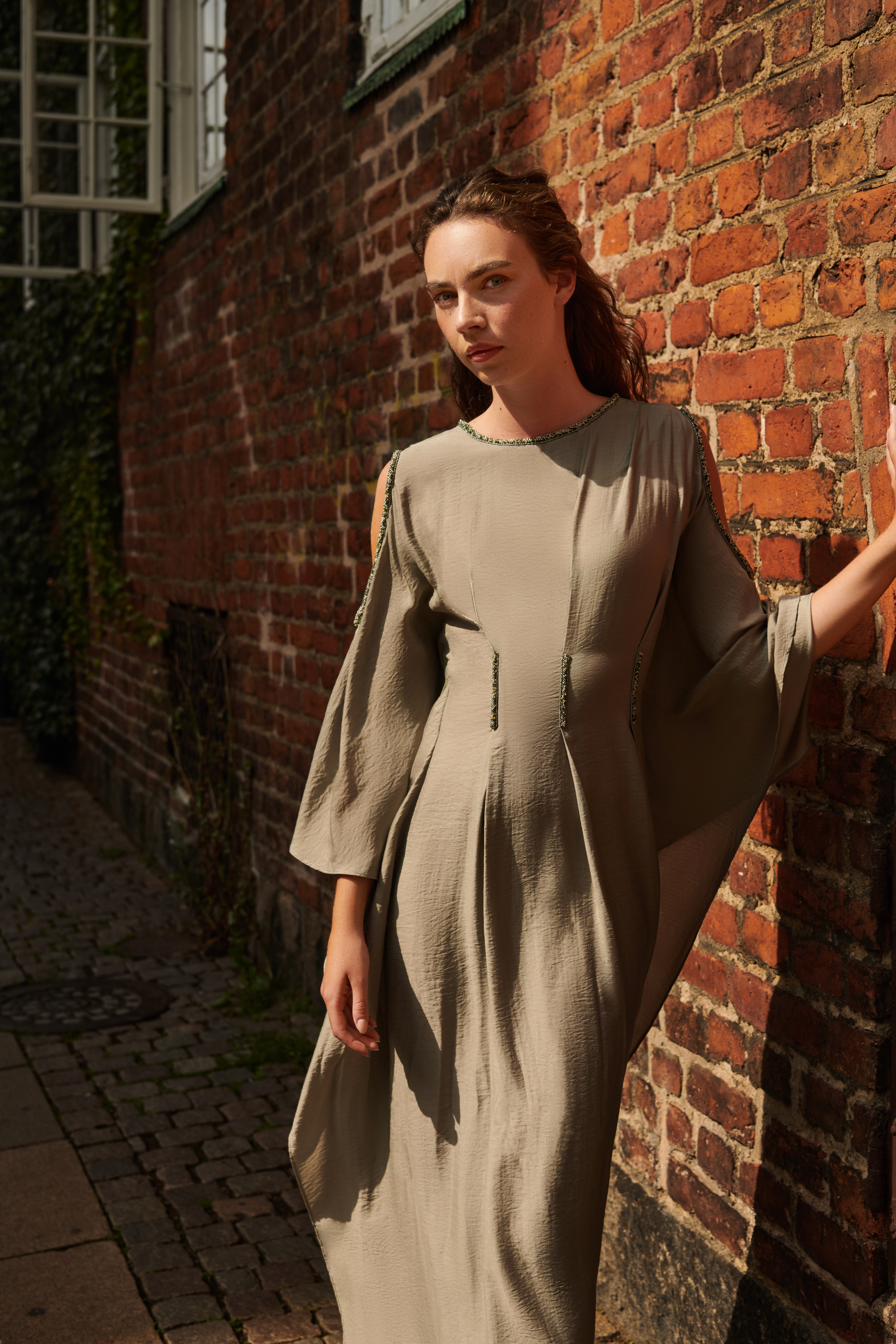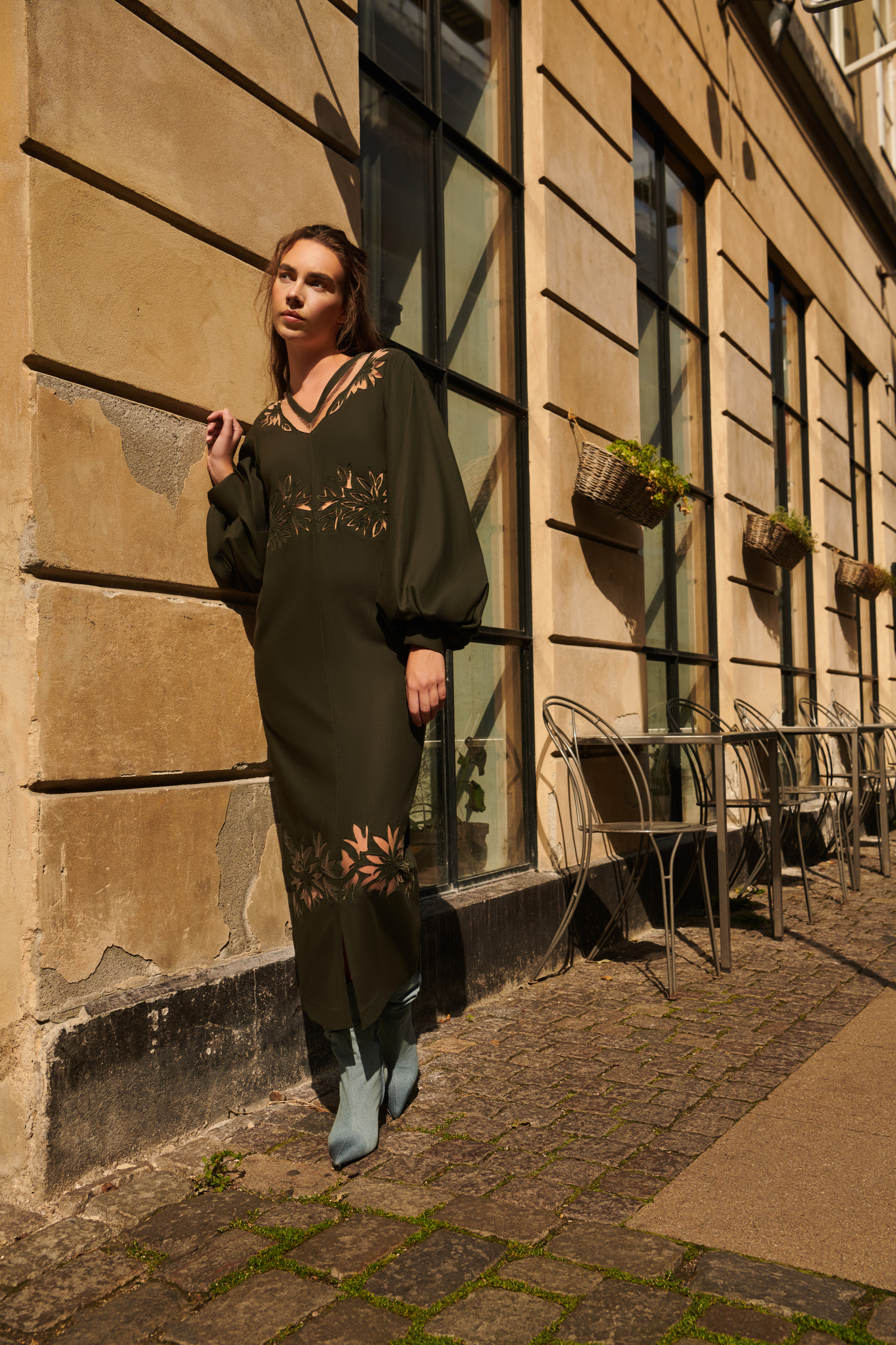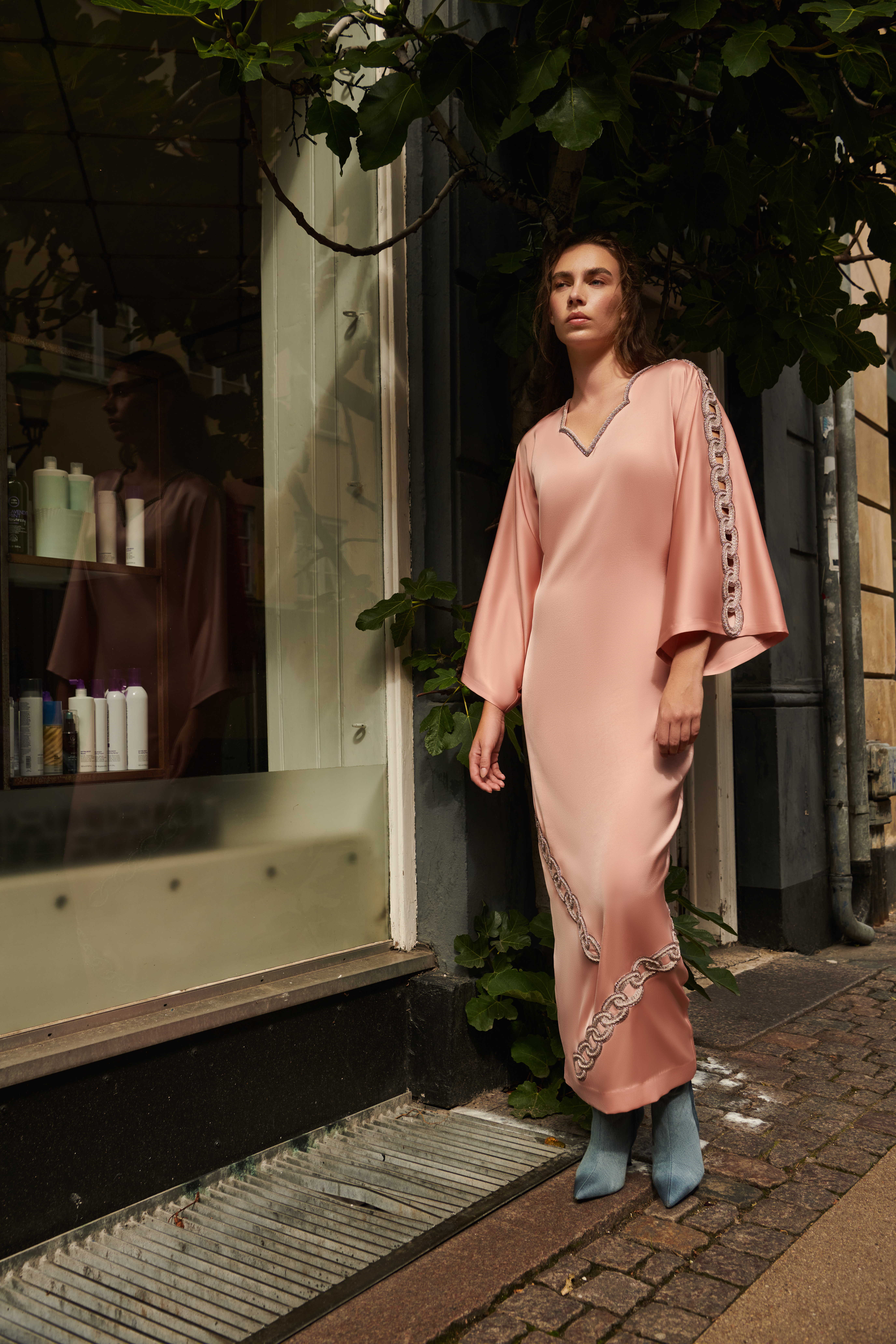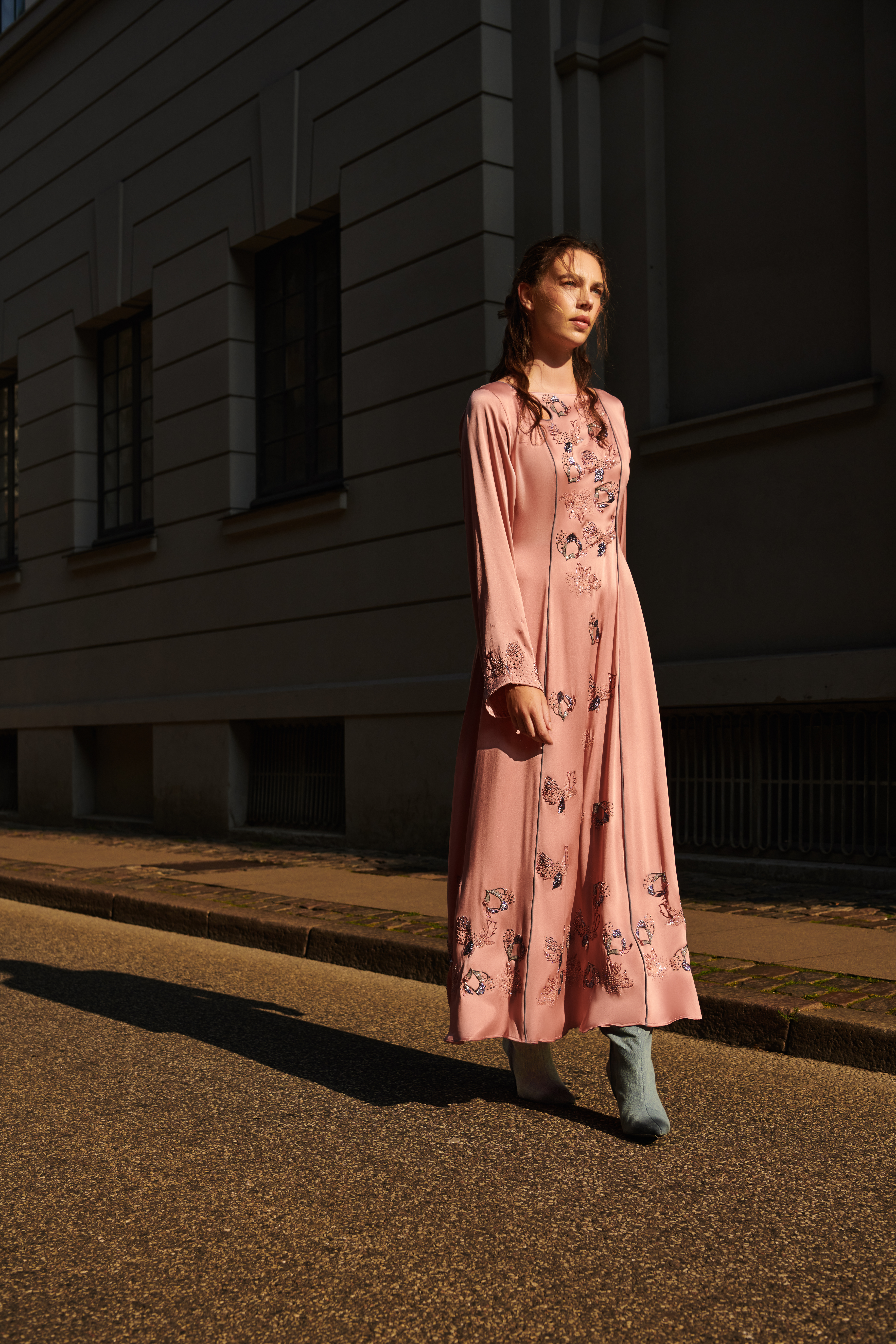 An array of flowy silhouettes of long dresses, kaftans & cape-like coats is accentuated with a modern take on embroidery patterns, tying each look togther. This season, Hashimi introduces cutout patterns & sheer embroidery patterns, enhancing the signature aesthetic. A calming harmony of tradition & modern emanates within each style.