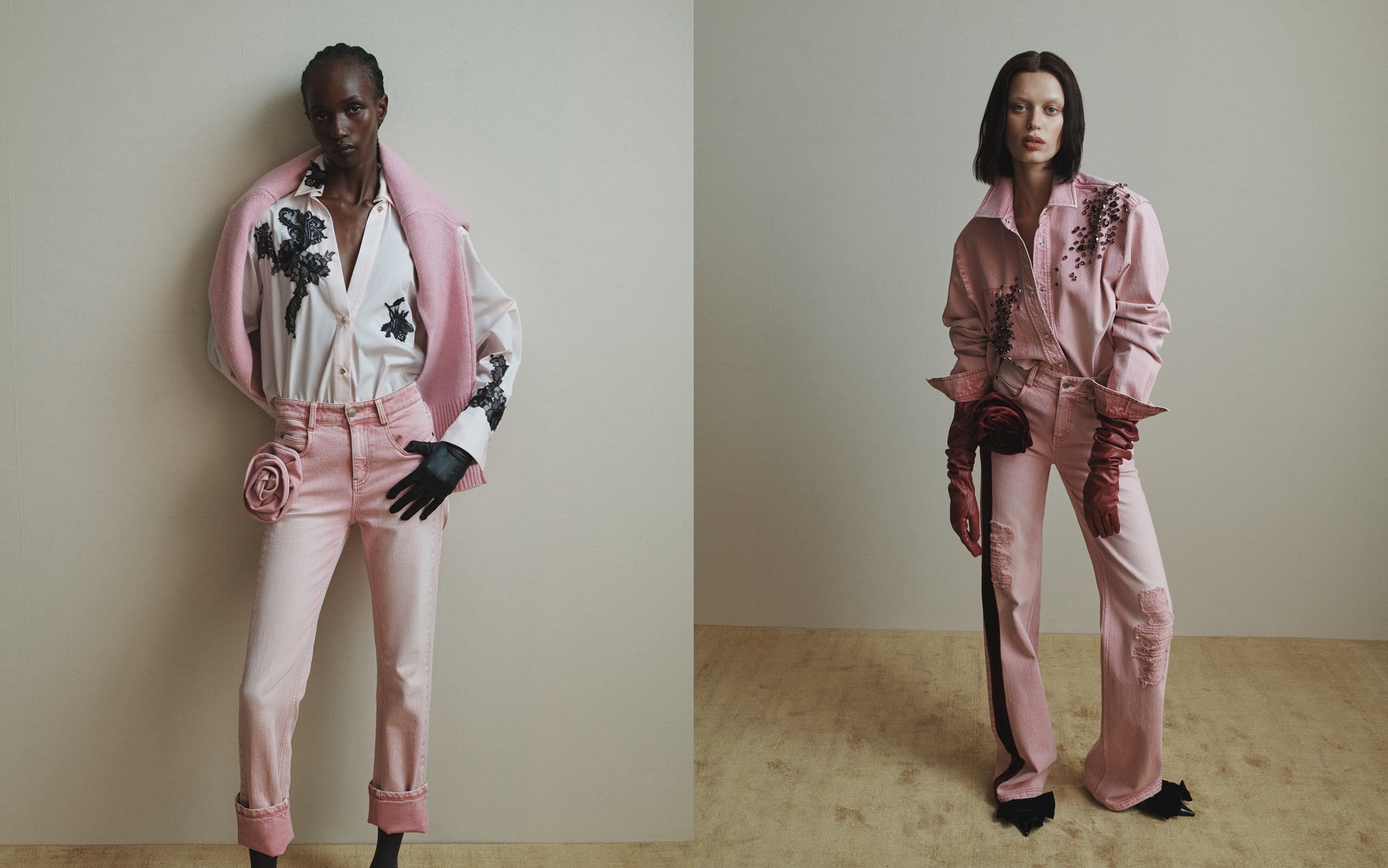 Velvet is sculptural this season, coming in the form of the Luisa bow bustier in scarlet velvet or the black strapless 'Linda' gown. Favorites such as the bestselling 'Stanley' denim return in a rose pink wash and bordeaux velvet corsage and Millstein's famed flared denim gets a glamorous update with a rich red bow detail on the 'Bentley'.