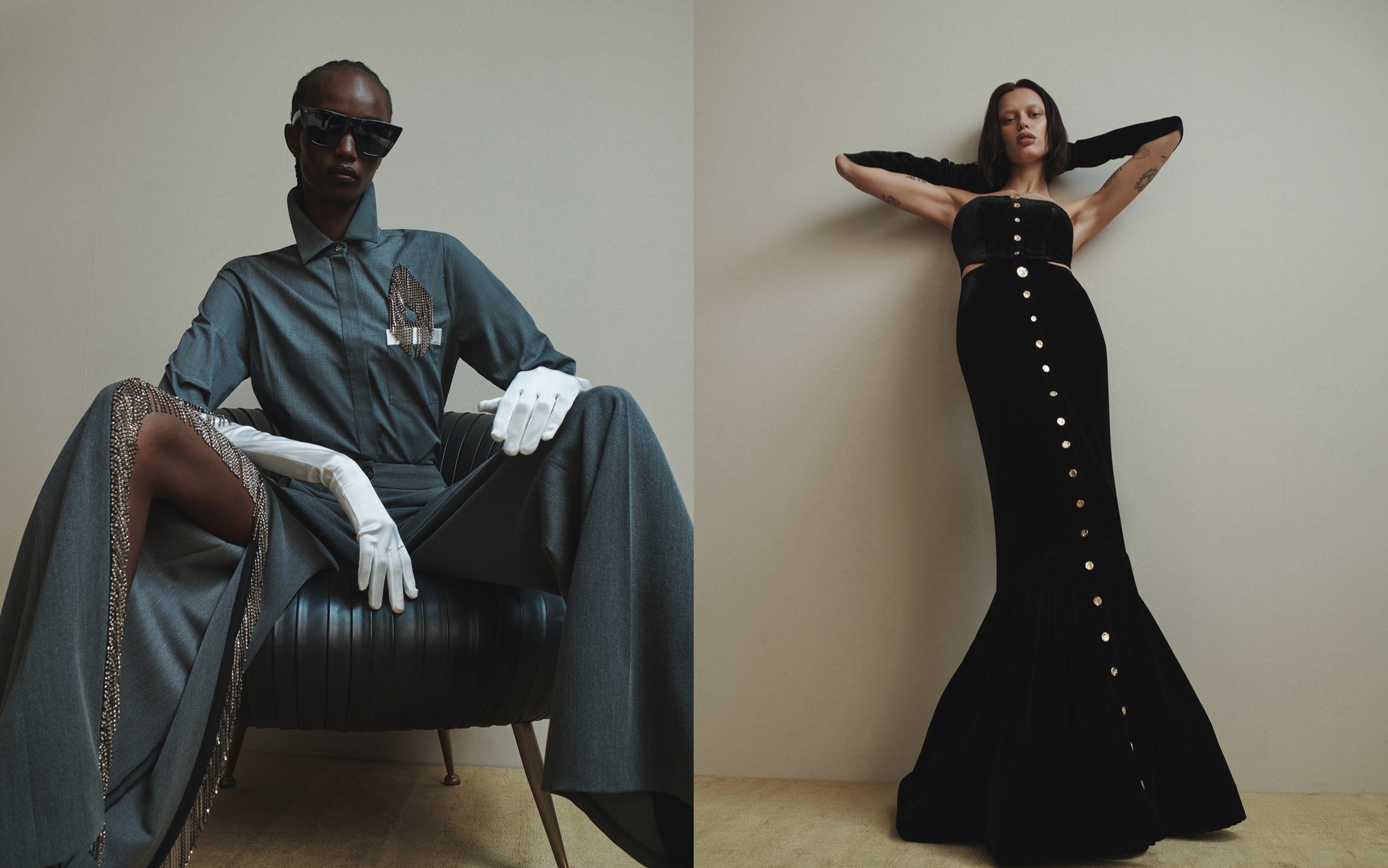 Embellished pieces are all infused with ease: the beaded 3D embroidery detailing on the 'Carlito' collarless blazer and 'Stefan' pant is Millstein's 2024 twist on a tuxedo whilst the 'Amaia' pleated bustier in black velvet and the 'Batiste' blazer in pebble crepe come embellished with a crystal fringe.