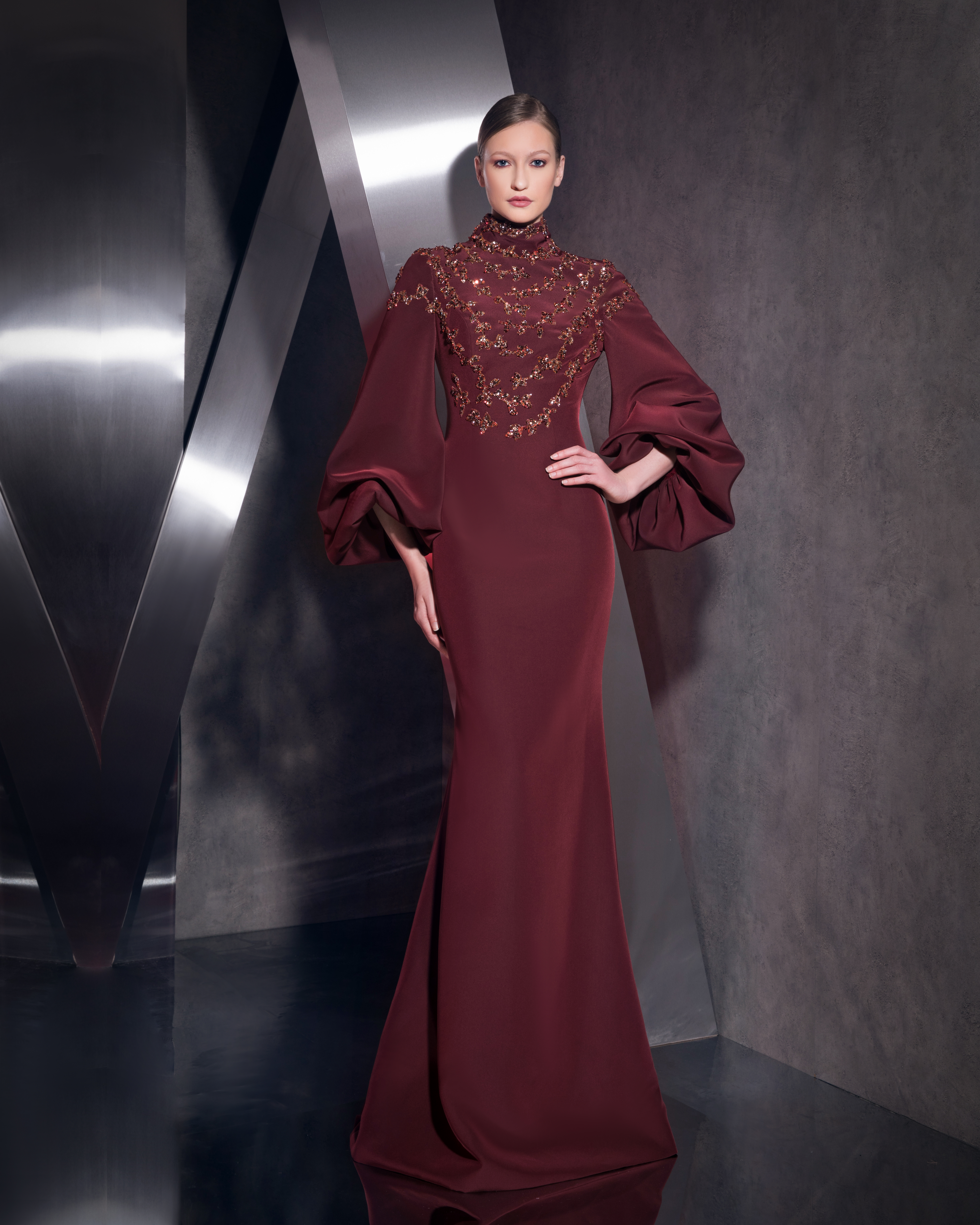 The silhouettes in "Harmony" are equally stunning, each one embodying movement and grace. Dramatic puffed sleeves bring a regal flair to evening gowns, while cape-style sleeves emphasise fluidity and elegance. High necklines introduce classic sophistication, and detailed feathers and floral embellishments on sleeves and collars add an artistic, whimsical touch. Belts that cinch the waist further highlight the feminine form, ensuring every look is both powerful and delicate.
