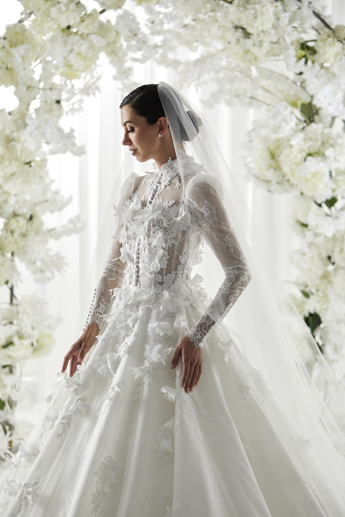 A signature of the Spring/Summer 2024 collection, floral detailing is a key factor of SS’24 wedding gowns. Each bridal wear features hand-sewn floral elements, creating a three-dimensional effect that brings the designs to life. The delicate embroidery and magnificent textures highlight the exceptional skill of the artisans at HAZAR Haute Couture.