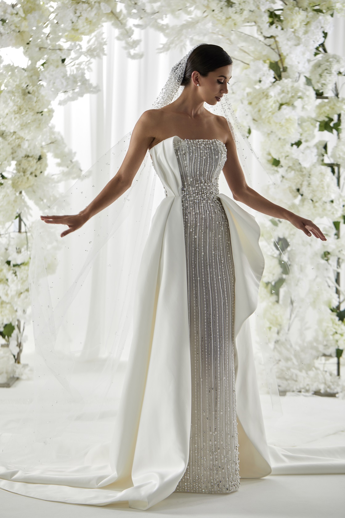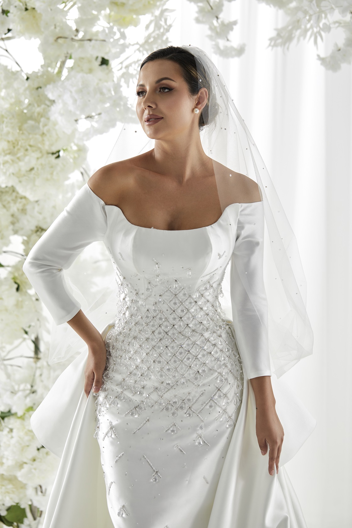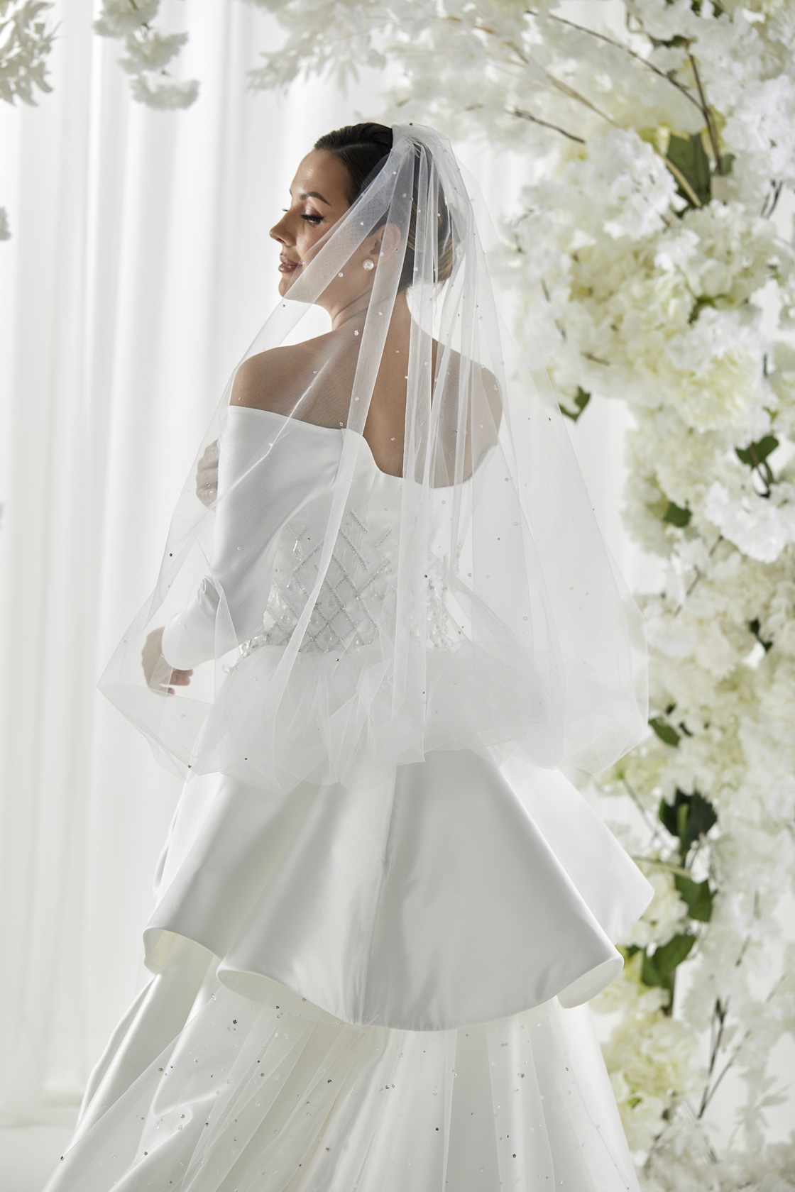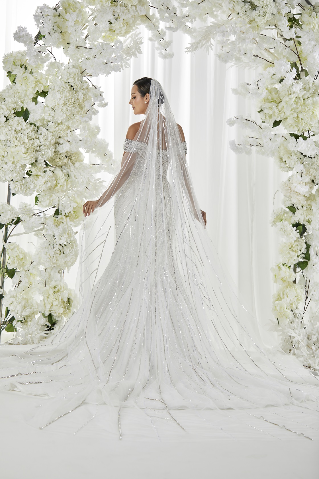 Complementing the gowns, the collection includes a selection of veils with grand hand embellishments. These veils are designed to be more than just an accessory; they are a statement piece that adds a layer of sophistication to the overall look. Each veil is customized to complement the silhouette and hand embellishments on the bridal gown. Brides can now personalize the veil with memorable details such as names, dates, or an expression of love.