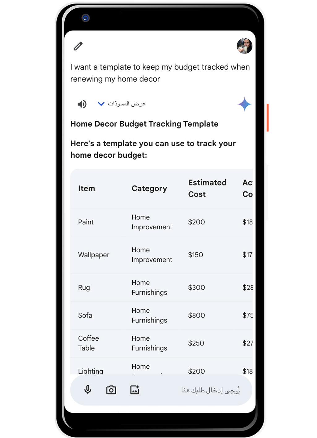 Now that you are inspired, you can plan your next makeover, one step at a time. If planning is a challenge for you, use Gemini to assist you in creating a budget tracker and a timeline to help you stay organised. Because Gemini is integrated with other Google tools, you can get a tracker template that you can edit and share on Google Sheets.
