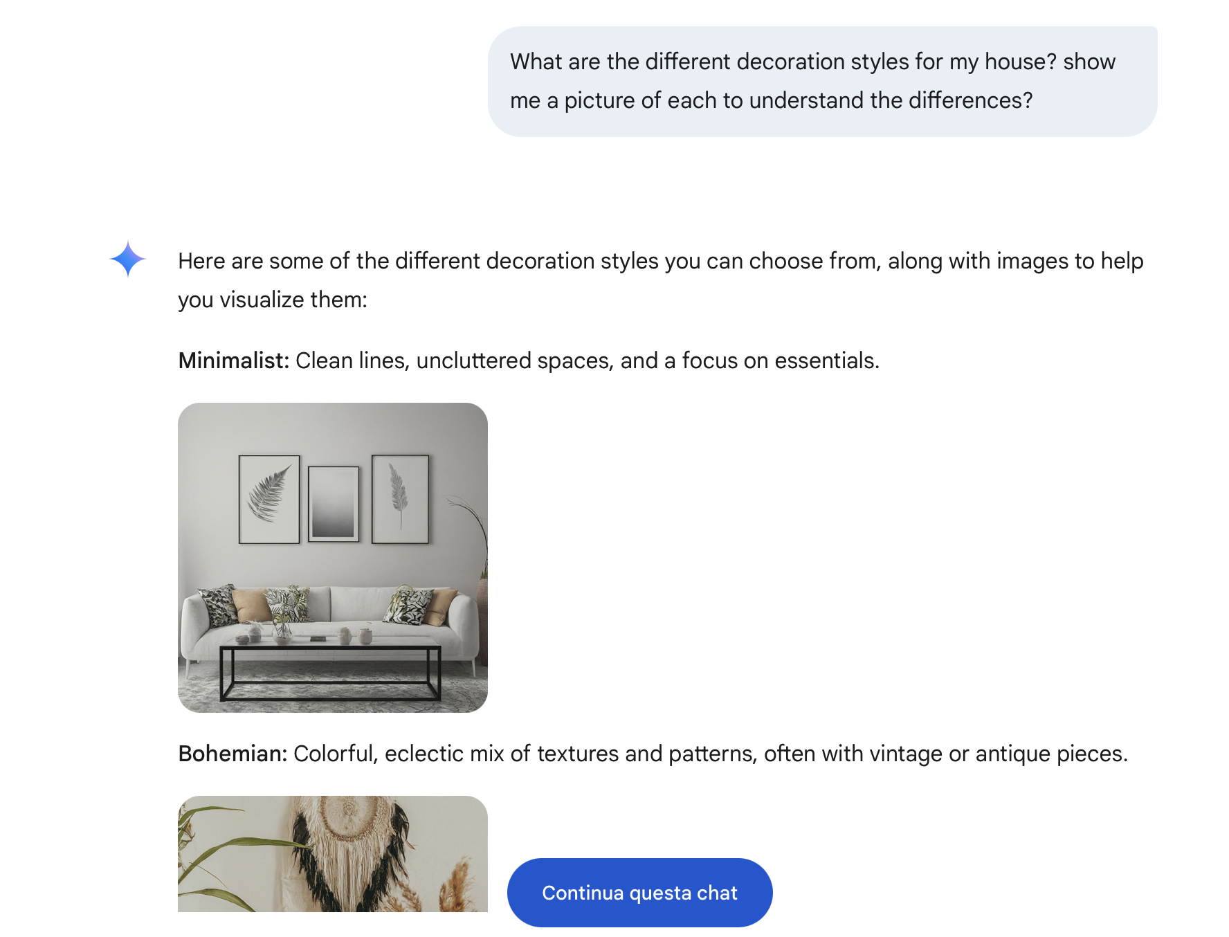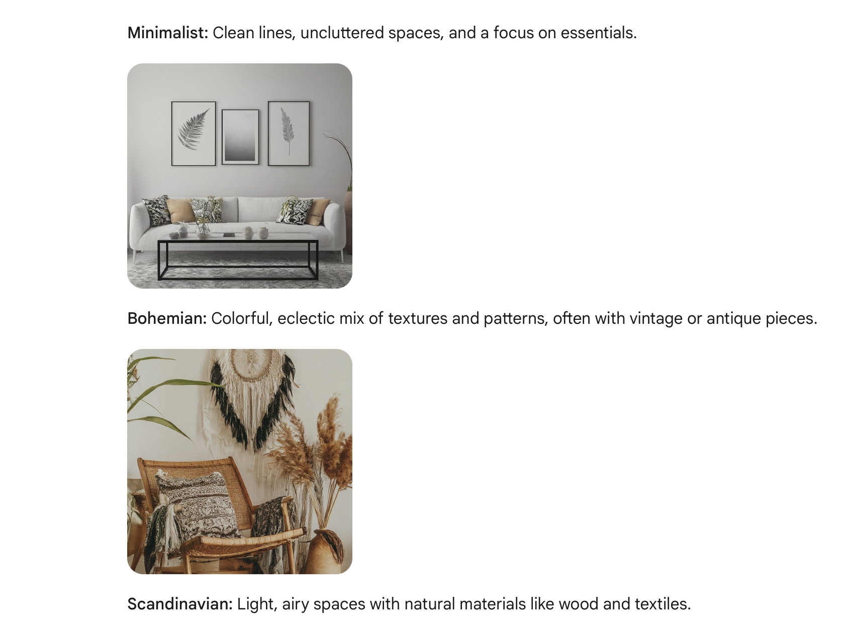 You can use Gemini to help kick-off your decoration journey. In order to get an early inspiration booster, I recommend you to look up the different decoration styles. For example, Gemini can provide you with an overview of the Minimalist, Scandinavian, Bohemian or traditional decoration styles. Your prompt can be something like; “What are the different decoration styles for my house? show me a picture of each to understand the differences”