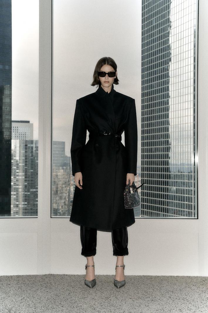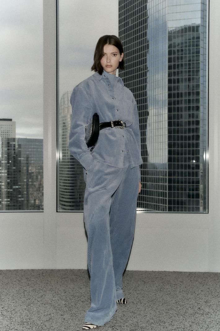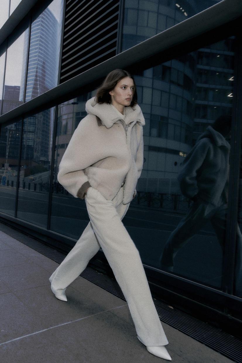 The dynamic architecture of the business districts in Paris, New York or Tokyo transposes her unique silhouette. The coats are sharp and belted at the waist, the trousers have a straight line, the one-piece jumpsuits are fitted. She draws on the power dressing of the working girl with always a touch of IRO madness : a leather blazer, a mirror effect, leather dress, a studded slit skirt. She dares to wear graphic zebra prints, a glance to the urban jungle she knows so well, and brightens her silhouette with an ice blue effect, over a cashmere sweater or a corduroy jumpsuit. Always on the go, and looking straight ahead, her silhouette is marked by laser cut jeans, with a steel effect on the leather, combined with the technical effect of a down coat with shearling. The knits are structured by XXL cable patterns or rhythmic ribbing. The jacquard is woven on the dress like a projection of silver, the print is digital, the tweed is geometric. Everything is in movement always dynamic; the future is not far.