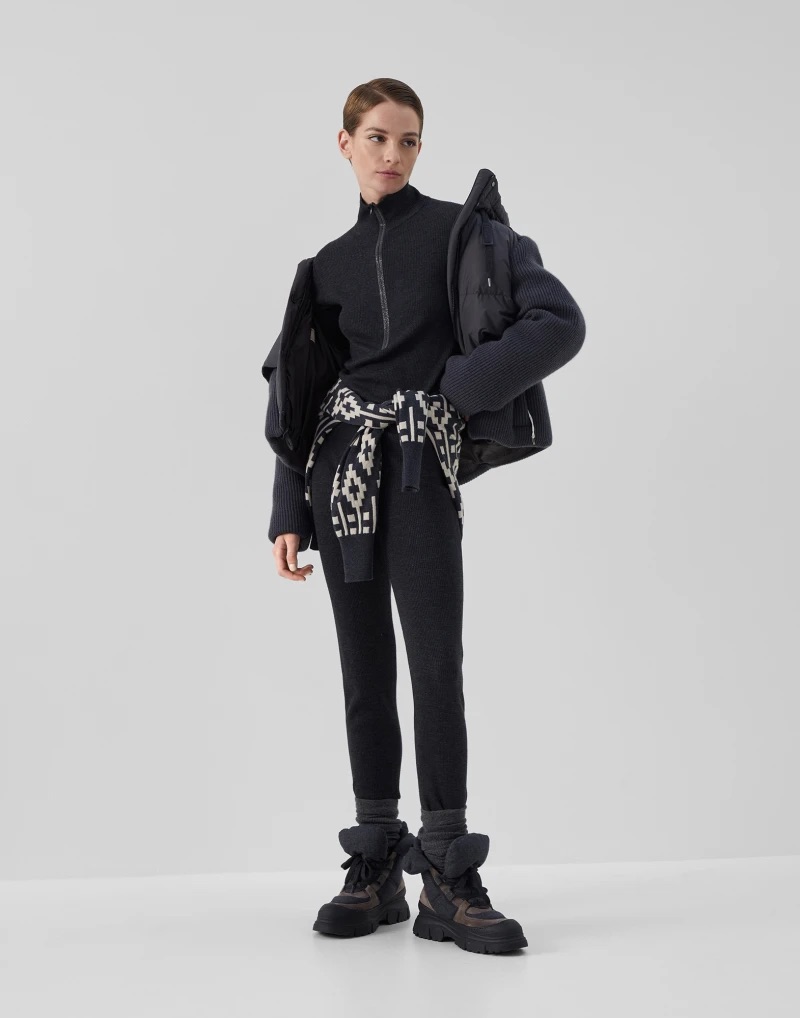 Jumpsuits, trousers, quilted outerwear, boots and cozy accessories combine a sporty feel with a fine look, for functional elegance.
