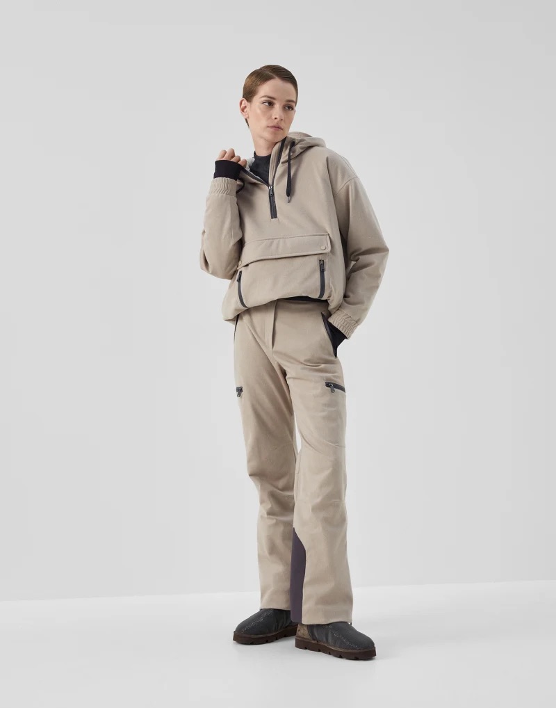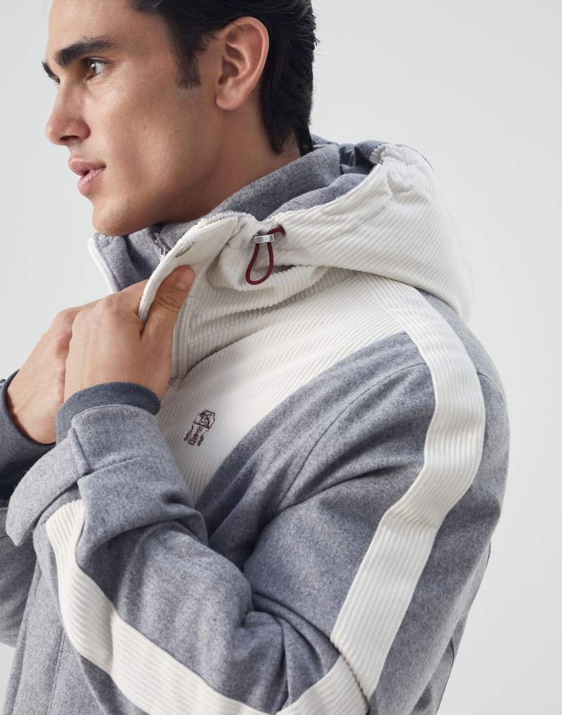 Perfect for adding a sophisticated touch to dynamic moments in the mountains, the special outerwear is detailed in bonded wool flannel and corduroy inserts that create an elegant color and material contrast.