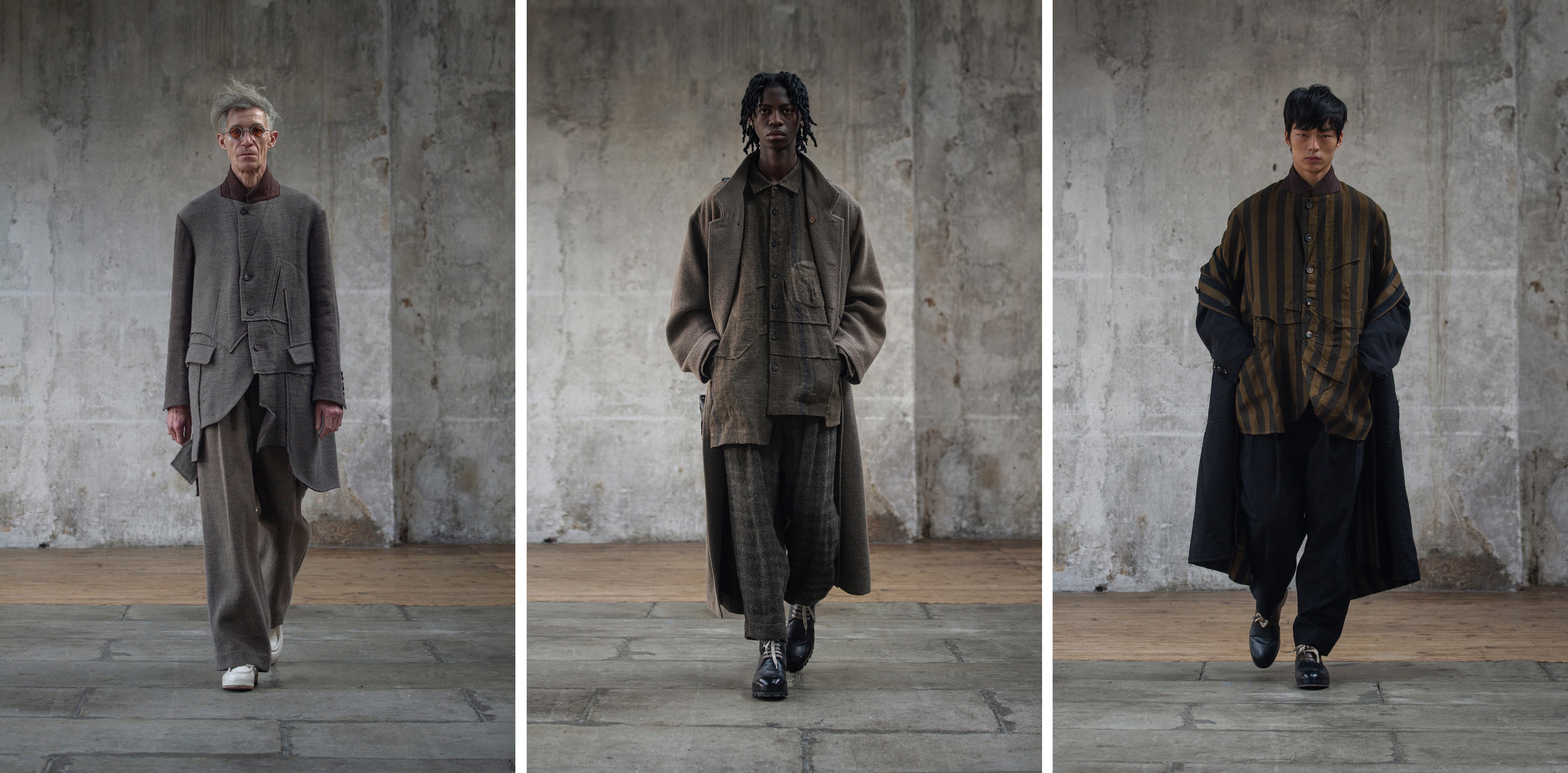 The designer opts for uplifting mid tones combined with deep blacks and a natural Indigo silk screen print, developed in Kyoto. Apart from Indigo, other natural dyes such as Ume (Japanese plum), Kakishibu (persimmon fruit) and Gall nuts are used to diversify the color palette.