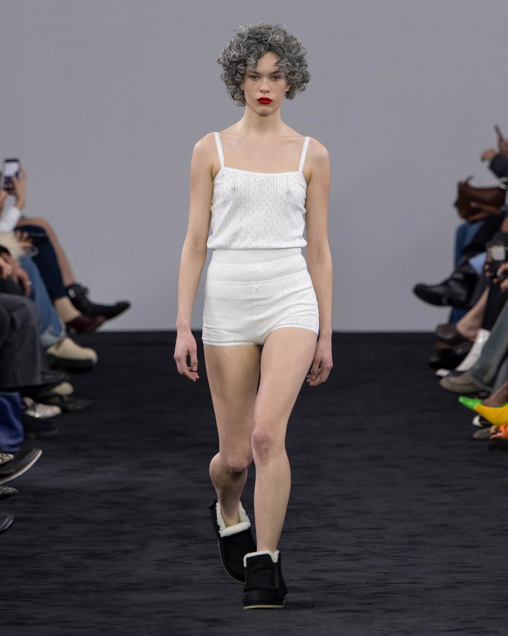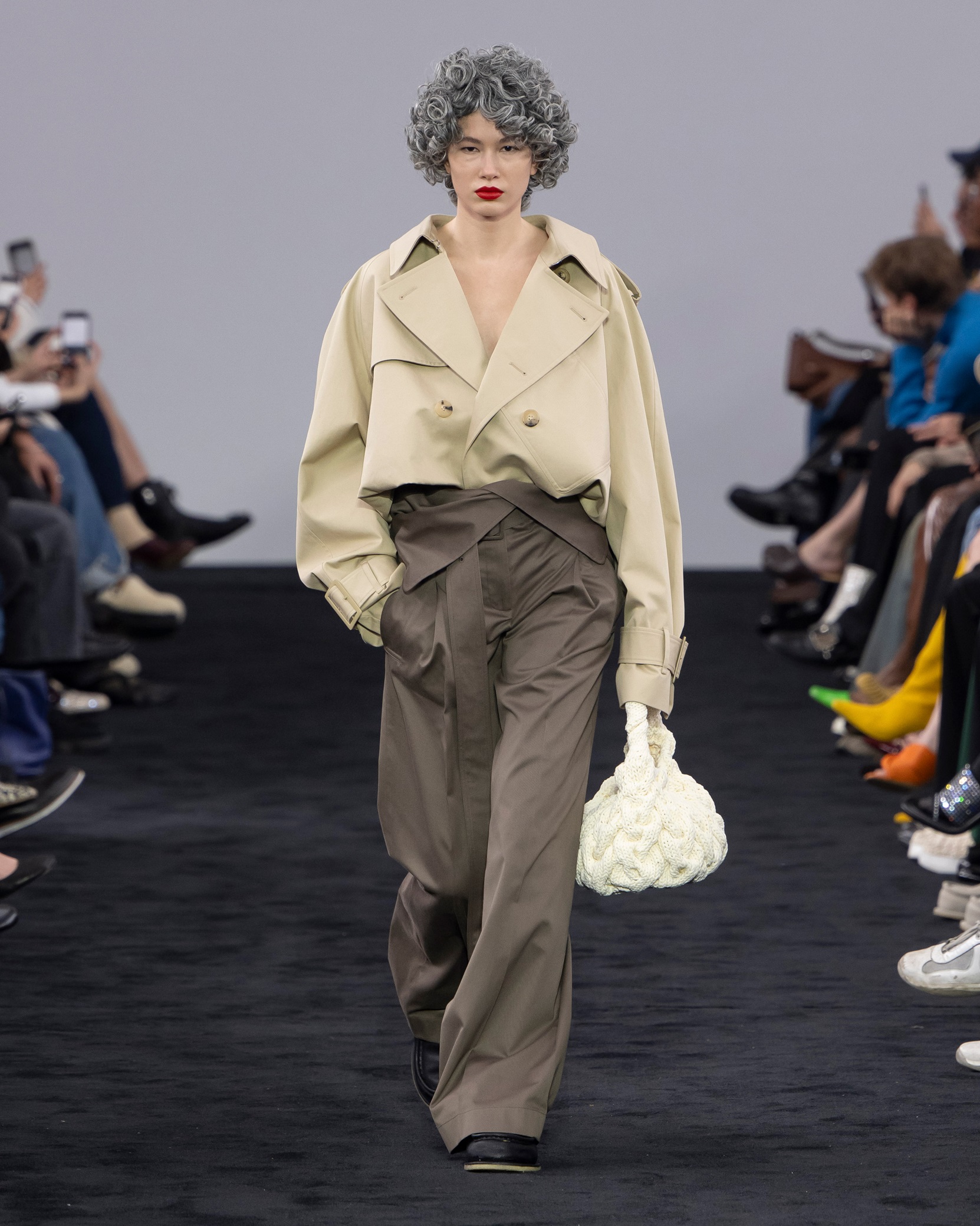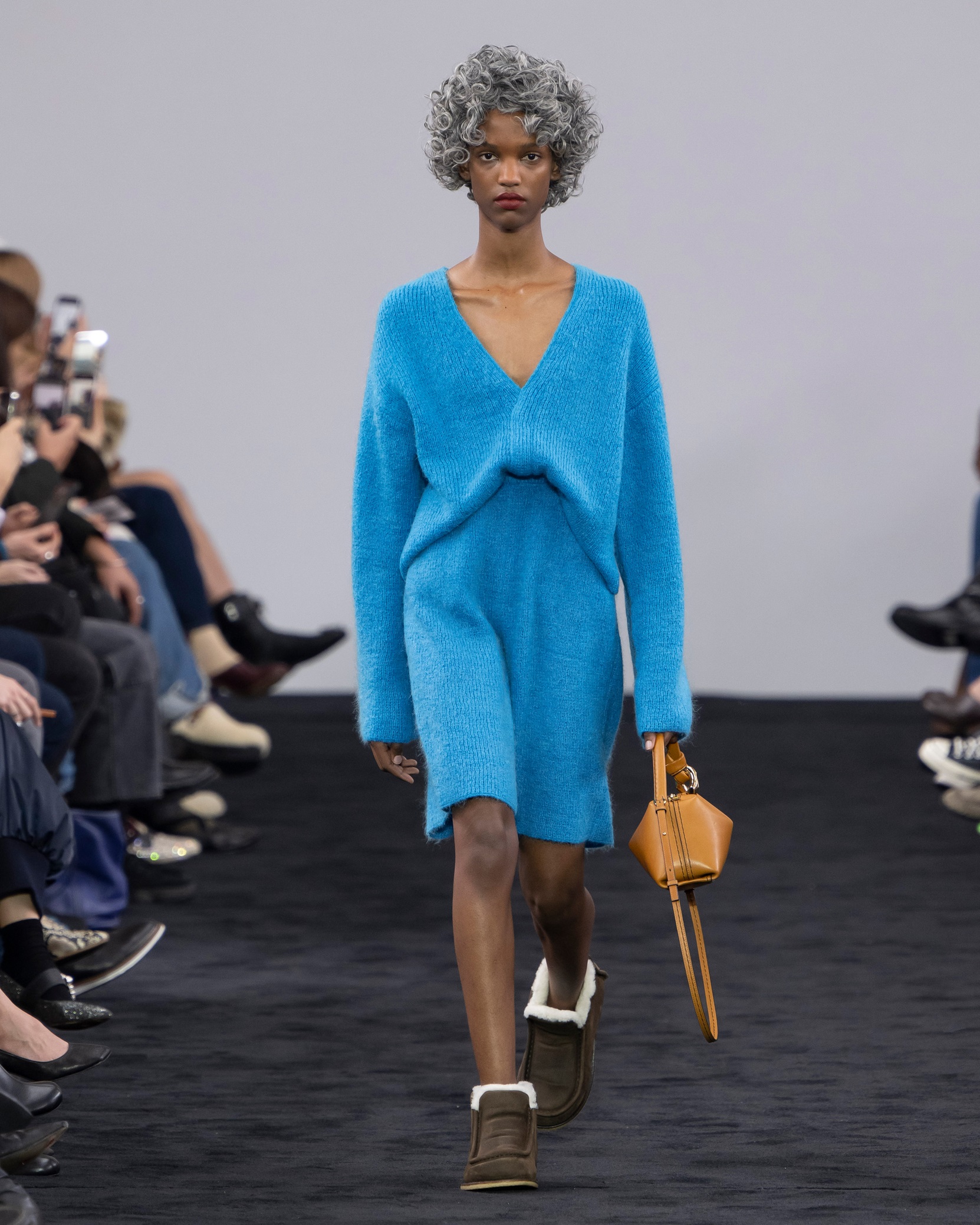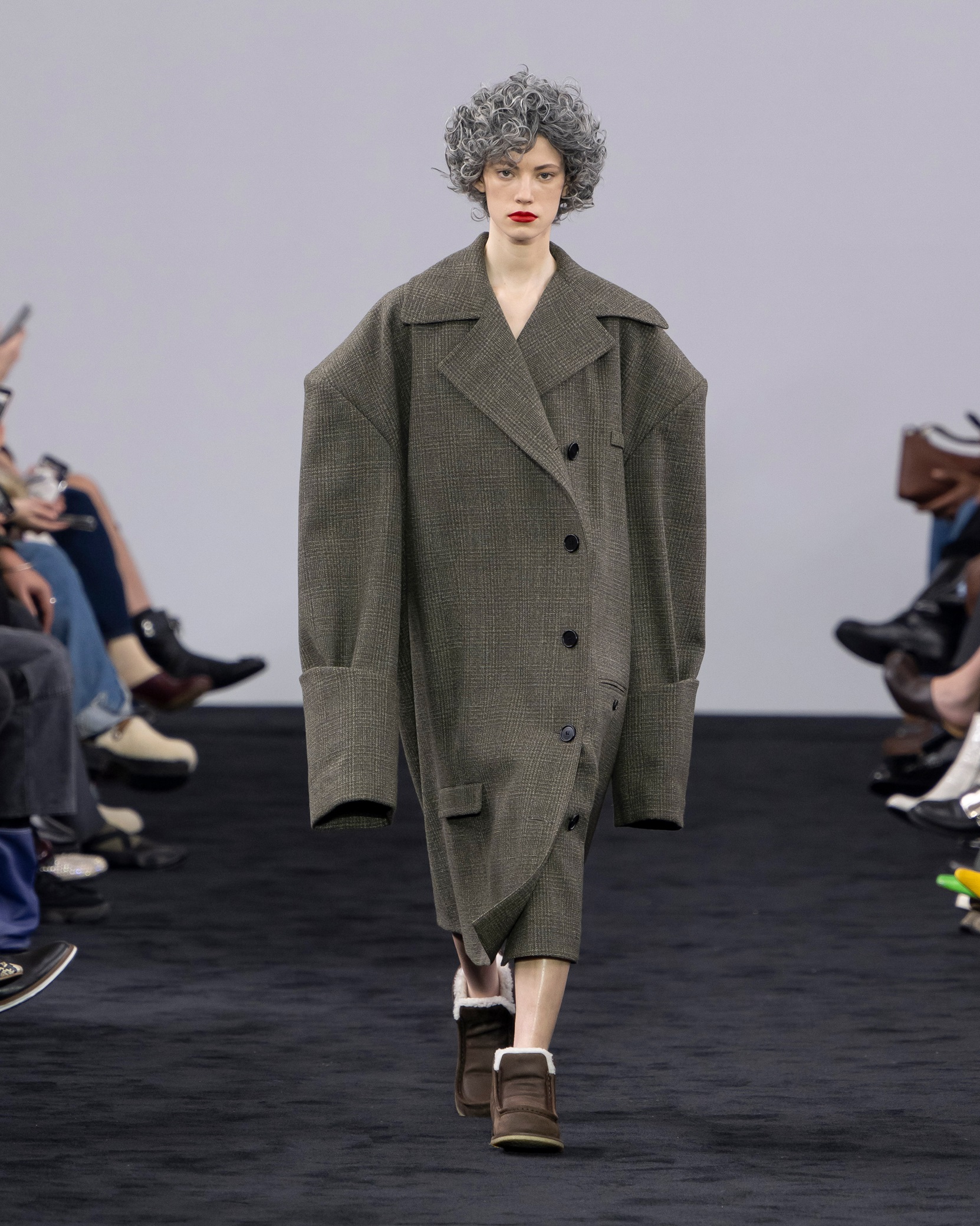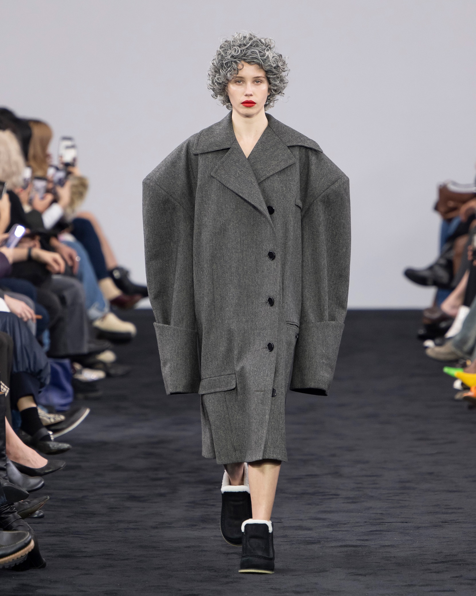 The subtle and the loud. A grey wig as a device. And flats. Housewife flats.