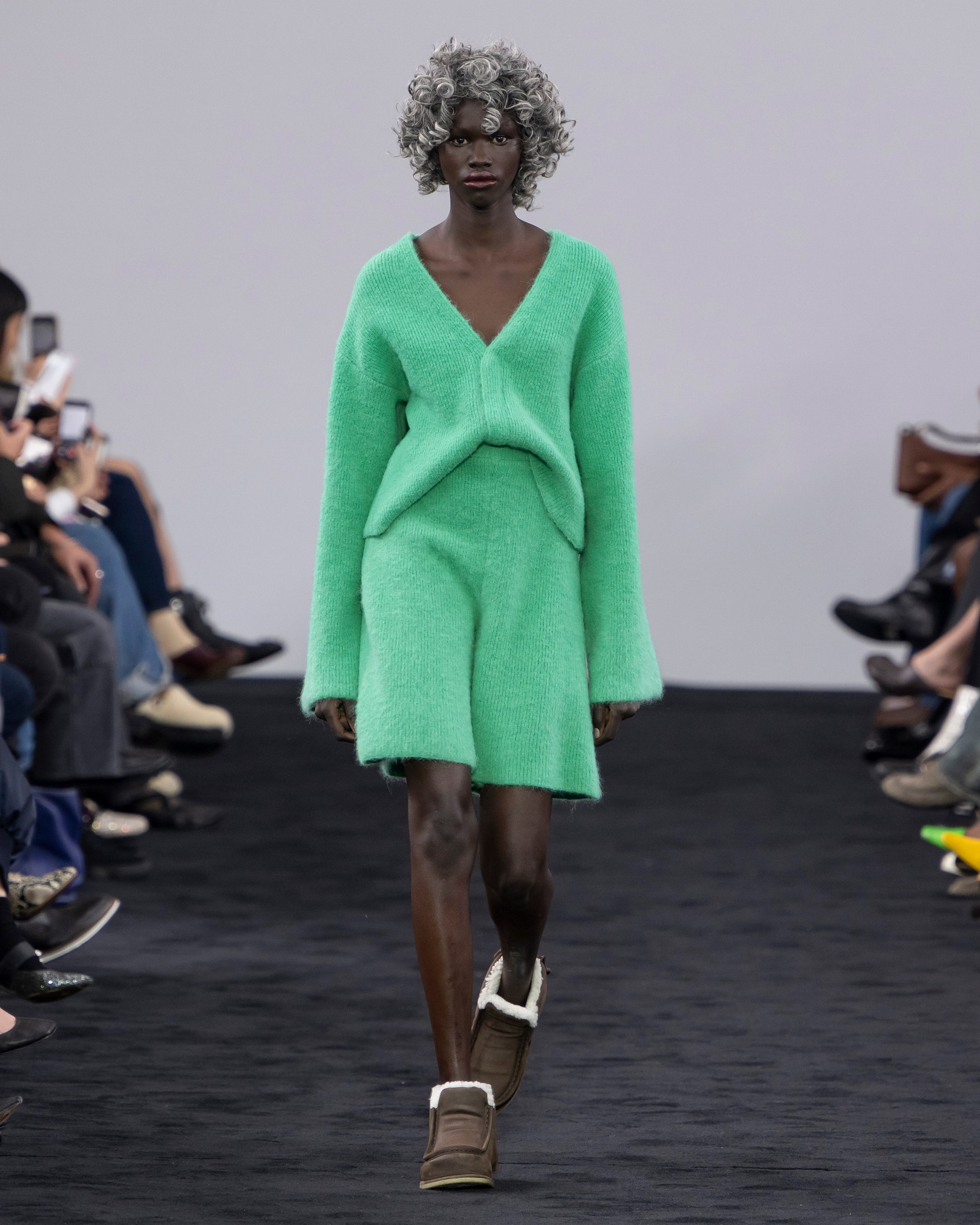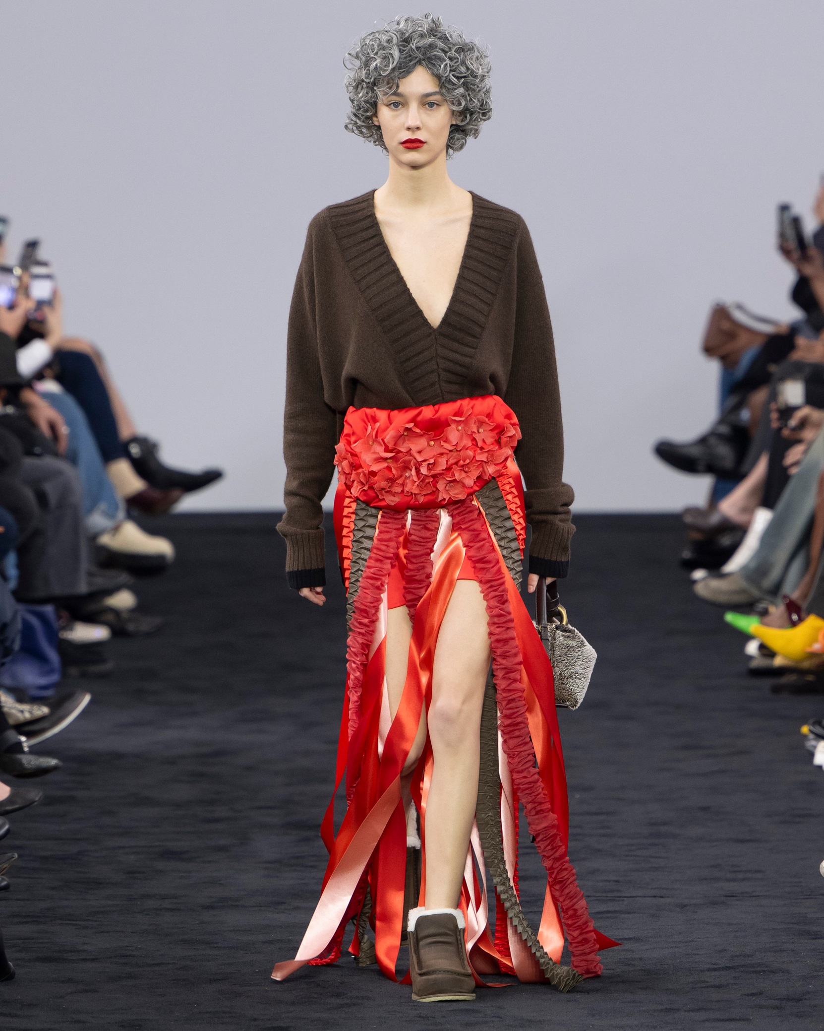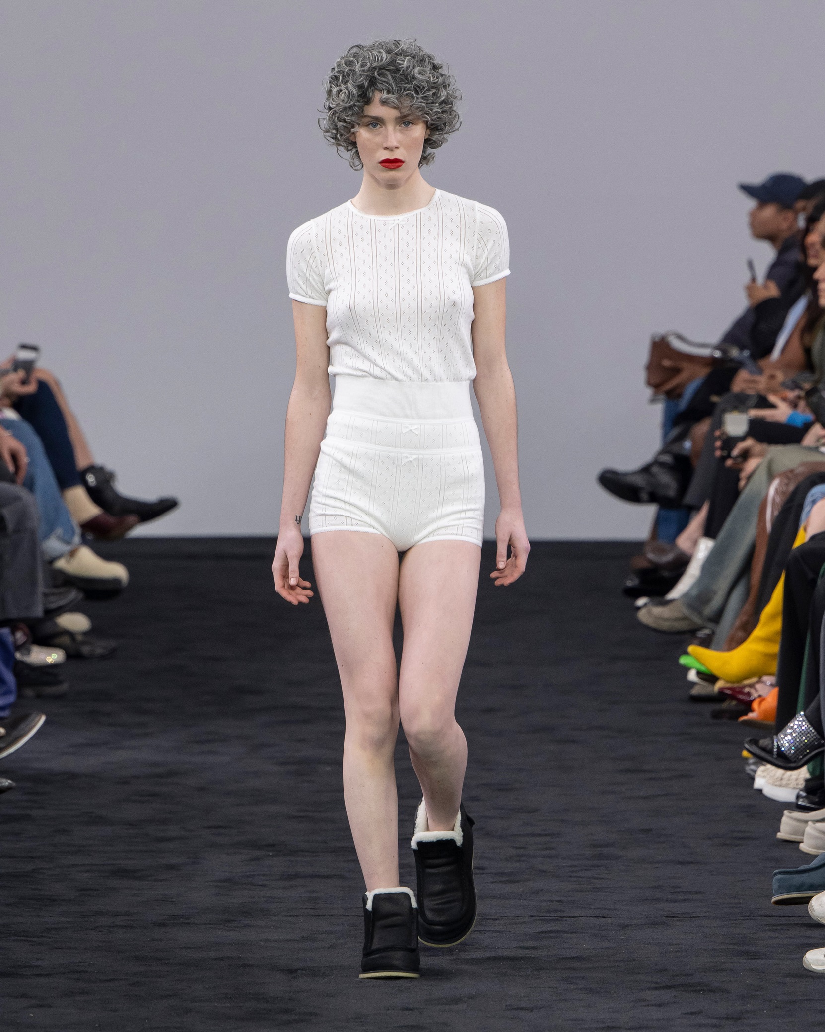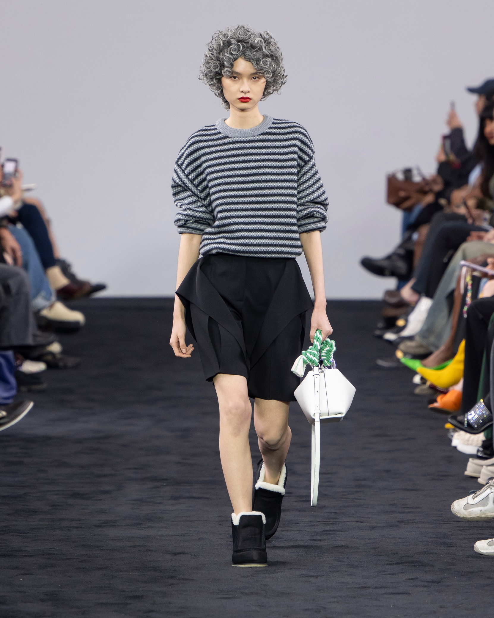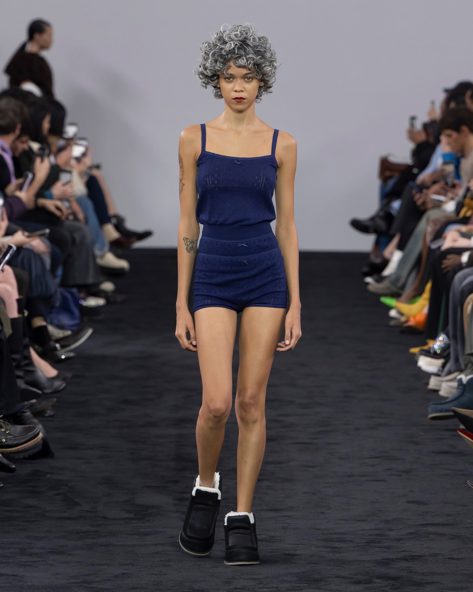 The subtle and the loud. A grey wig as a device. And flats. Housewife flats.