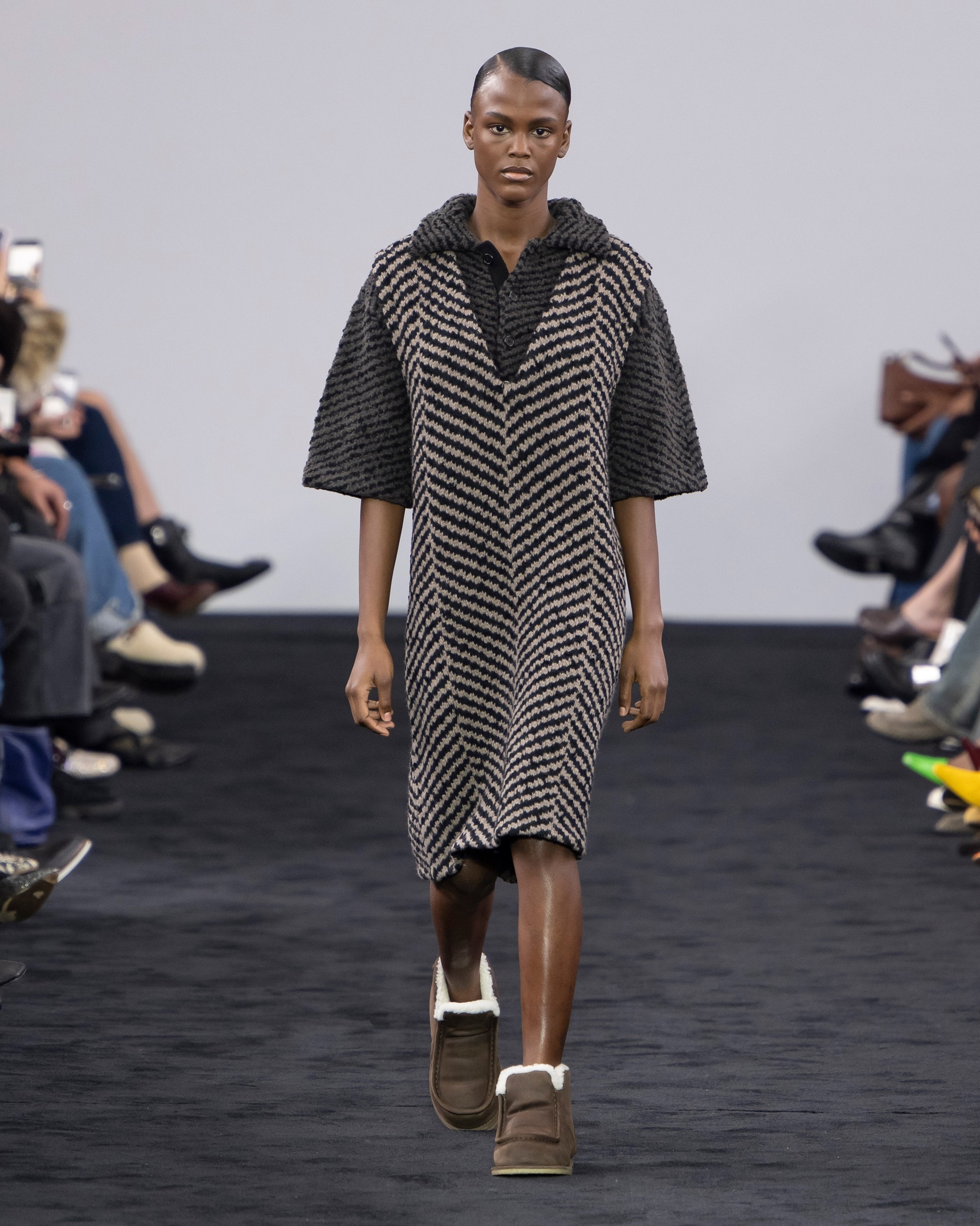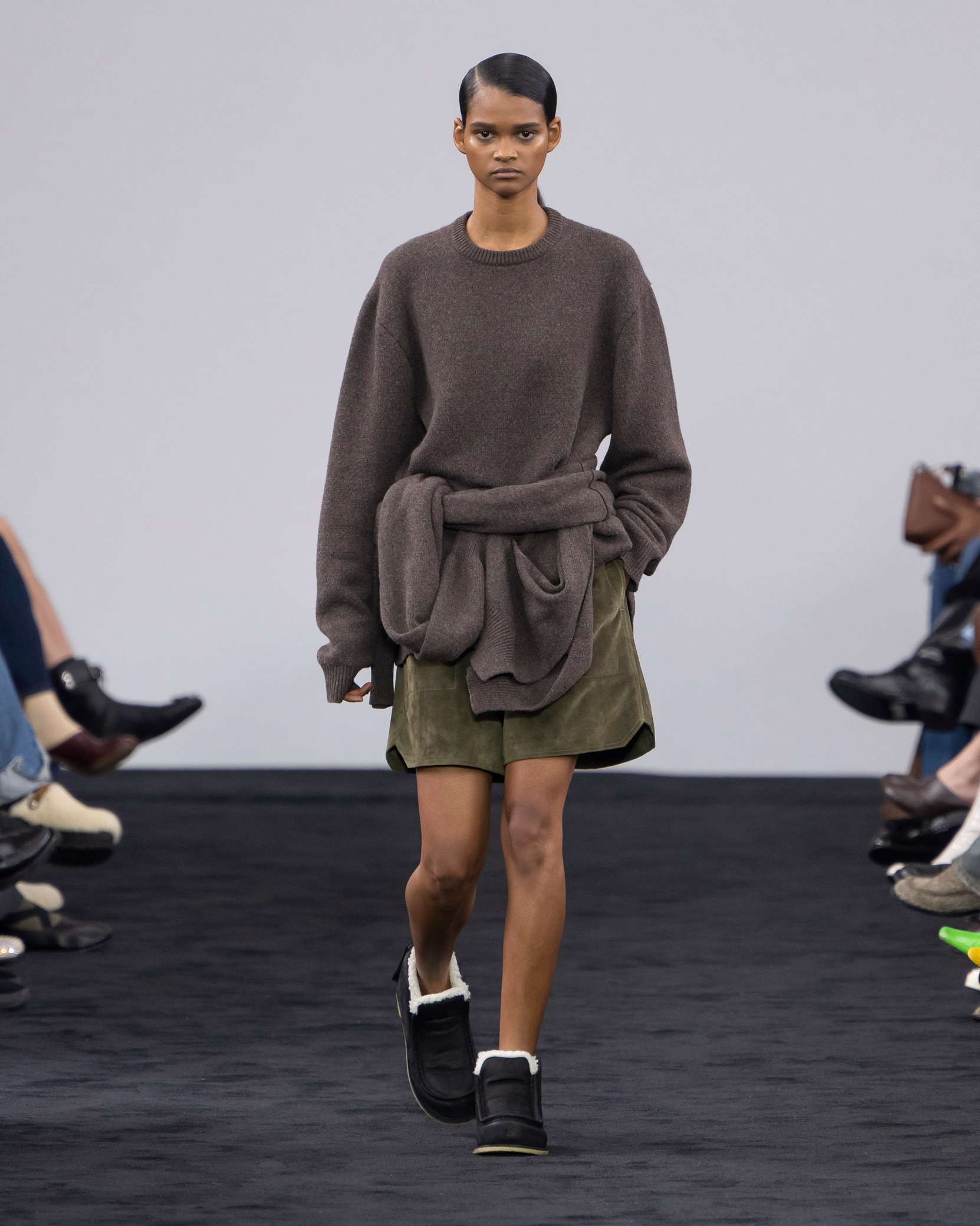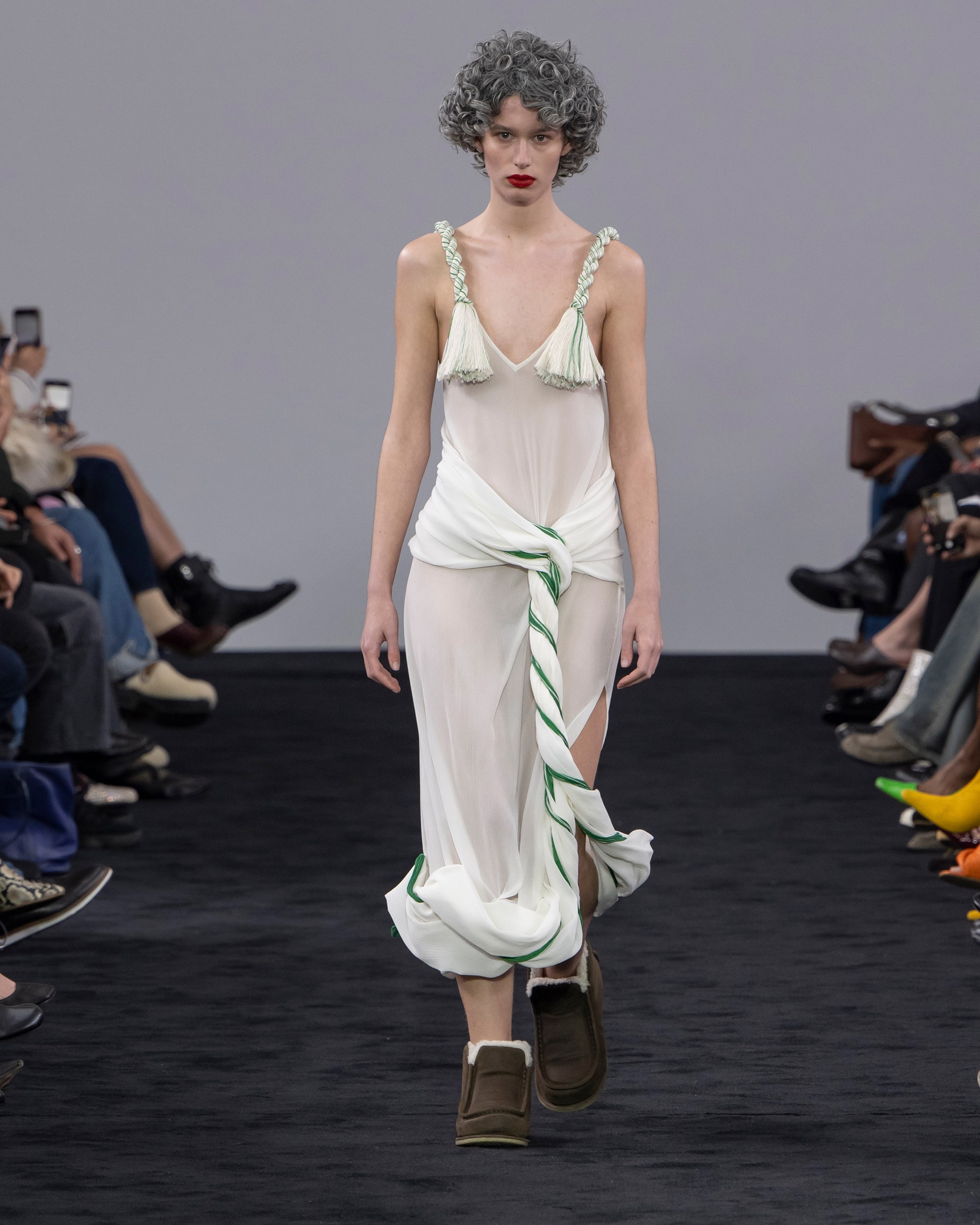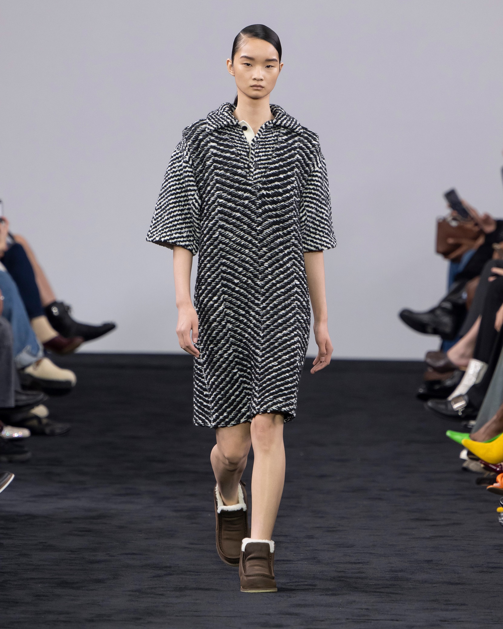 The subtle and the loud. A grey wig as a device. And flats. Housewife flats.
