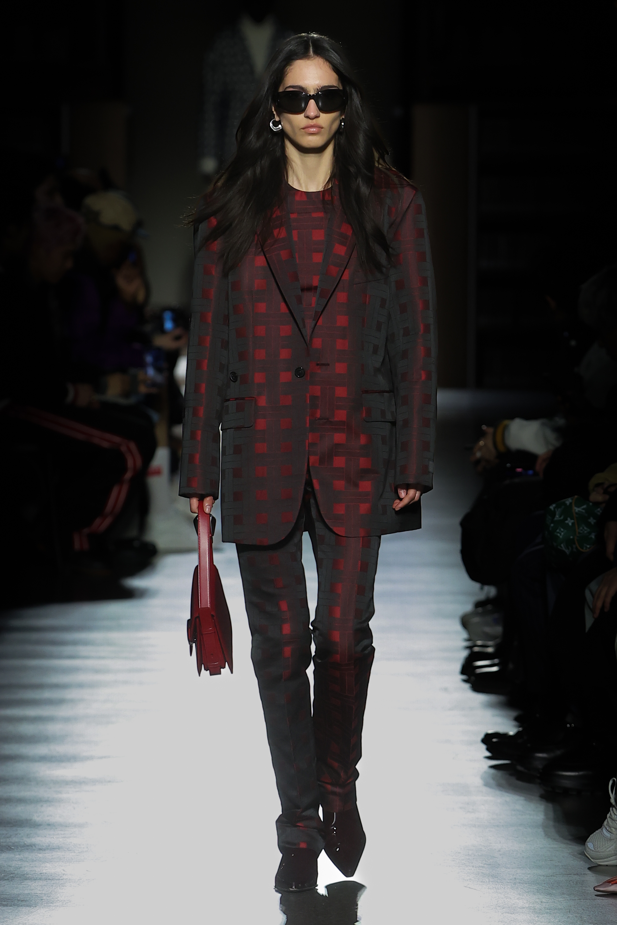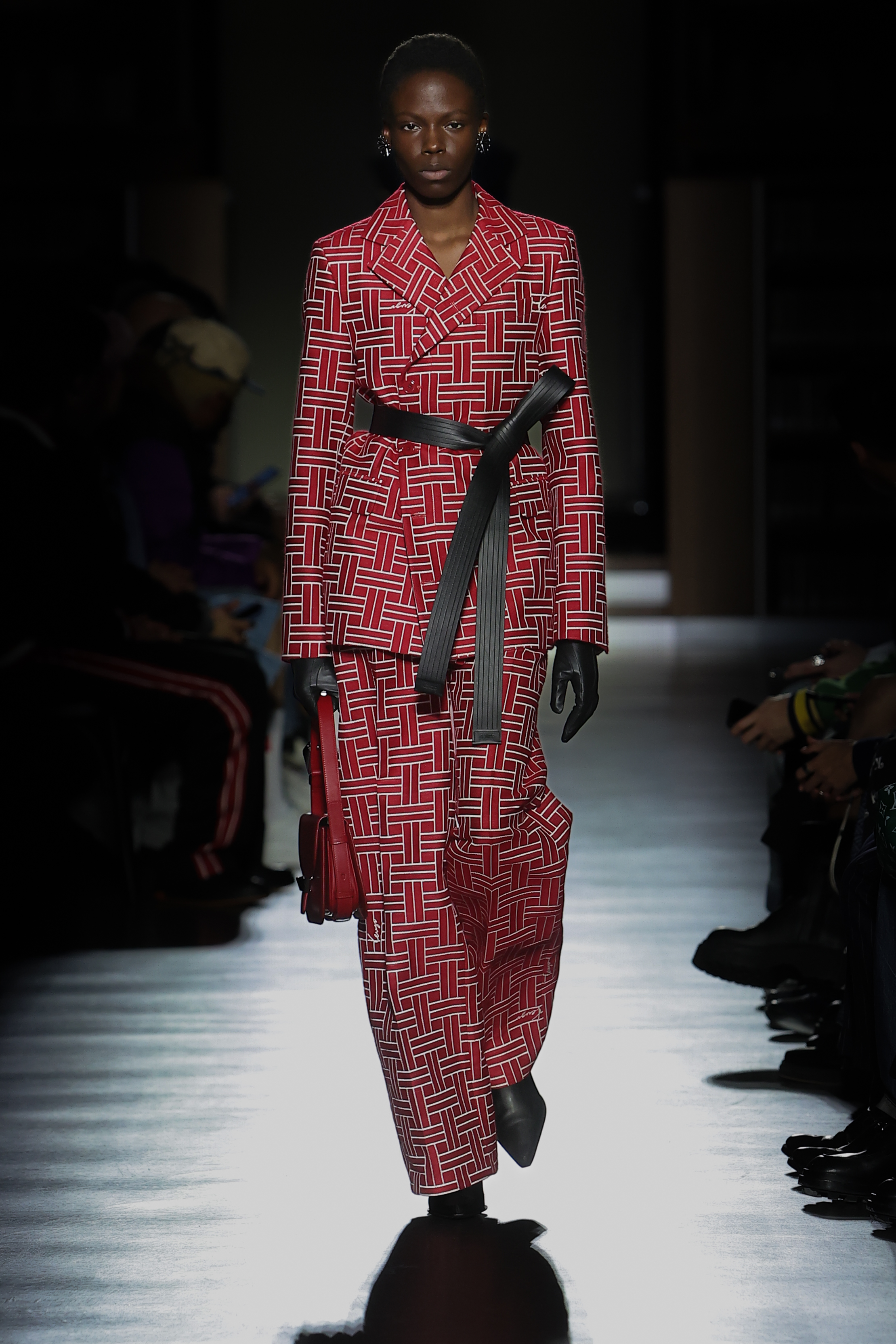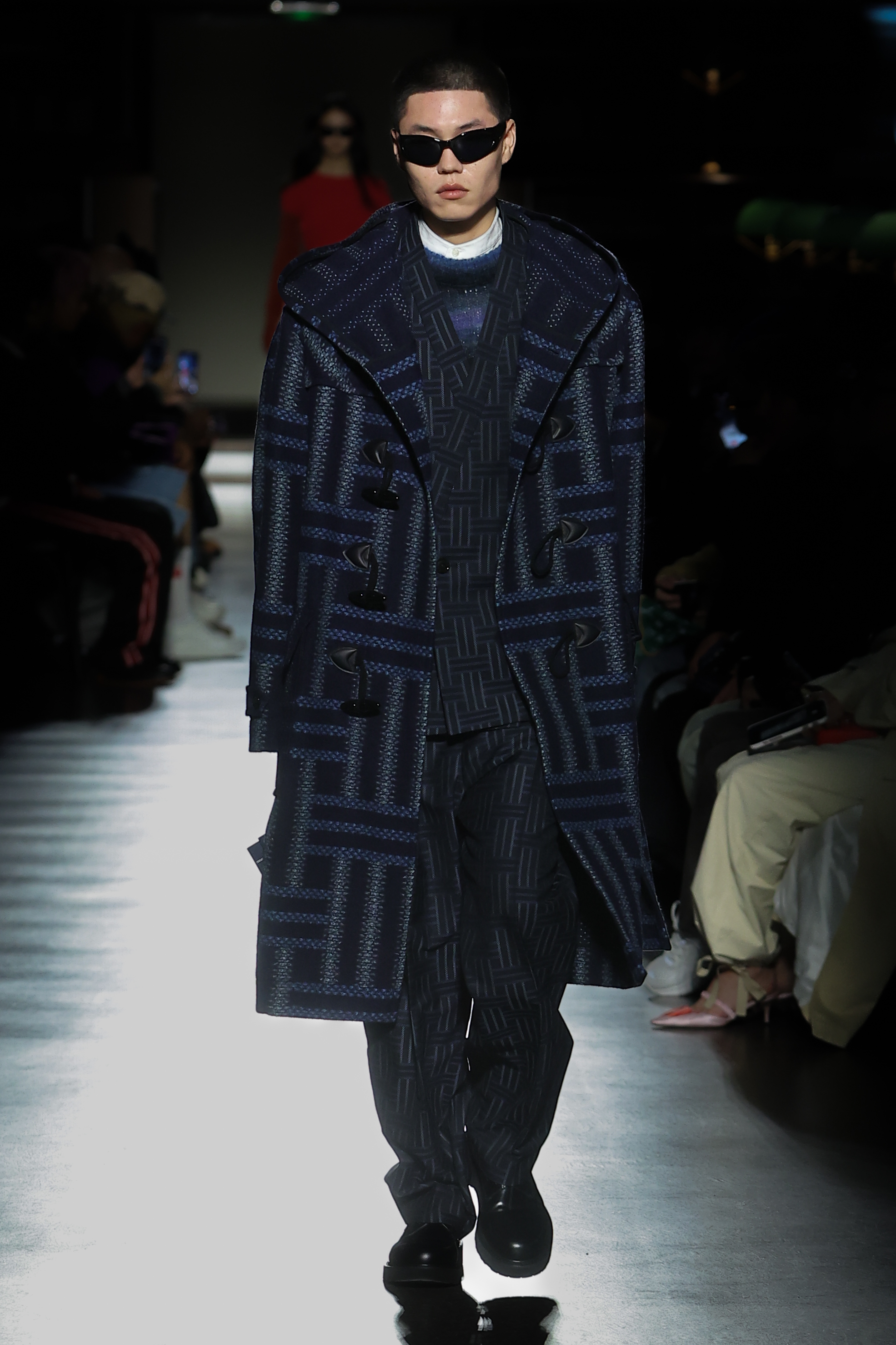 Mirroring the collection’s premise in music, Nigo pays tribute to the late musicians Ryuichi Sakamoto and Yukihiro Takahashi of the Japanese electronic band Yellow Magic Orchestra, known as YMO. In his compositions, Ryuichi Sakamoto took inspiration from Western composers such as Johann Sebastian Bach and Claude Debussy, the latter known to be influenced by Asian music himself. Red gakuran school uniforms, worn by Japanese pupils since 1873 and inspired by those of the West, serve as a salute to YMO, who adapted the suit as stage costumes. Created by the artist Cornelius, who played with YMO during their final tour, the show features an original soundtrack in homage to the band.
