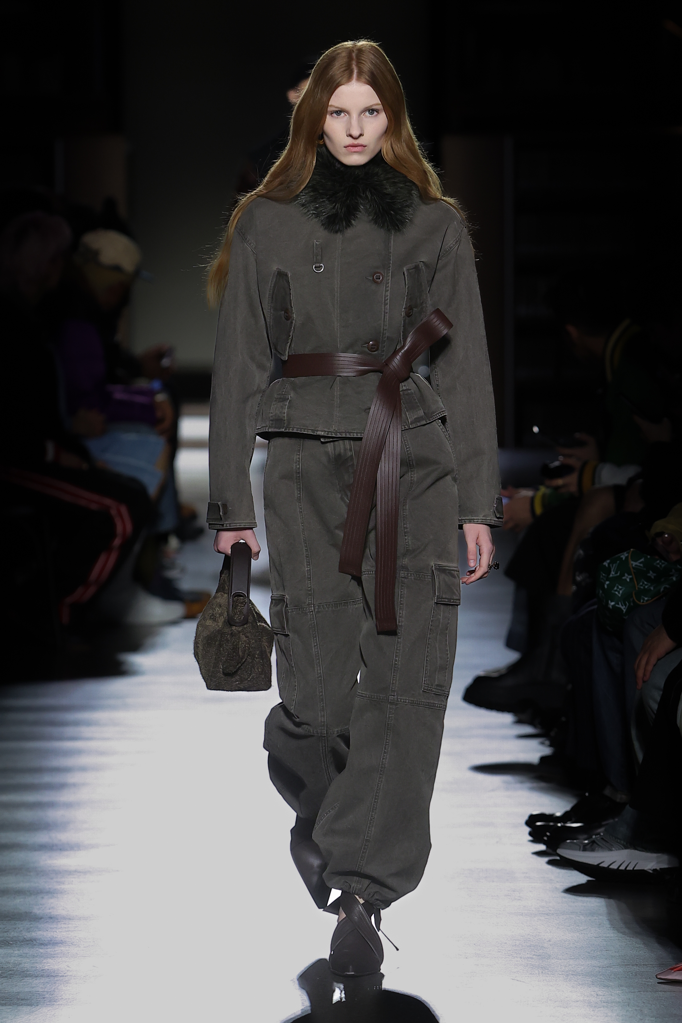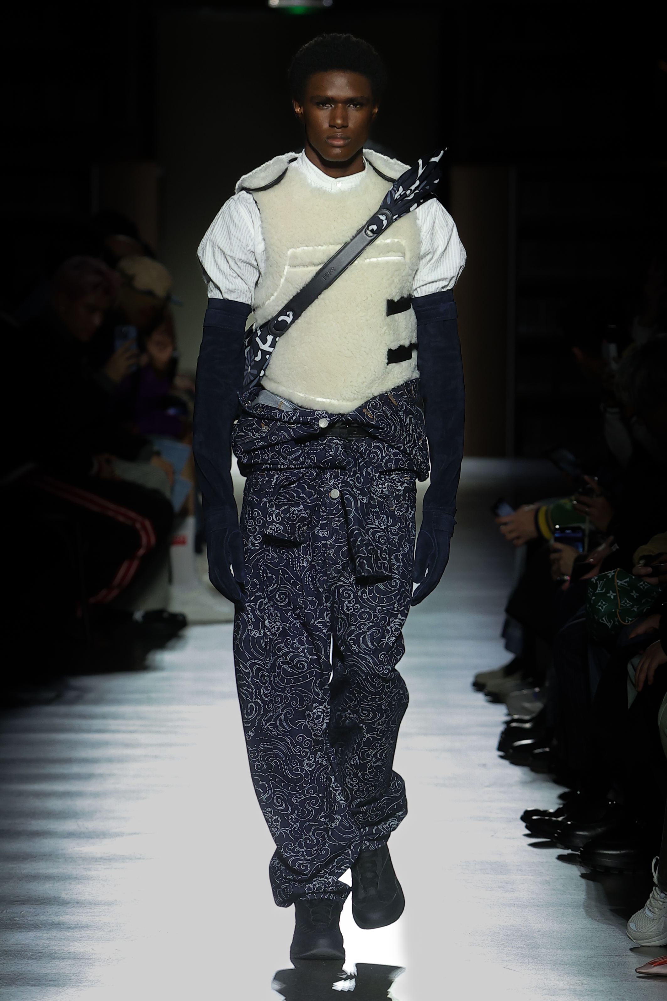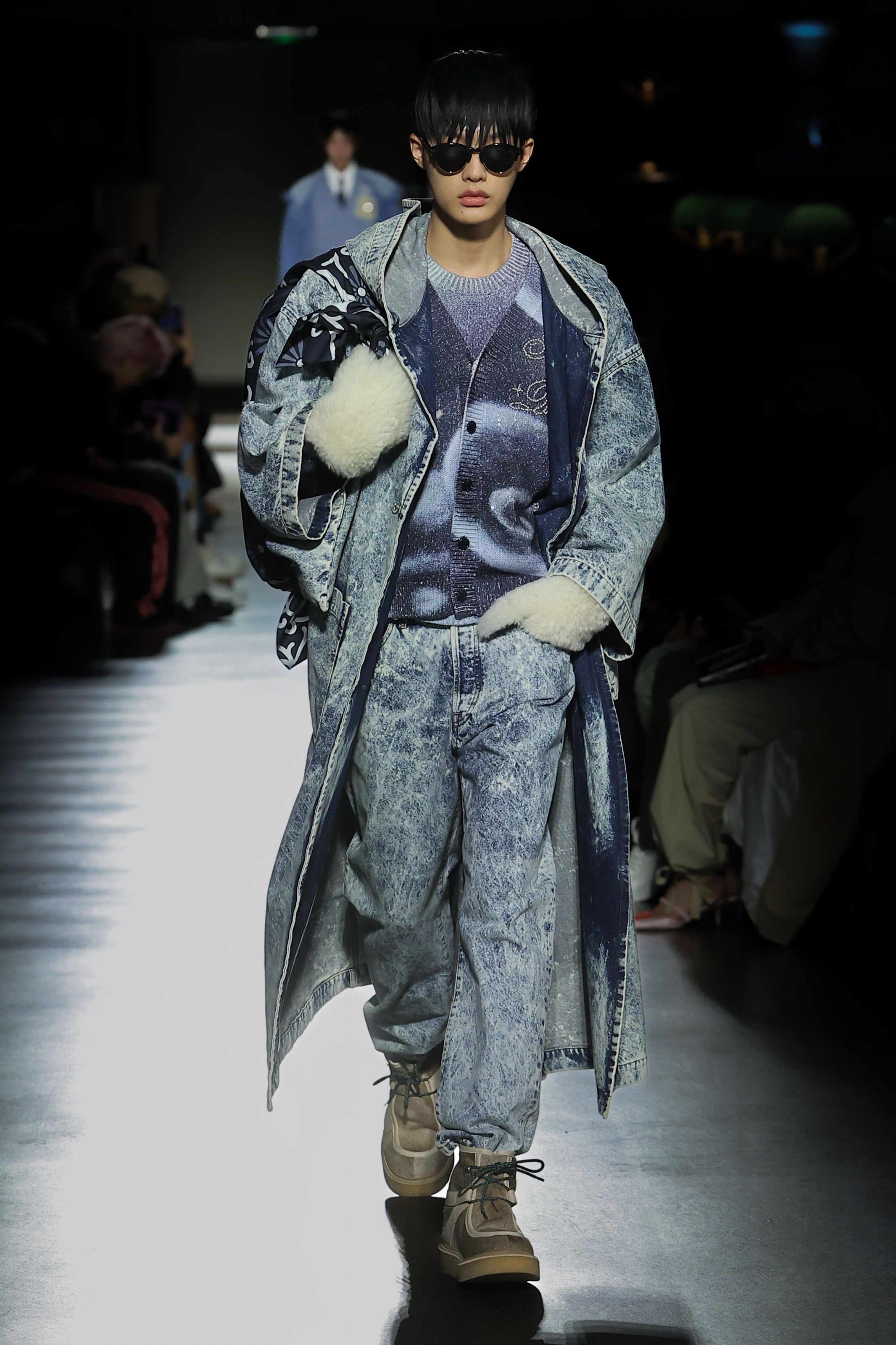 Texture takes centre stage in faux fur, three-dimensional knitting, sci-fi-esque metallics and in the jacquards that bring the collection’s motifs to life. Gakuran suits are crafted in technical wools and denim in red, black and khaki. Heavy-duty cottons materialise in cargo silhouettes, while nods to the military wardrobe take shape in shearling, leather and cotton. Denim appears in drake hues and acid washes. Kimono constructions are re-contextualised in quilted nylon, denim, and tailoring and shirting fabrics. Shiny rib jersey and velvet cement an elegant elongated women’s silhouette. Intricate knitwear incorporates beading, embroidery and metallic stitching.