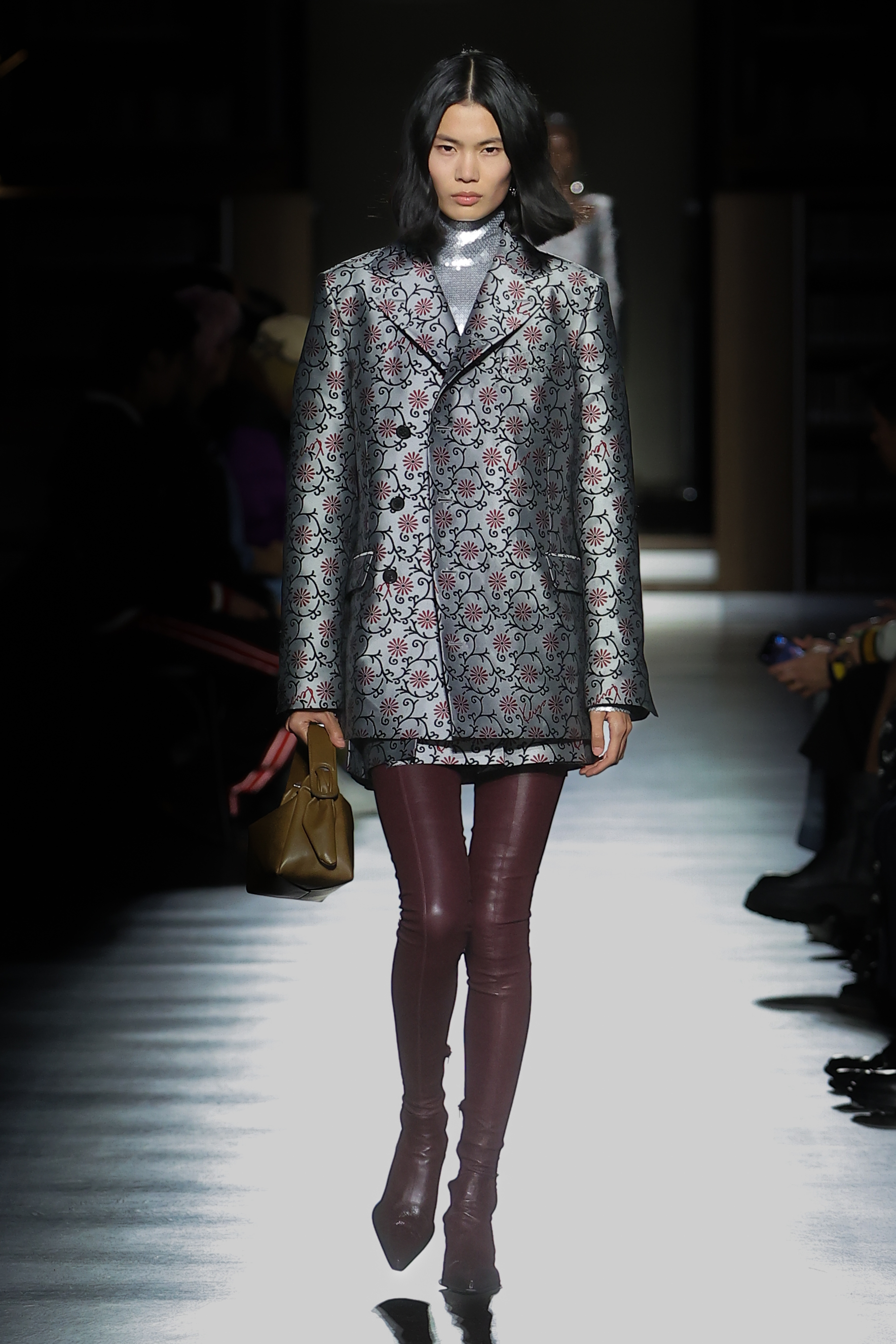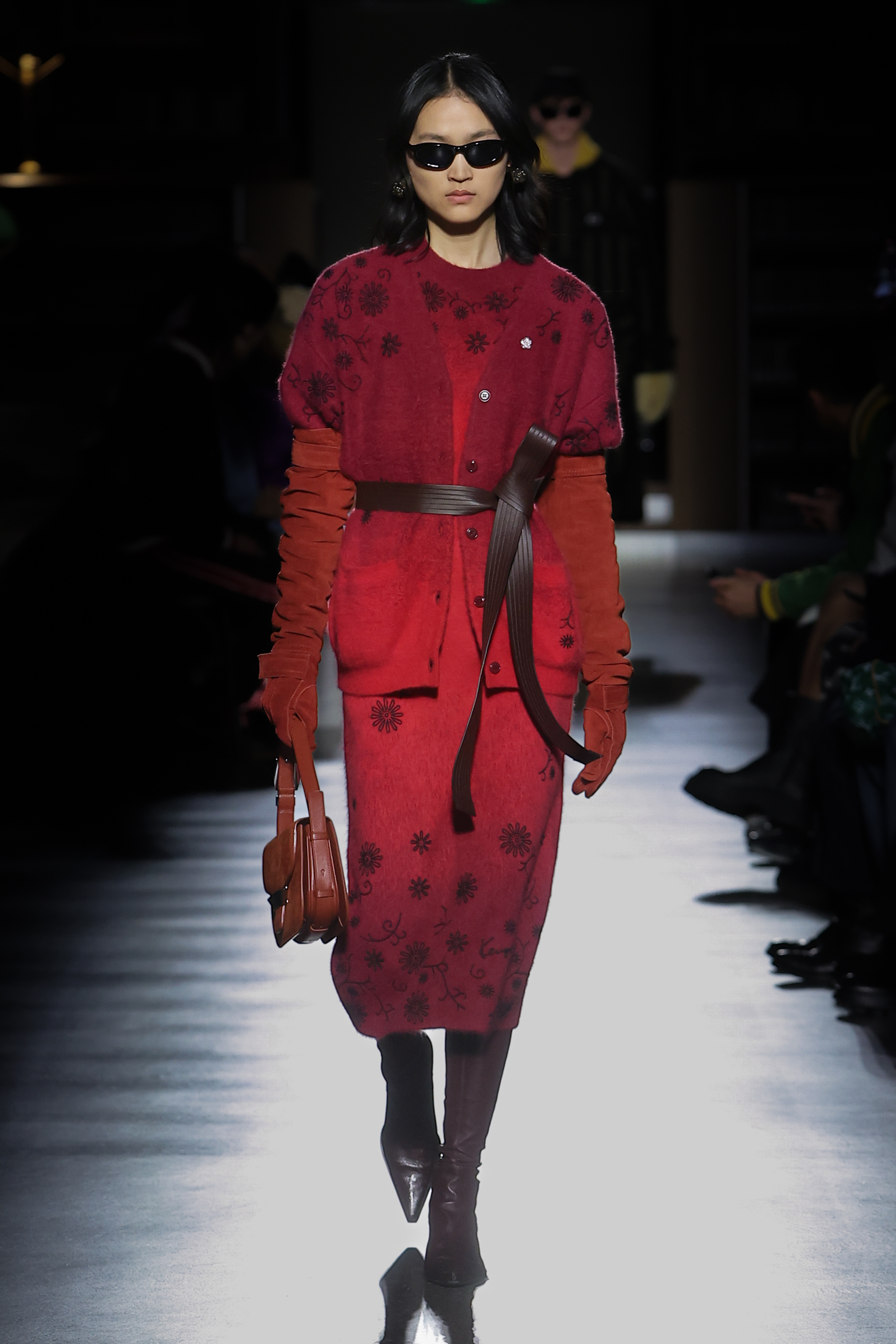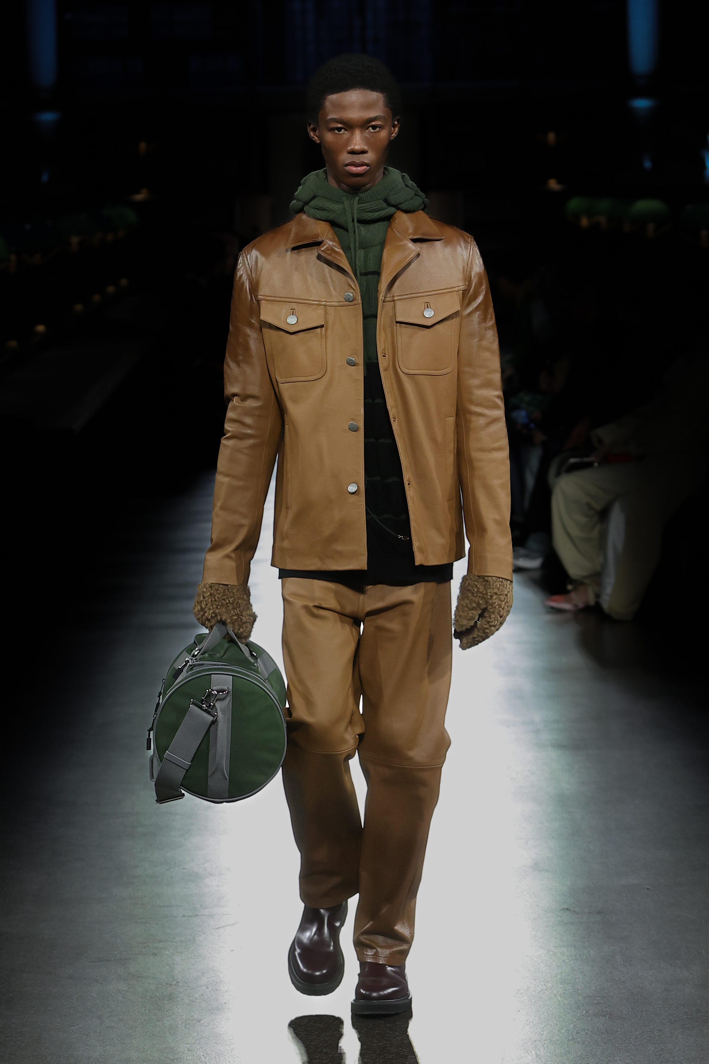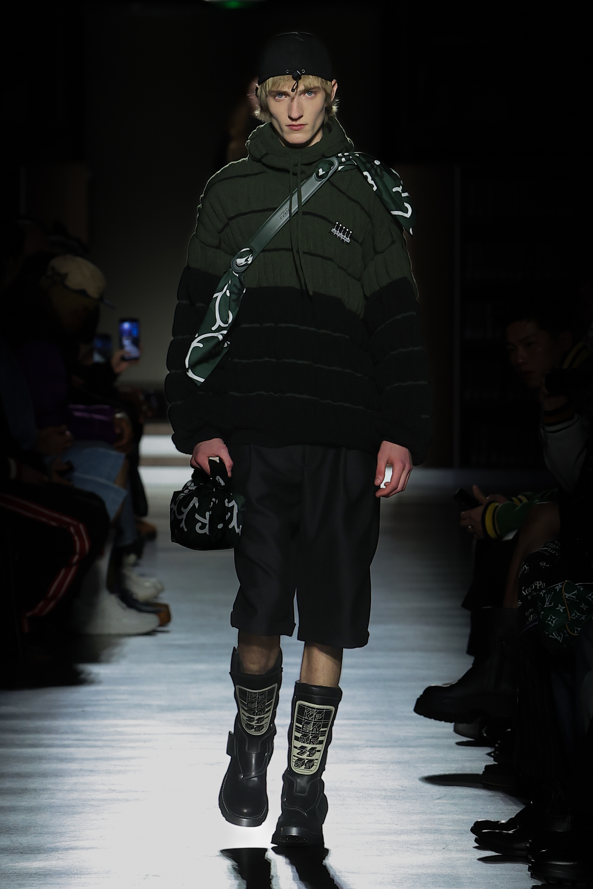 Texture takes centre stage in faux fur, three-dimensional knitting, sci-fi-esque metallics and in the jacquards that bring the collection’s motifs to life. Gakuran suits are crafted in technical wools and denim in red, black and khaki. Heavy-duty cottons materialise in cargo silhouettes, while nods to the military wardrobe take shape in shearling, leather and cotton. Denim appears in drake hues and acid washes. Kimono constructions are re-contextualised in quilted nylon, denim, and tailoring and shirting fabrics. Shiny rib jersey and velvet cement an elegant elongated women’s silhouette. Intricate knitwear incorporates beading, embroidery and metallic stitching.