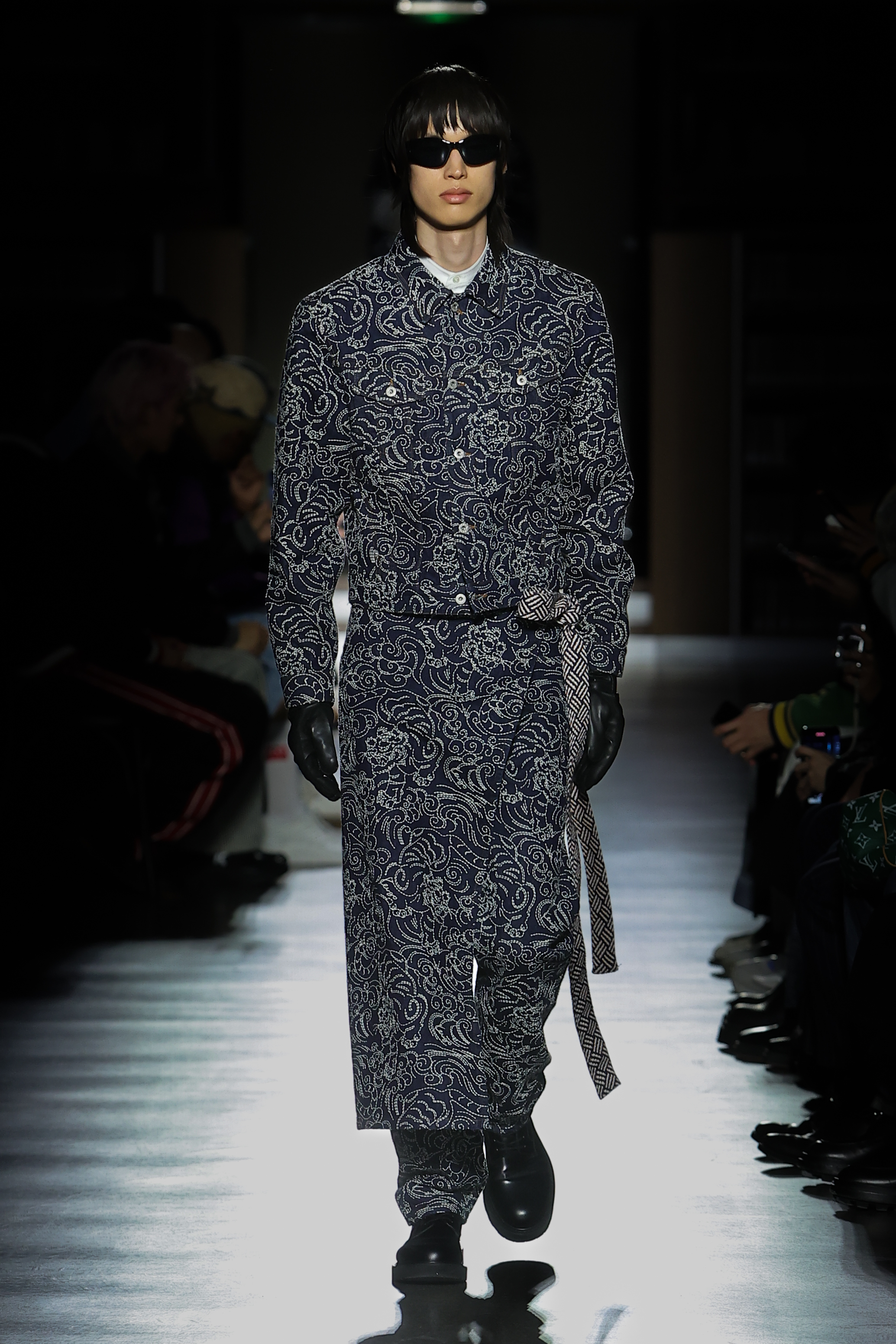 As a memory of his early years at school, Nigo embellishes garments with the charm and letter chains used by Japanese pupils to customise their gakuran uniforms, which traditionally come with detachable buttons. Metal jewellery further appears forged in the emblems and graphics of the collection. Judo belts feature throughout, worn as waist belts for an elegant nipped-in silhouette. Long gloves pay homage to the language of sci-fi.