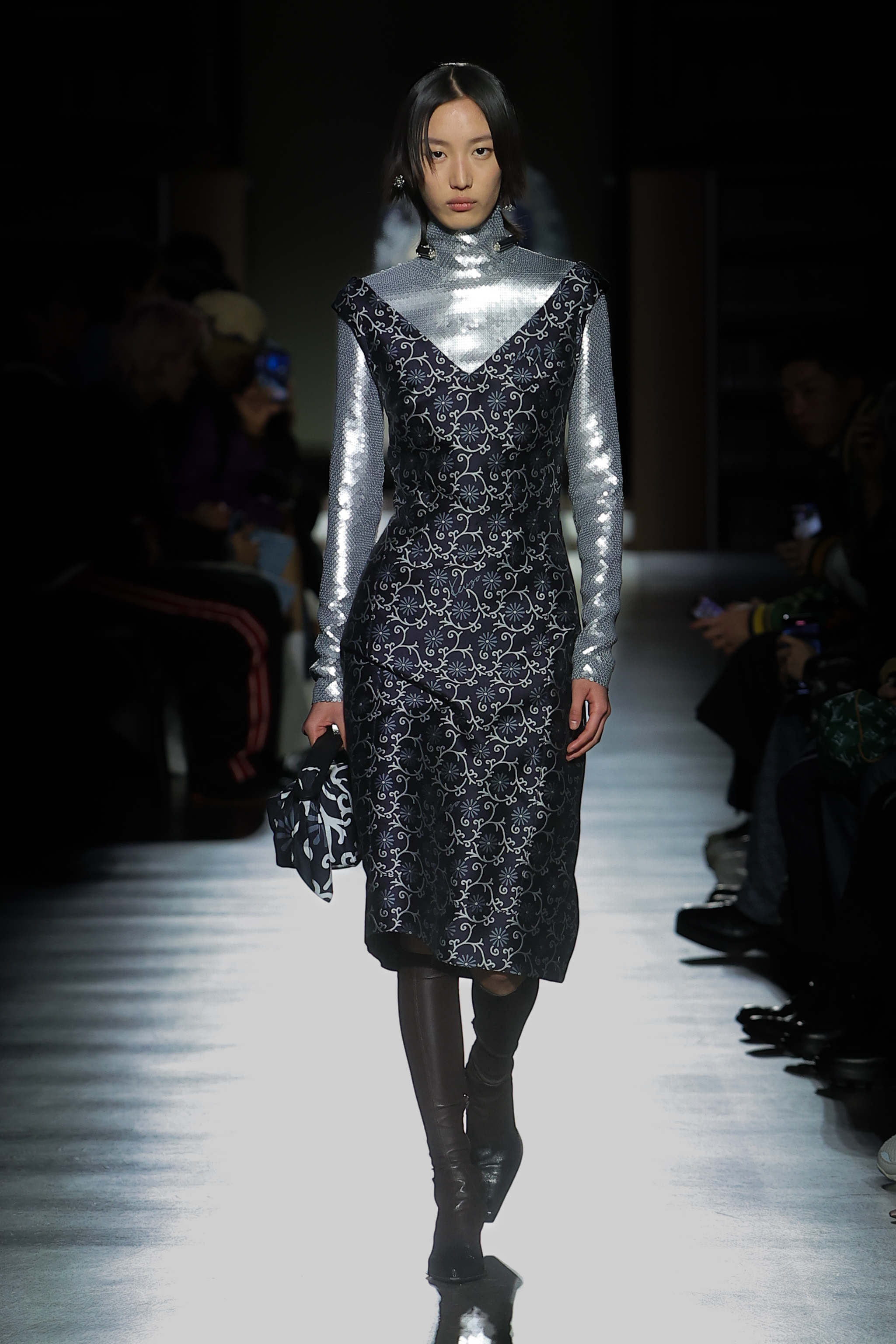 The exploration unfolds in details and silhouettes rooted in Japanese tradition but infused with the associations of sci-fi-related uniforms: a kimono coat imbued with the lines of a warrior cape, a weave inspired by the wood print of a Japanese hakeshi baten fireman’s jacket evoking an ancient-future graphic, or a plissé dress draped like the cloak of a space fiction heroine. A miniature dot pattern informed by the Edo Komon of fifteenth-century kimonos re-manifests as a star constellation in prints and embroideries. Throughout, nods to the Western utility and military wardrobes materialise in flight jackets, cargo suits and shearling jackets, elusively embedded with the codes of another universe.