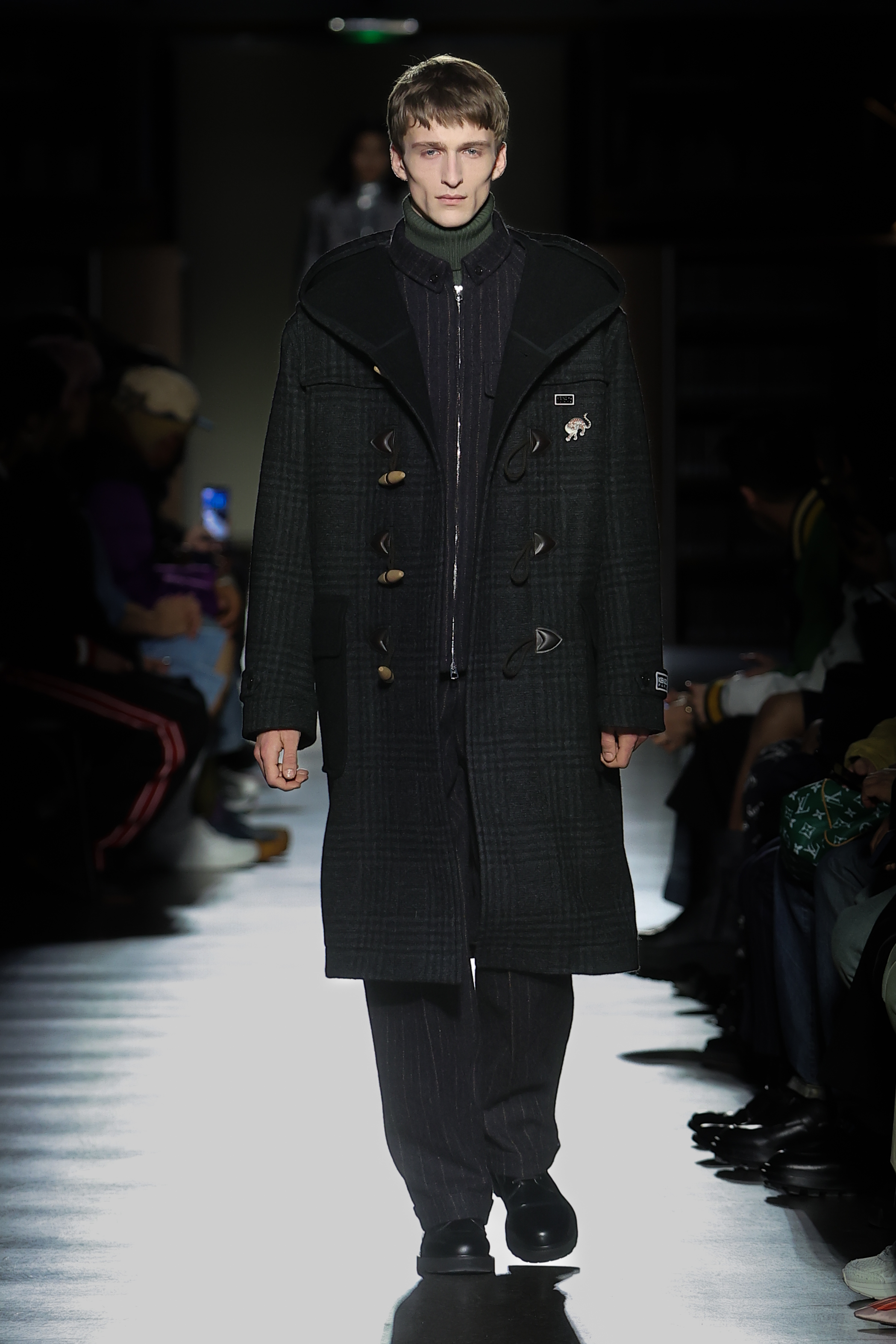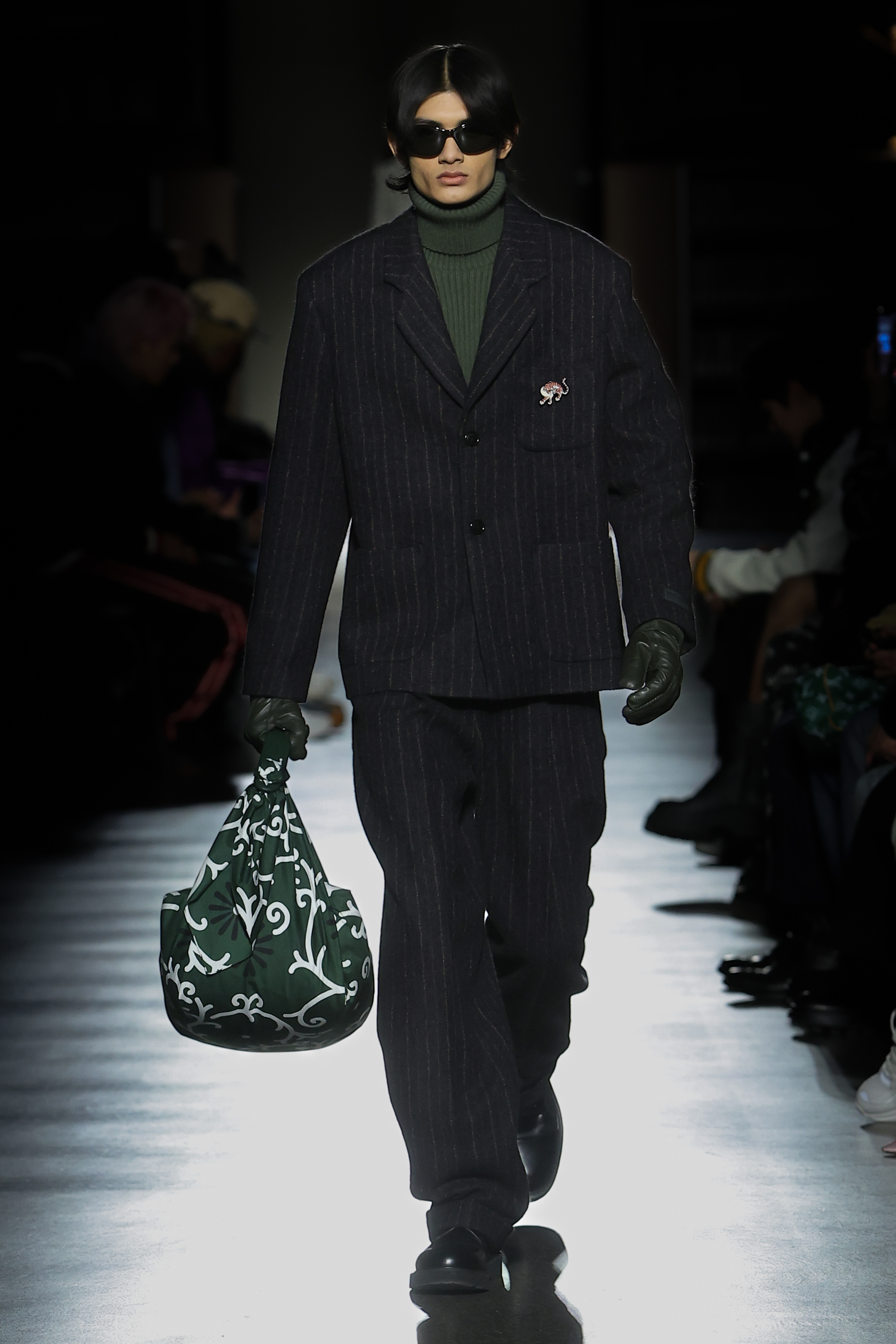 KENZO Weave patterns influenced by those of Japanese hakeshi baten fireman’s jackets appear in interpretations across nylon, jacquards and denim. Inspired by karakusa – an ancient pattern native to Central Asia by way of China and traditionally used on Japanese furoshiki wrapping cloth, a KENZO Marguerite motif features in print and beaded forms. The Star Tiger is borne out the Edo Komon miniature dots of fifteenth-century kimonos and materialises as beading or sashiko embroidery. The graphic is echoed in KENZO Constellation and Boke Constellation logos inspired by archival imagery employed in lurex embroideries and silver-foil prints. A Cloud Tiger emblem appears in fleece jacquard and rubber prints. Informed by Japanese lattice prints, the Bamboo Tiger pattern manifests in jacquards. As a tribute to YMO, a KENZO Business ideogram of five briefcase-carrying men draws inspiration from the band’s merchandise.