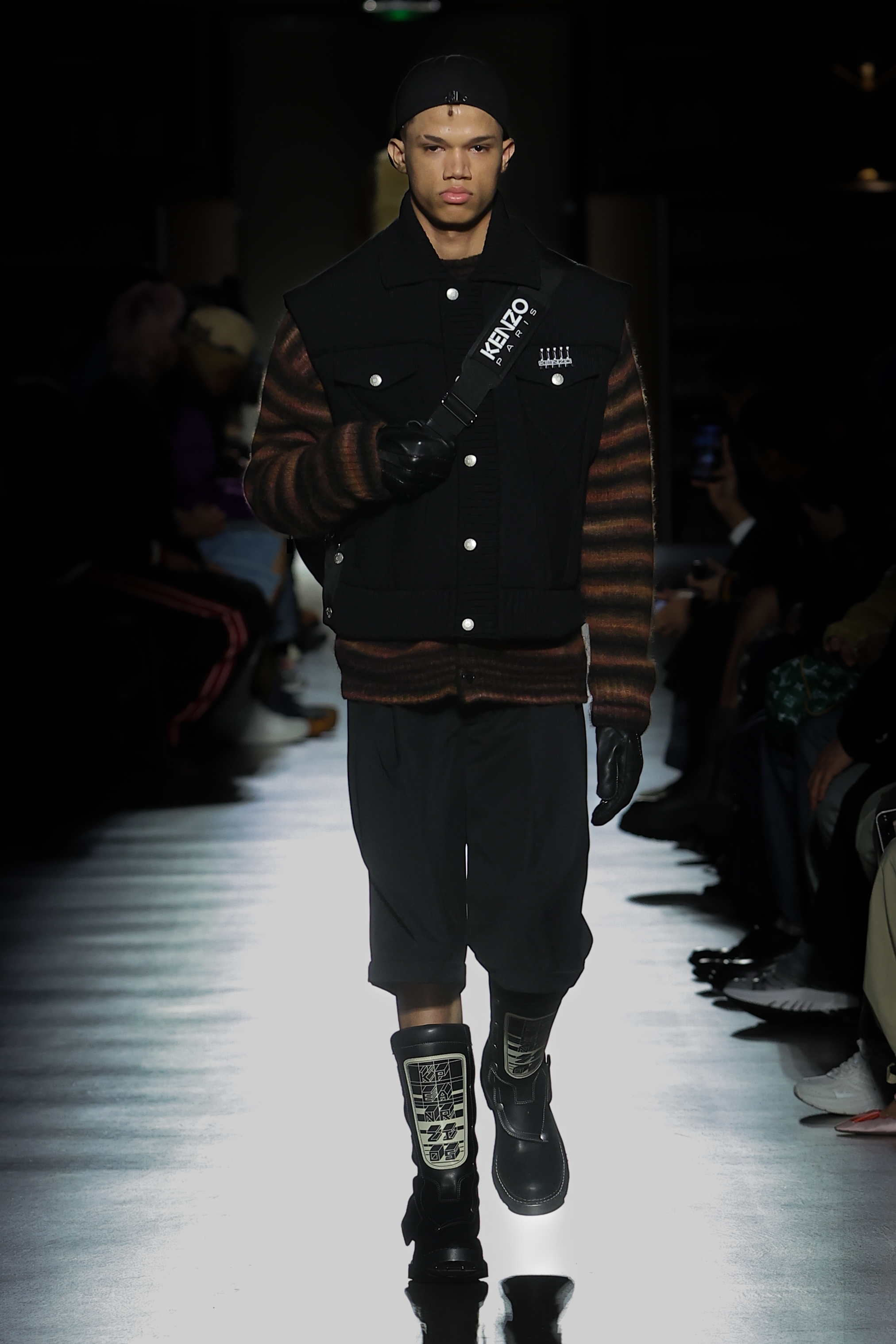 The collection introduces a new genderless sneaker founded in 1990s’ the skate codes and infused with an air of futurism. Constructed with a mesh-wrapped midsole, it is proposed in leather, suede or neoprene. City shoes take form in the KENZO Biker, a futuristic biker boot inspired by motocross, in the KENZO Yuki, an winter ankle boot in spotted ponyskin, and the KENZO Ukio, a minimal lightweight boot set on sneaker sole. Imbued with a 1970s’ space sensibility, the KENZO Reia is a sharp-toed triangular kitten heel interpreted as fitted thigh-high suede boots, leather mules and stretch-fabric boots.