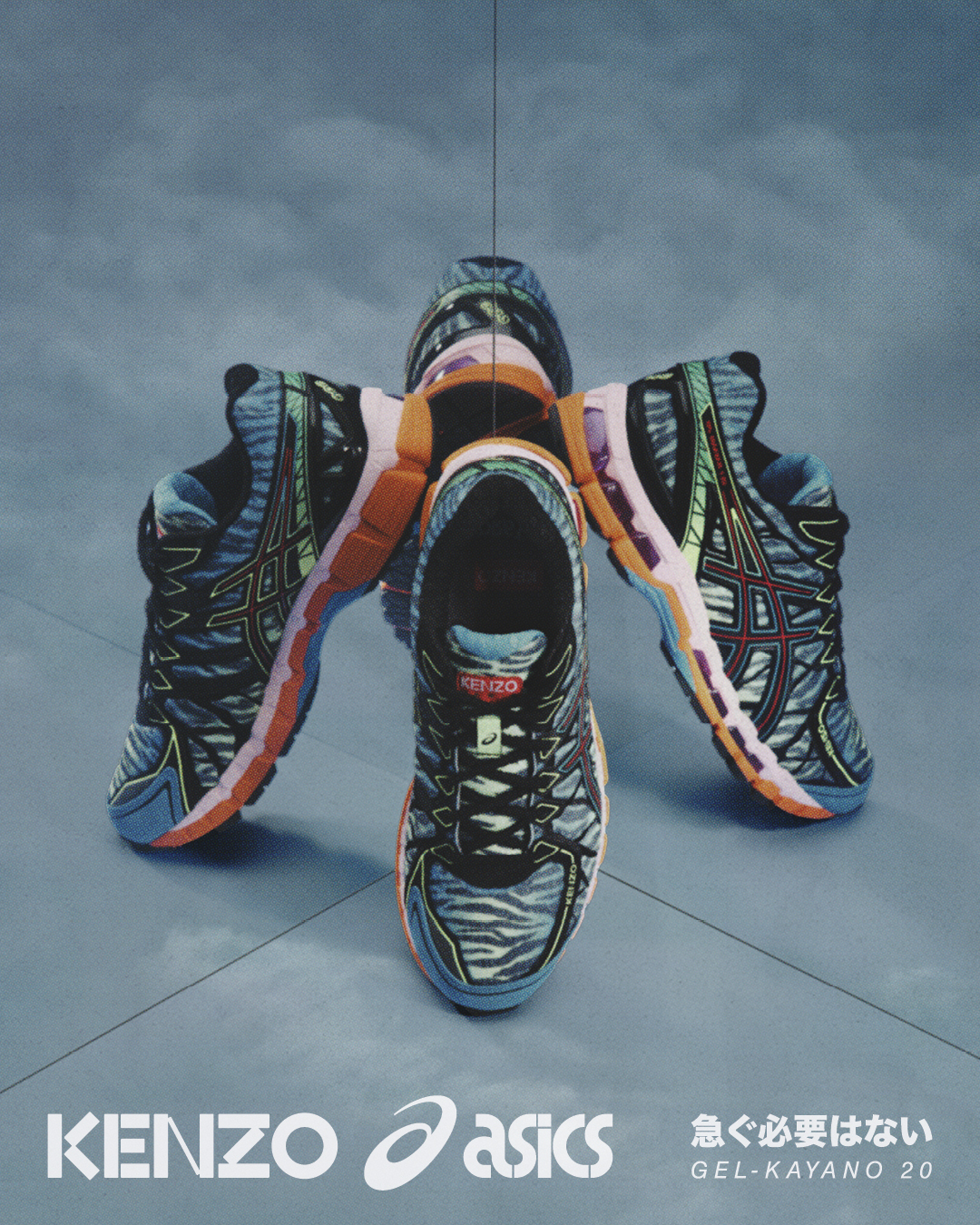A system of a two-layer midsole and outsole that features EVA, TPU, GEL technology and rubber guarantees optimal dampening for the foot, whether on the running track or on the city street. Design-wise, on two styles the functional cage of the GEL-KAYANO 20 is inspired by KENZO’s tiger graphics, both with faux-fur applied on the all-upper surface. One style is declined in an array of blue, lime green and orange. Another style is reminiscent of the sober silver, gold and white colorway of the original GEL-Kayano shoe. The third and last style showcases fresh, vivid colors such as blue, green, pink, yellow and orange, all contrasted by sporty white. In all iterations, the ASICS label appears on the right tongue of the pair, while the KENZO logo is featured on the left one. Co-branded special packaging rounds out the visual offer.
